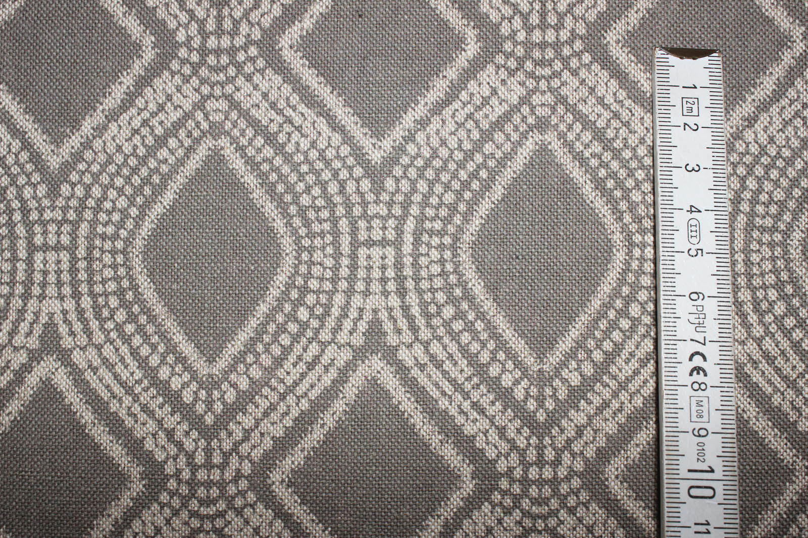 Ein wunderschöner, etwas festerer Dekostoff im Leinen Look mit einem grafischen Muster in grau. Der Untergrund ist natur. Super geeignet für Taschen, Kissen, Tischläufer, Deko etc. Die Artikel auf dem sechsten Foto gehören nicht zu diesem Angebot, sondern sollen der Inspiration dienen.