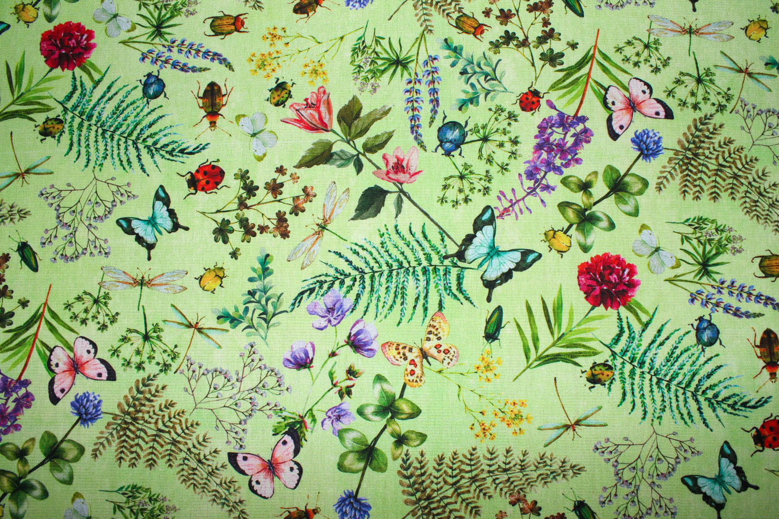 Hochwertiger Digitalprint-Dekostoff Dralon Outdoor mit Wiesenblumen, Schmetterlingen und Käfern. Er verfügt über eine wasserabweisende Teflon- Ausrüstung. Der Stoff ist prima geeignet für Taschen, Geldbörsen, Utensilos, Kissen uvm. Er ist von der Struktur her im Vergleich zu Popeline etwas grober und fester.