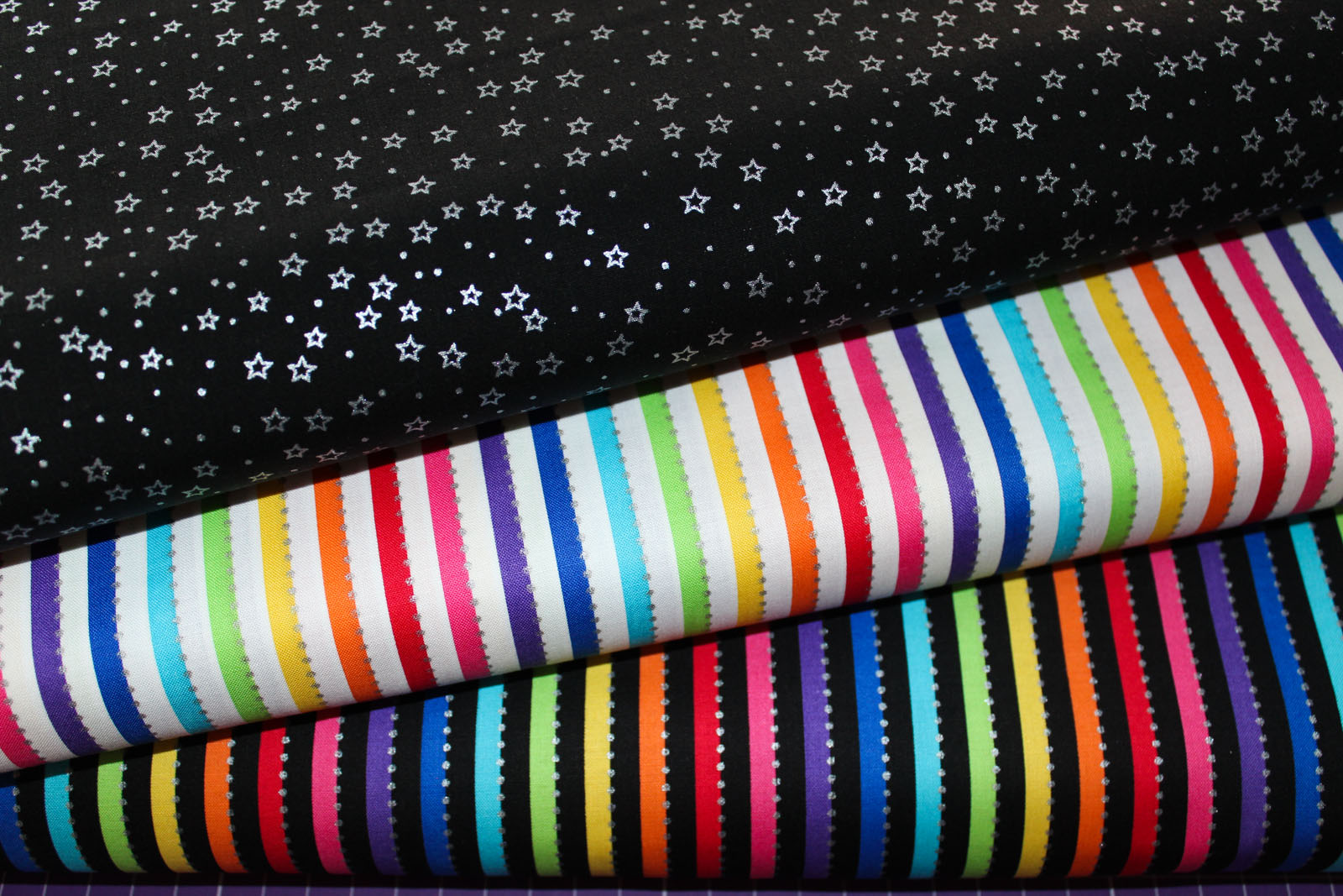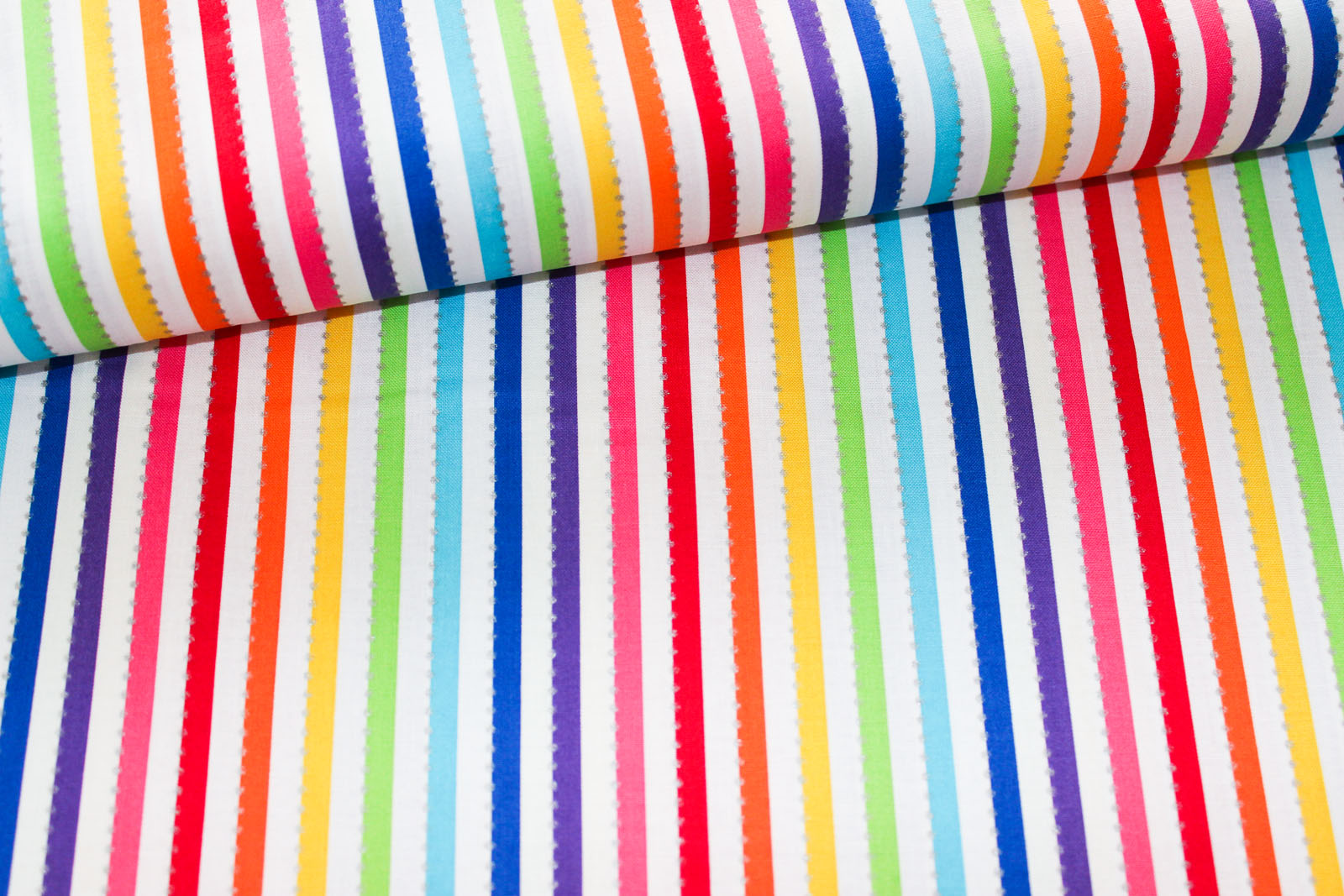 Wunderschöner hochwertiger Designer- Baumwollwebstoff "Be Colourful" White Rainbow aus dem Hause Anthologie designed by Jaqueline de Jonge. Längsgetreifte Regenbogenstreifen auf weißem Untergrund mit mit silbermetallicfarbenen Punkten. Prima geeignet für farbenfohe Kissen, Täschchen, Taschen, Patchworkprojekte uvm. Weitere Stoffe und Designbeispiele auf Fotos 3ff. gehören nicht zu diesem Angebot, sondern dienen der Inspiration.