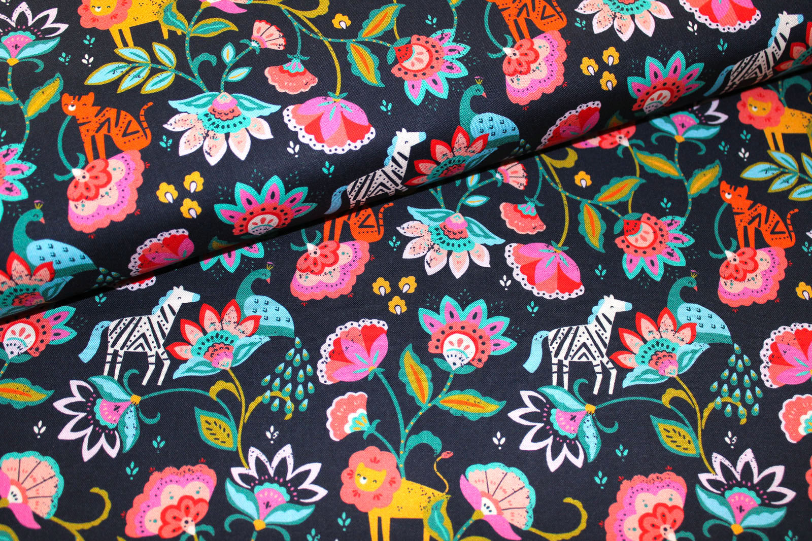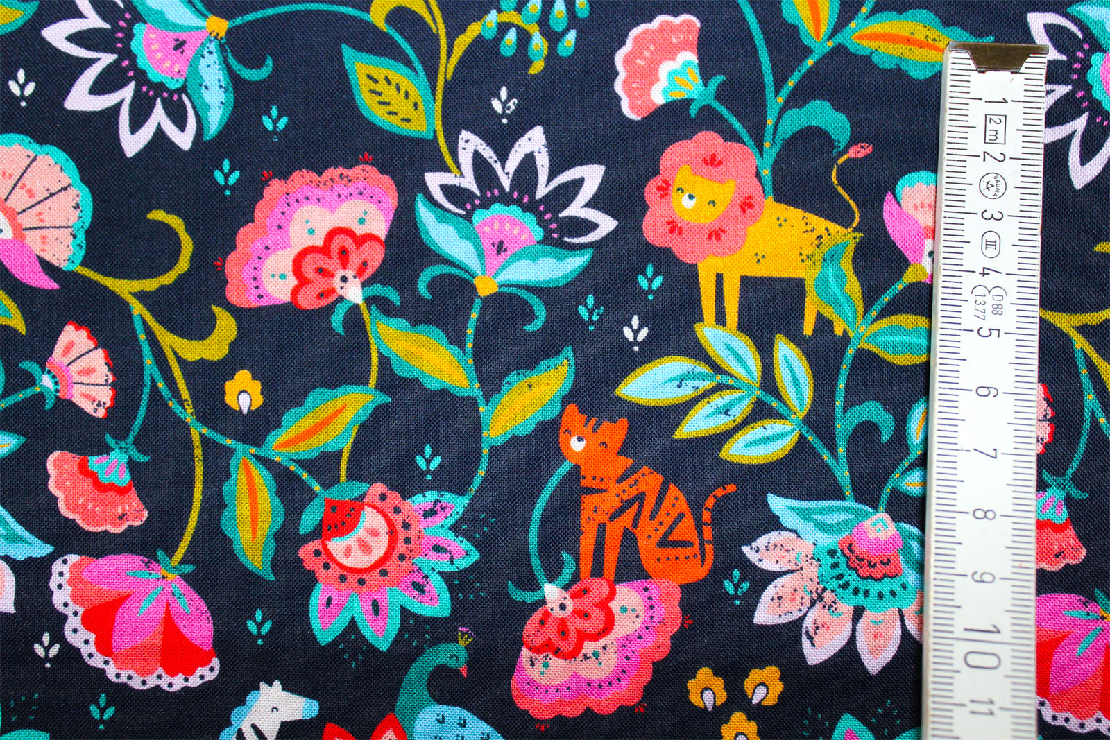 Entdecken Sie unseren bezaubernden Designer-Baumwollwebstoff aus der Serie "Indian Summer" von Dashwood Studio, entworfen von Nina Ghataora. Der dunkelblaue Untergrund des Stoffes wird durch Blumen, Blätter und verspielte Tiere zum Leben erweckt. Dieser Stoff eignet sich perfekt für die Herstellung von Taschen, Geldbörsen, Kissen und vielen anderen Accessoires.