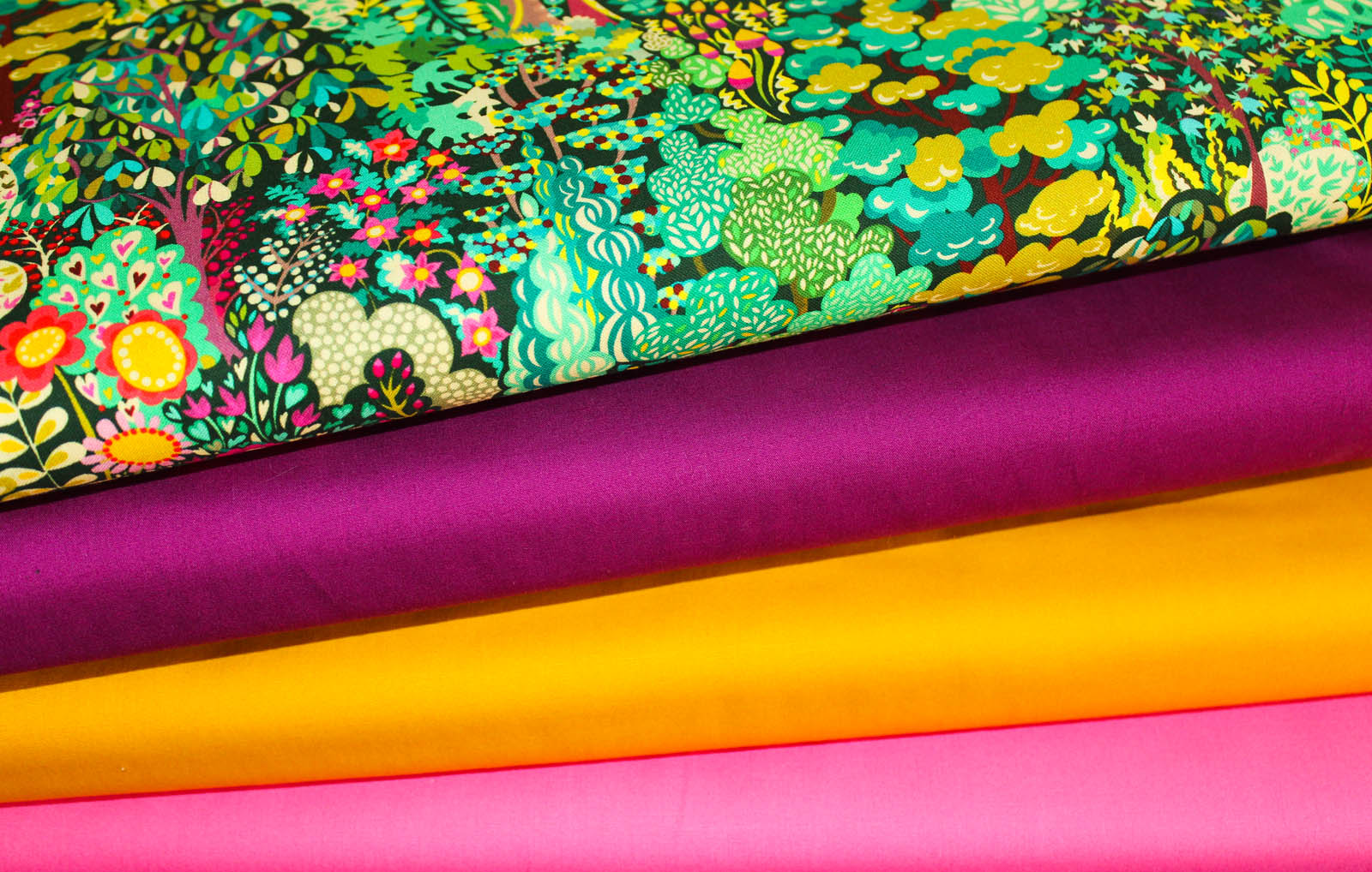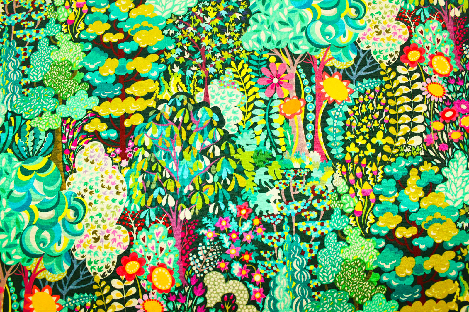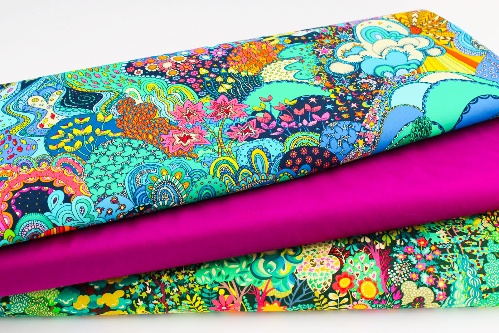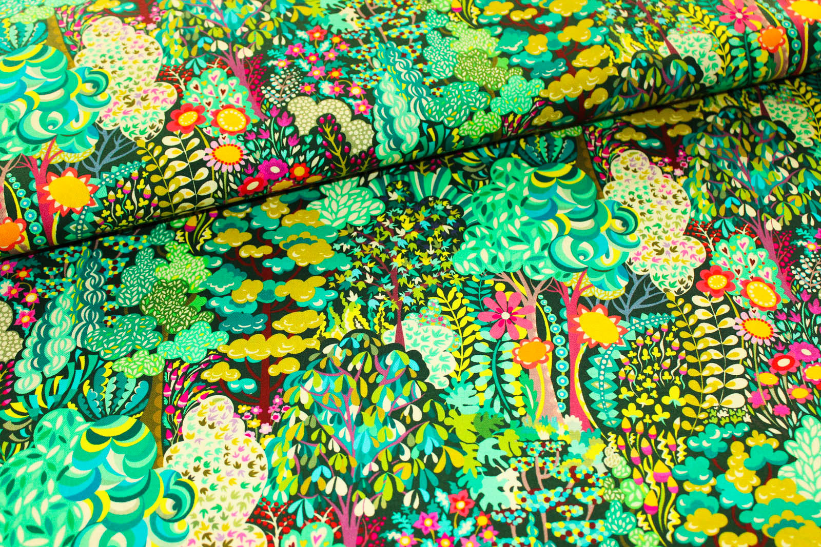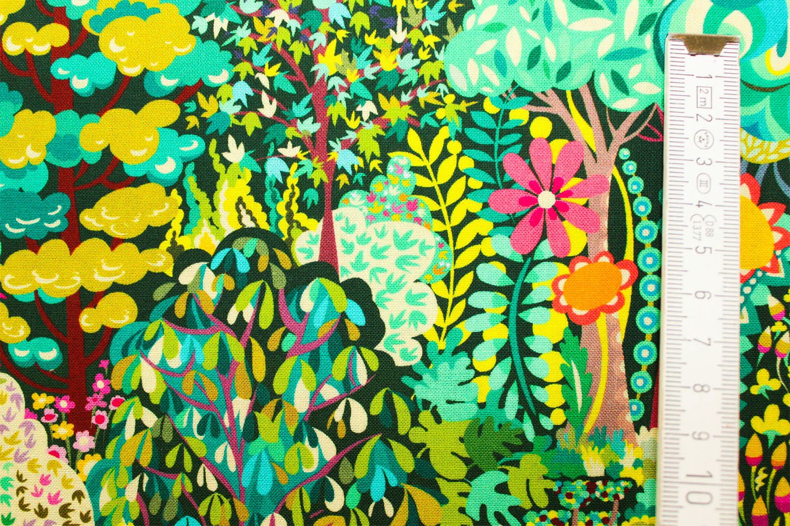 Ausgefallener hochwertiger Designer- Baumwollwebstoff "AVALON" aus der Paradiso Kollektion designed by Sally Kelley. Der Untergrund ist dunkelgrün. Prima geeignet für Kosmetiktaschen, Kissen, Täschchen, Taschen, Patchworkprojekte uvm. Die anderen Stoffe auf weiteren Fotos gehören nicht zum Angebot, sondern diese sollen der Inspiration dienen.