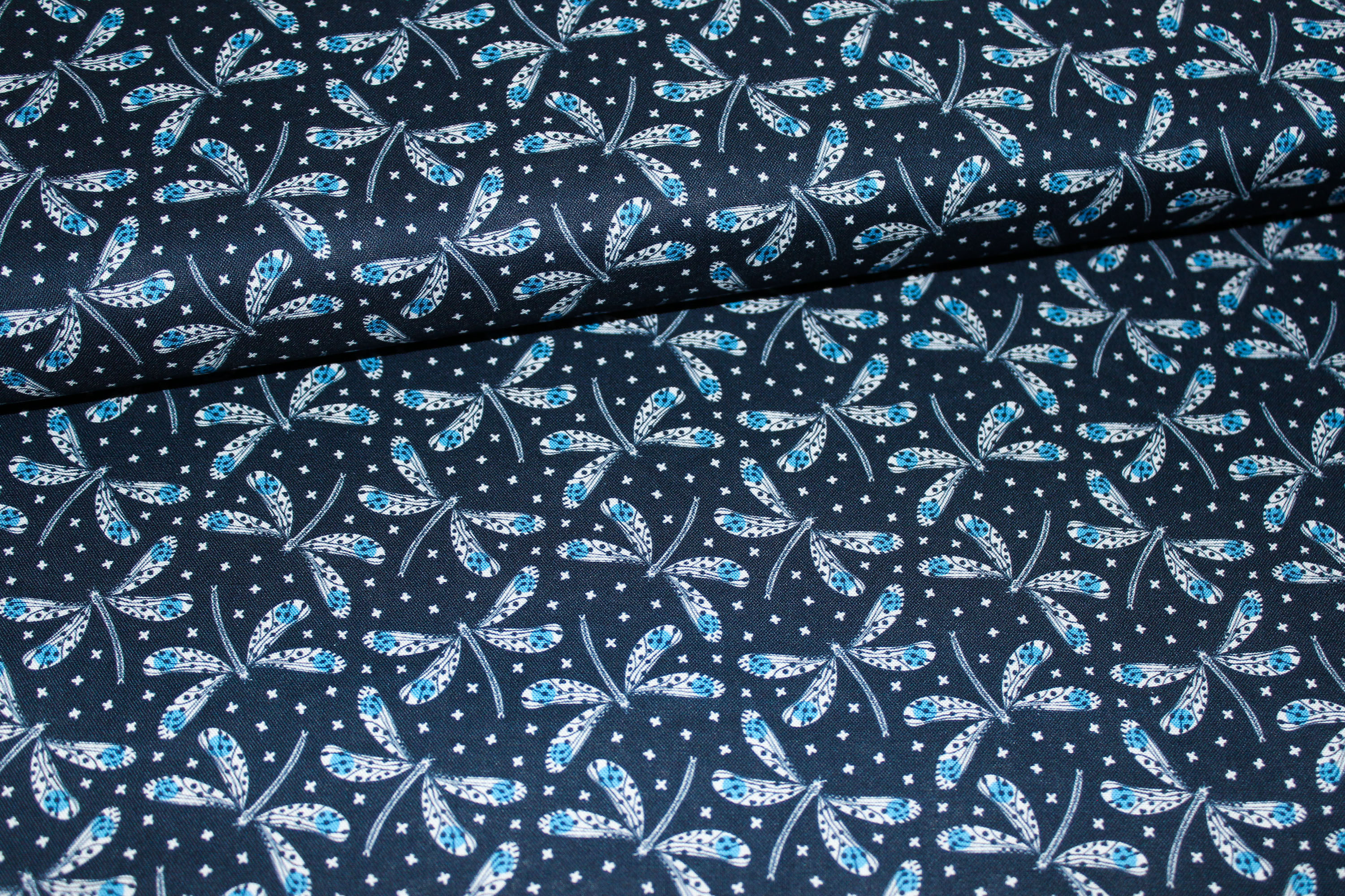 Entdecken Sie unseren bezaubernden Designer-Baumwollwebstoff aus der Serie "Sapphire Skies" von Dashwood Studio, entworfen von Sue Gibbing. Der Untergrund des Stoffes ist dunkelblau und wird durch Libellen zum Leben erweckt. Dieser Stoff eignet sich perfekt für die Herstellung von Taschen, Geldbörsen, Kissen und vielen anderen Accessoires.