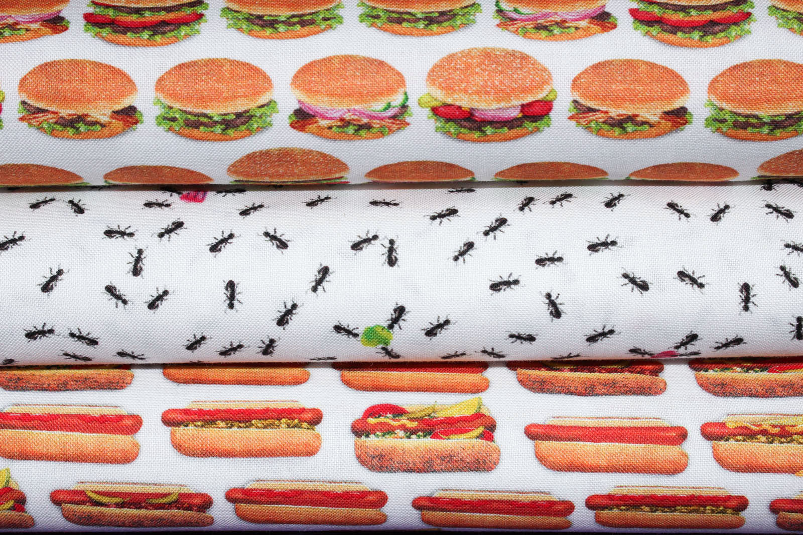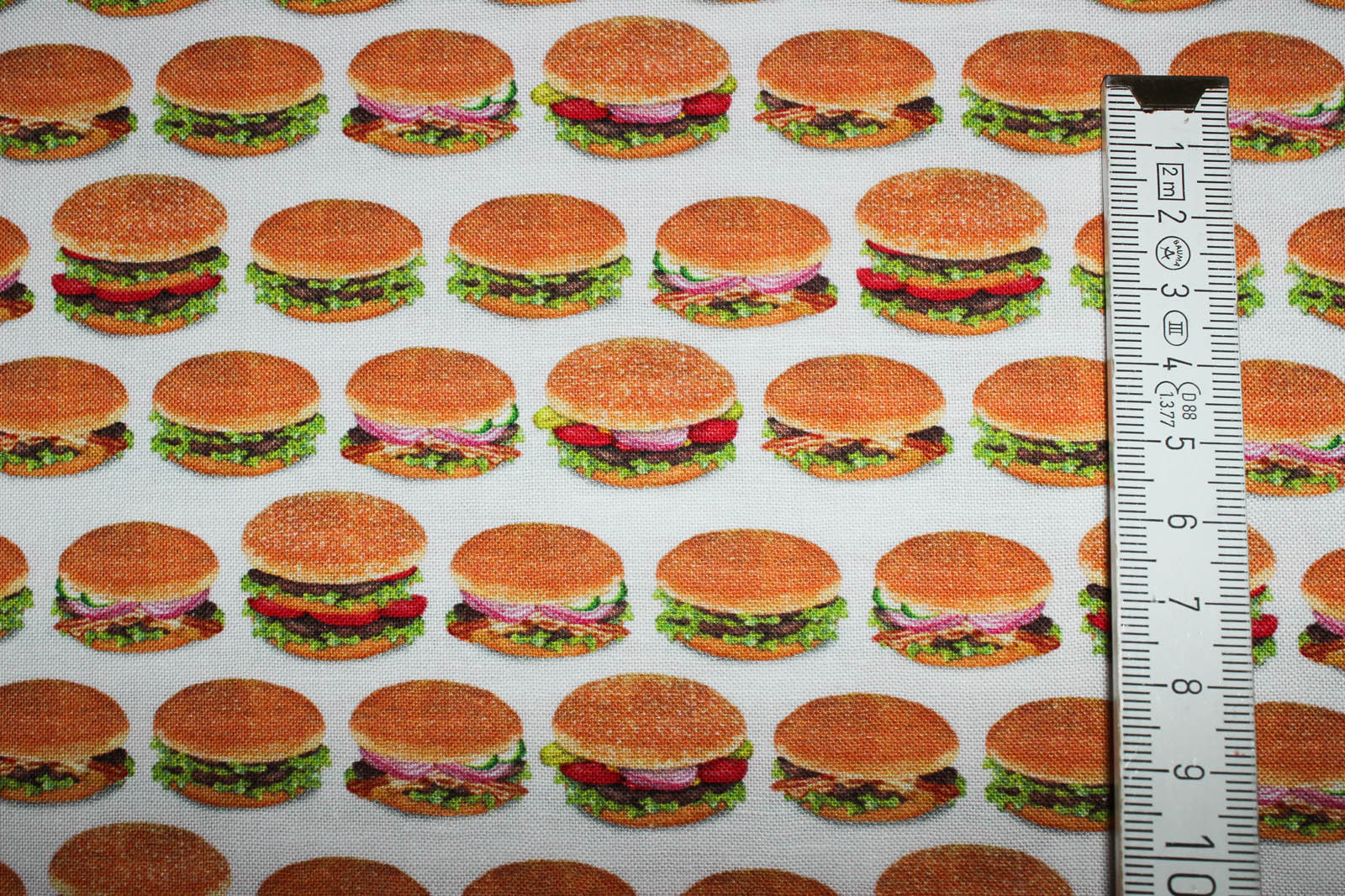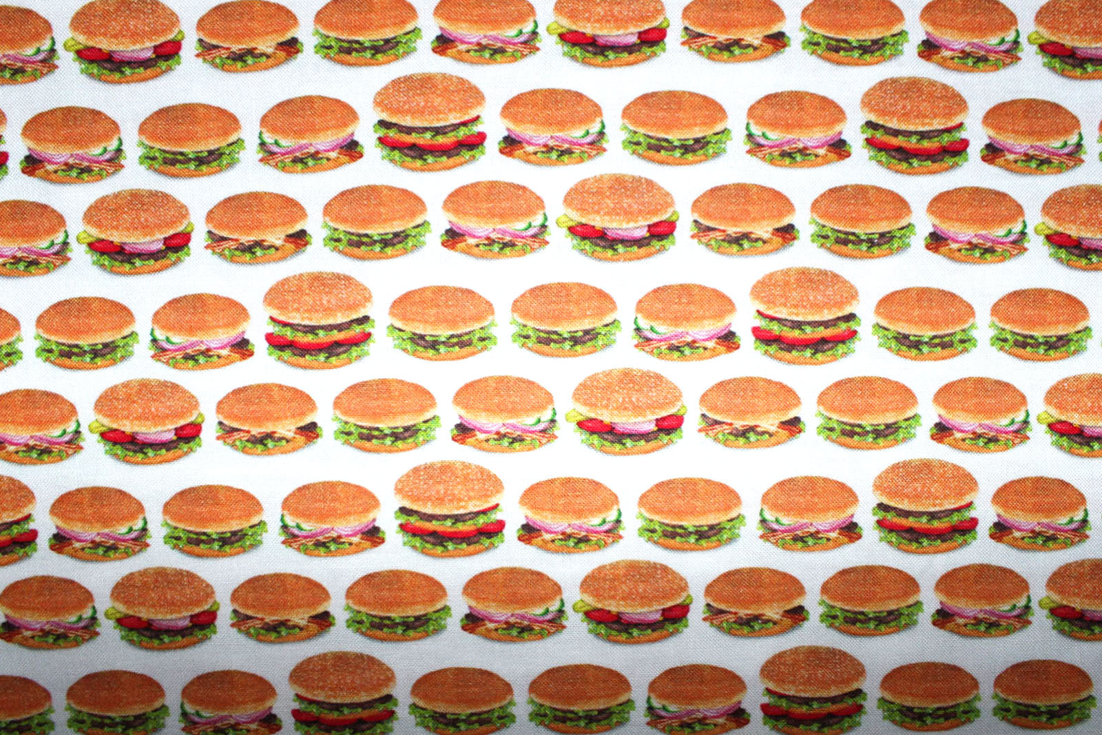 usw.Hier biete ich Euch einen ausgefallenen Designerbaumwollwebstoff designed by Mary Lake-Thompson aus der Serie "Chow Time" für Robert Kaufman an.Die Burger haben eine Größe von ca.2,5 x 2 cm. Ideal für ausgefallene Homedeko, Servietten, Tischläufer oder Platzdeckchen für die nächste Burgerparty. Die Stoffe auf dem vierten Foto gehören nicht zum Angebot, sondern dienen der Inspiration.