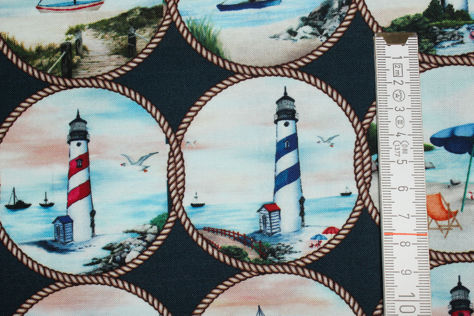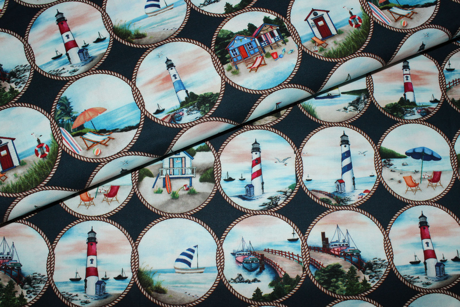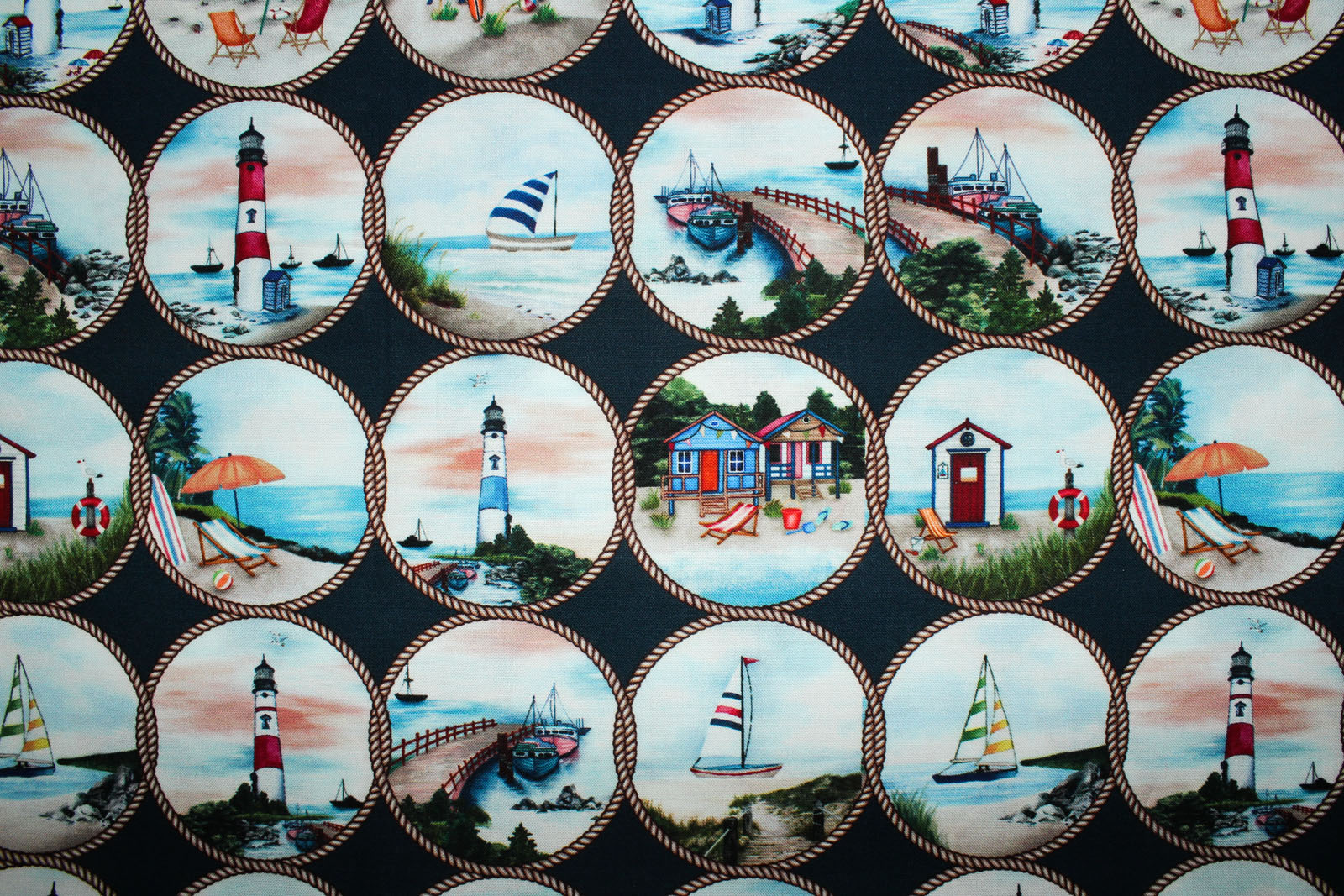 usw.Hier biete ich Euch einen wunderschönen maritimen Designerbaumwollwebstoff "Cast off " aus der Serie "By The Sea" dem Hause Michael Miller an. Der Untergrund des Stoffes dunkelblau. Die Motive haben einen Durchmesser von ca. 7,5 cm.