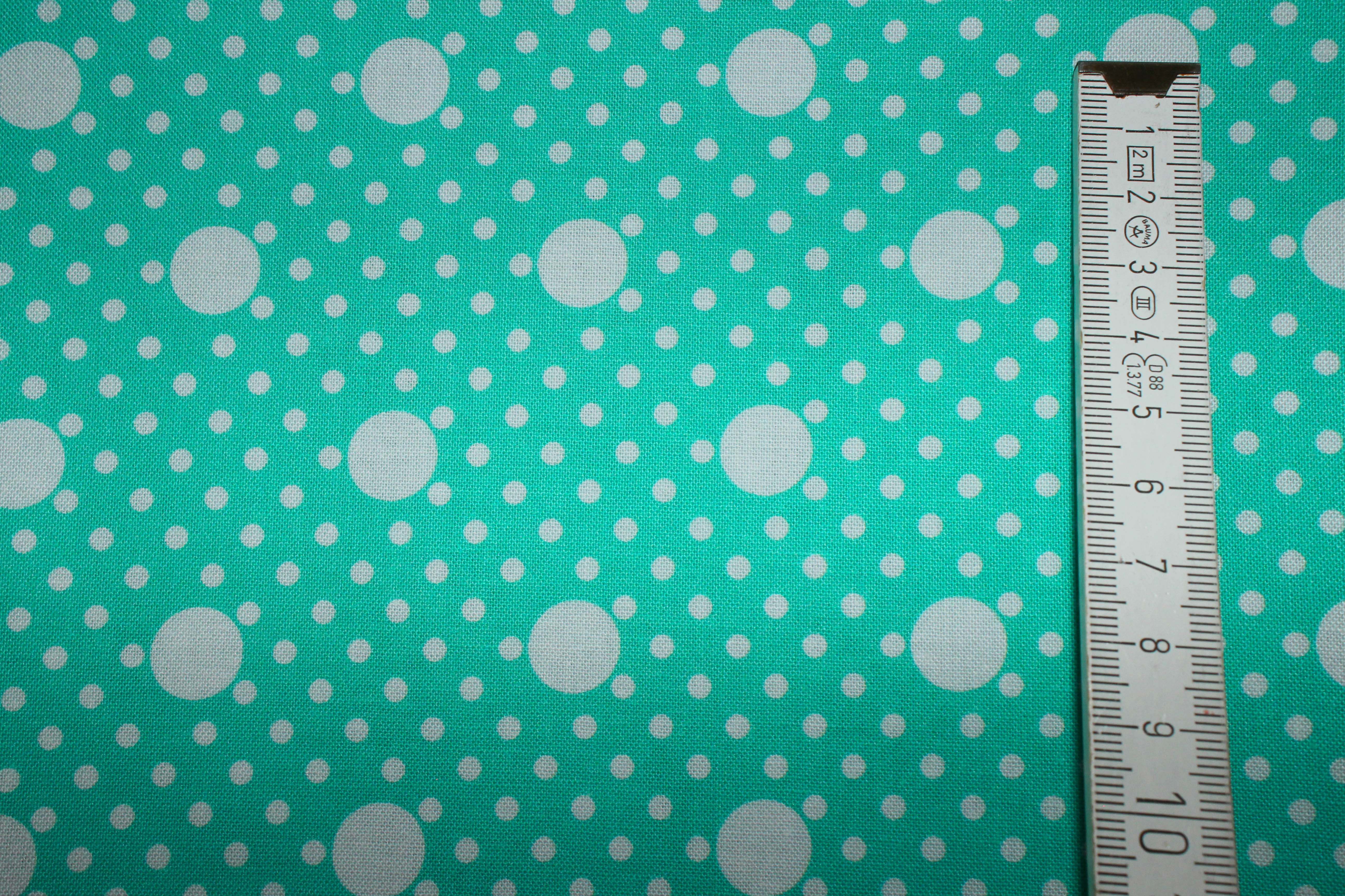 usw.Hier biete ich Euch einen tollen Designerbaumwollwebstoff Delightful Dot aus dem Hause Free Spirit an. Der Untergrund des Stoffes ist ein kräftiger Mintton, die Punkte sind weiß. Die Punkte haben eine Größe von ca.12 mm bzw. 2,5 mm. Ideal geeignet für Taschen, Kissen oder Bekleidung.