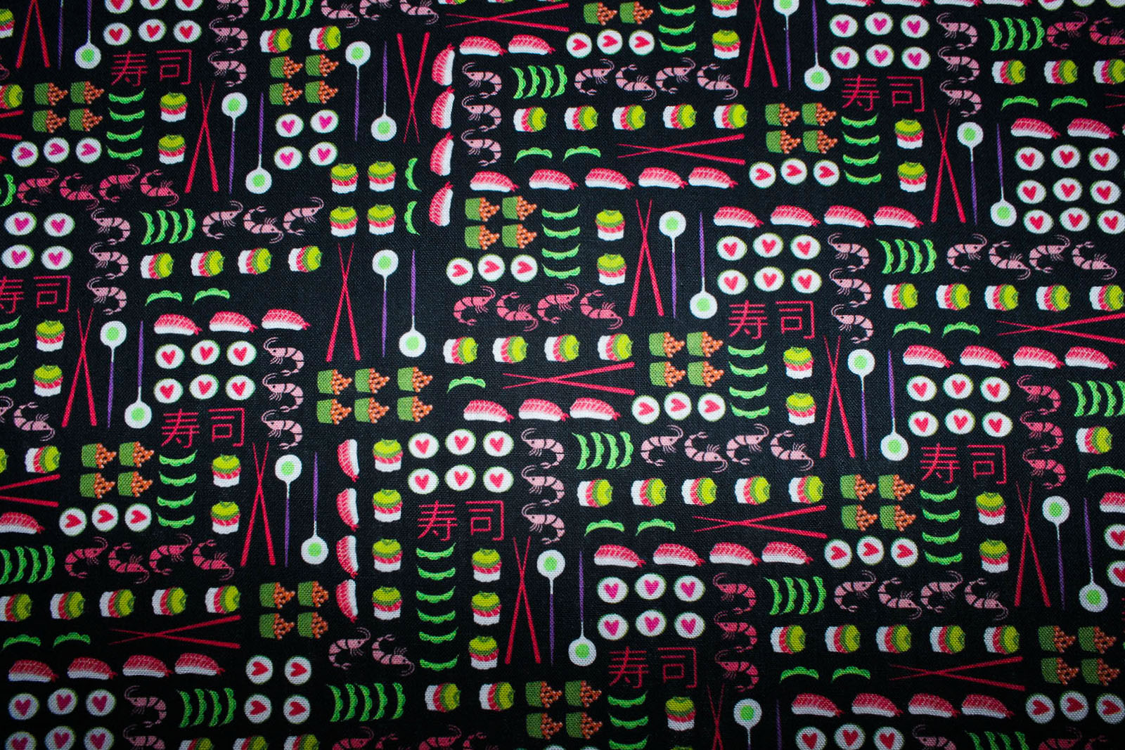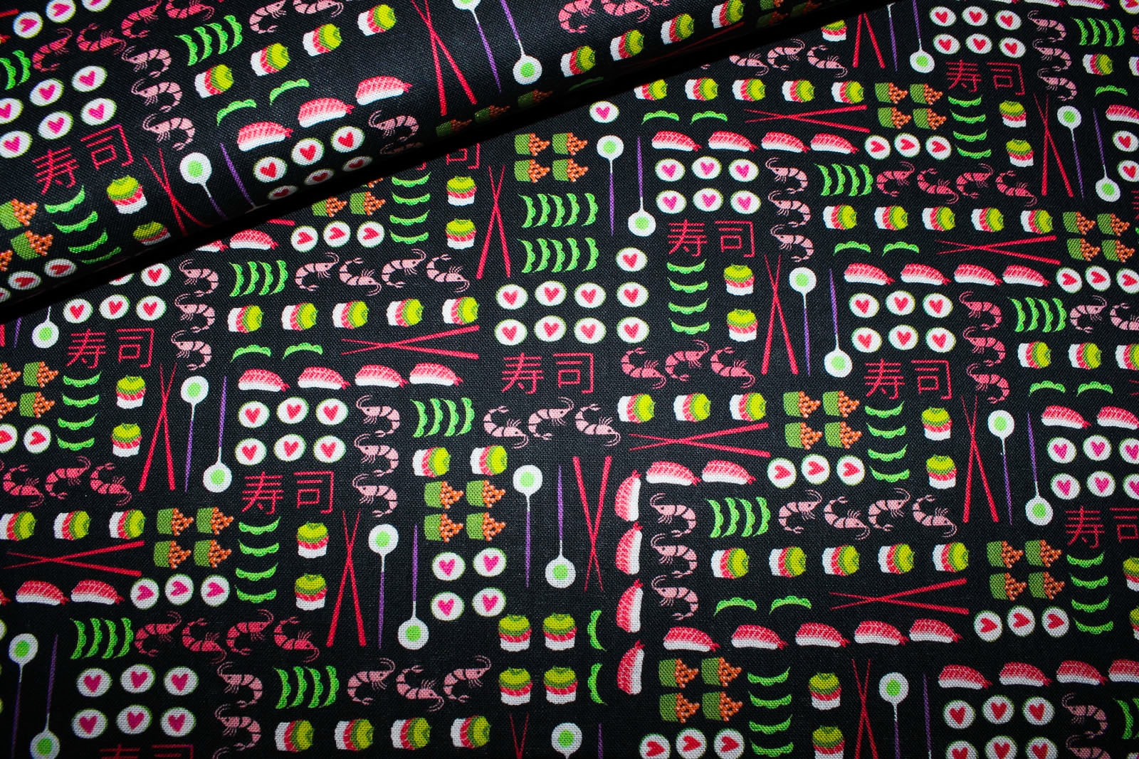usw.Hier biete ich Euch einen ausgefallenen Designerbaumwollwebstoff "I love Sushi" aus der Serie "Geisha Girl" aus dem Hause Michael Miller an. Der Untergrund des Stoffes ist schwarz. Perfekt geeignet zm Nähen von Platzdeckchen, Servietten, Tischläufer für Sushi- Liebhaber.