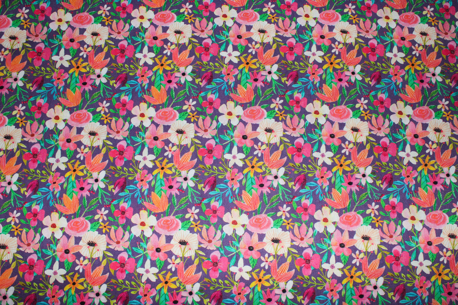 Farbenfroher Designerbaumwollwebstoff Floral Mixture aus der Serie Forest Friends by Mia Charro mit Blumen aus dem Hause Blend. Ideal geeignet für ausgefallene Bekleidung, Taschen, Windeltaschen, Utensilos, Kissen uvm.