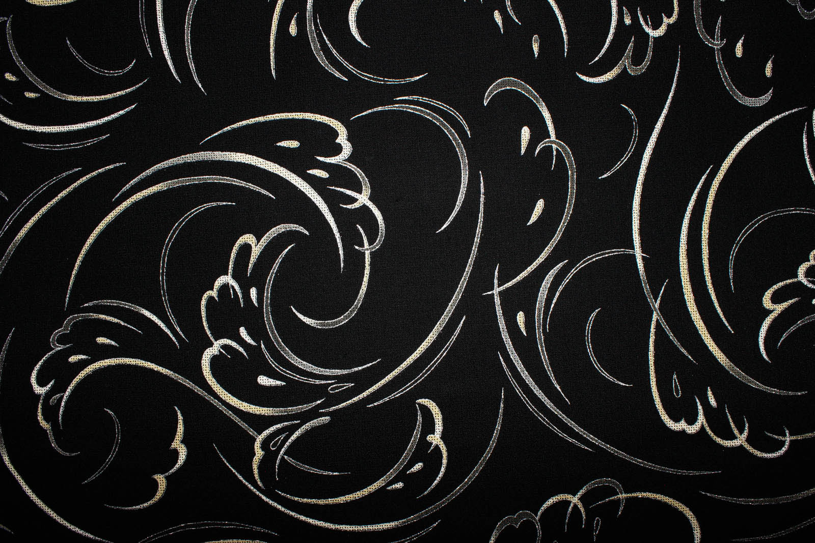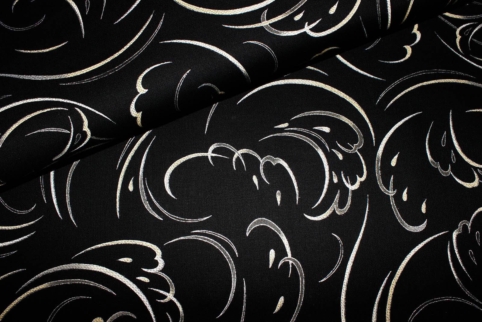 Hier biete ich Euch einen tollen Designerbaumwollwebstoff "Moonlight Garden" aus dem HauseRobert Kaufmann mit einem grafischen Muster an. Der Untergrund des Stoffes ist schwarz, die Umrisse des Wellenmusters hat silberfarbene Metallic-Effekte. Dadurch wirkt der Stoffe sehr edel. Das komplette Muster wiederholt sich alle 24 Zoll (60,96 cm).