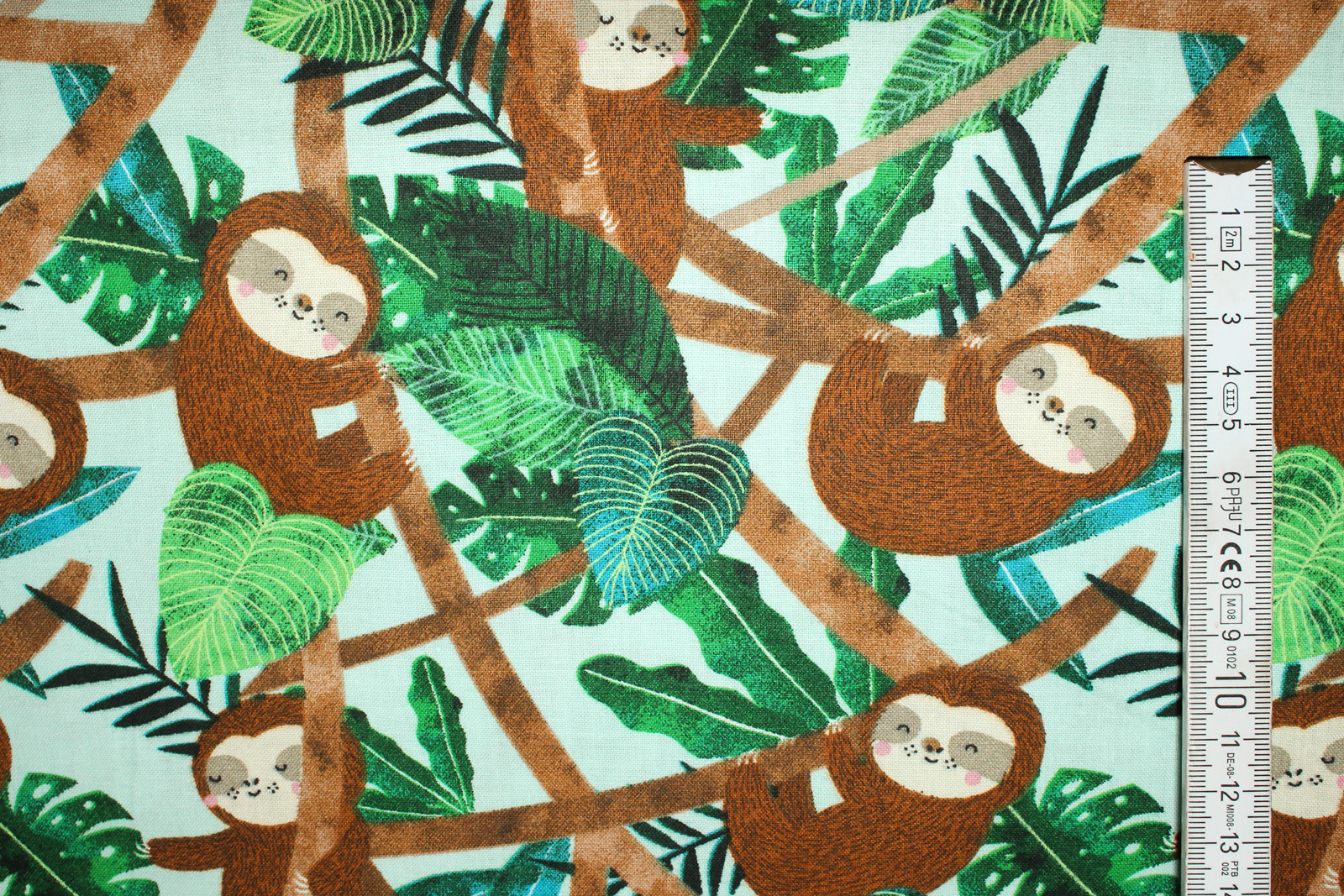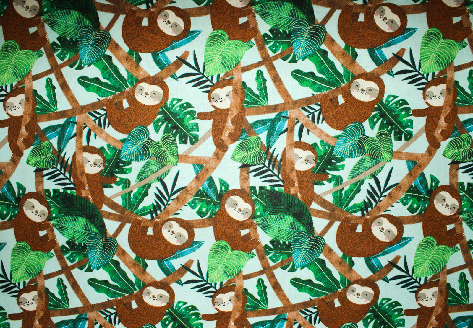 Designerbaumwollwebstoff "Restful Sloths" ,schlafende Faultiere im Dschungel, aus dem Hause 3 Whishes Fabric. Ideal geeignet für Taschen, Kissen, ausgefallene Bekleidung uvm. Abgebildete weitere Stoffe, Kunstleder und Zubehör auf den weiteren Fotos gehören nicht zum Angebot, sondern dienen der Inspiration.