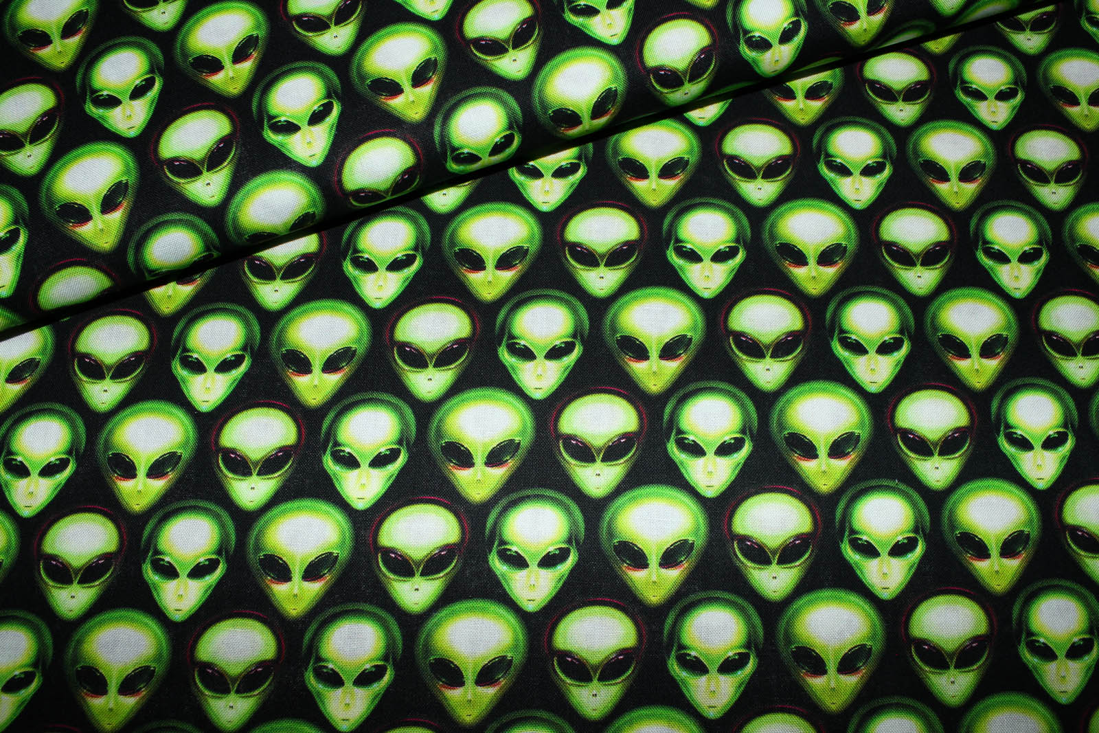 usw.Hier biete ich Euch einen ausgefallenen Designerbaumwollwebstoff mit Alienköpfen aus dem Hause Robert Kaufmann an. Perfekt geeignet zm Nähen von ausgefallender Bekleidung, Kosmetiktäschchen, Untensilos o.ä.. Weitere Stoffe auf dem fünften Foto gehören nicht zu diesem Angebot, sondern dienen der Inspiration.