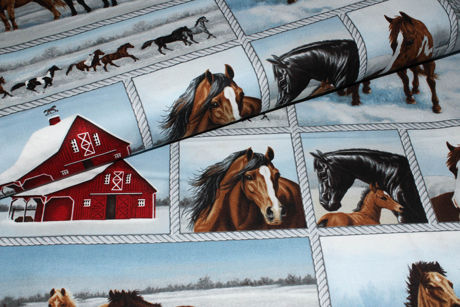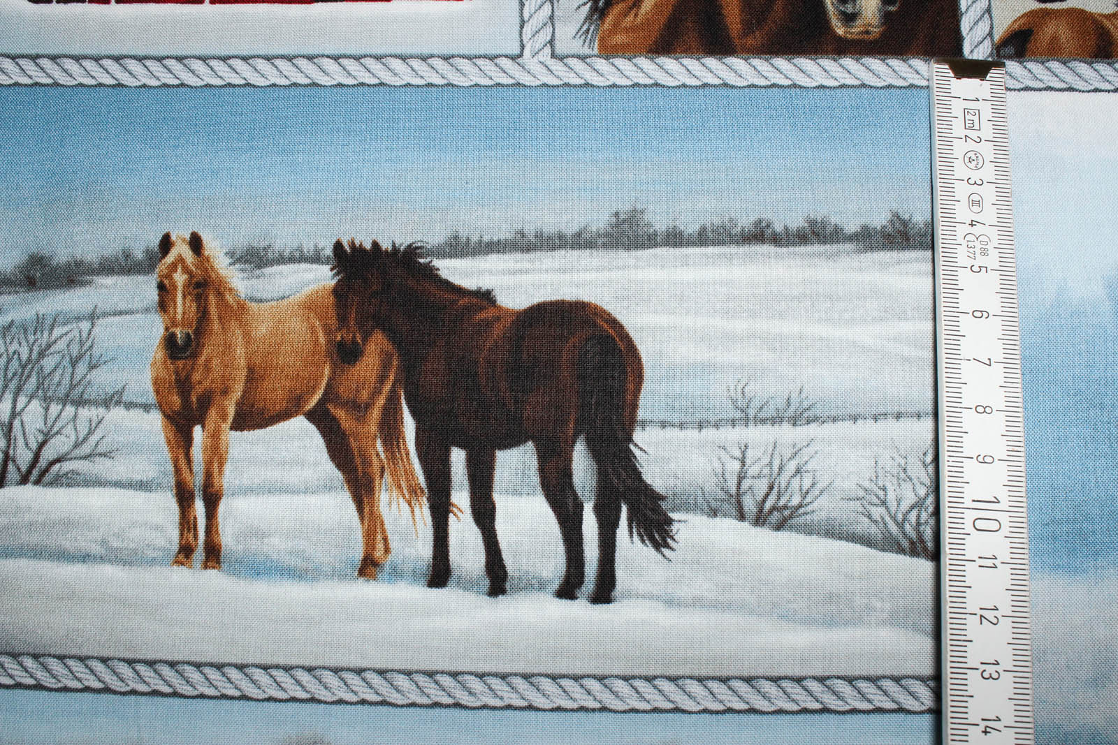 Dieser Stoff wird in 86 cm Abständen verkauft, damit die Pferdedrucke nicht zu willkürlich zerschnitten werden. Wer mehr benötigt kann dann 1,72 m usw. bestellen.