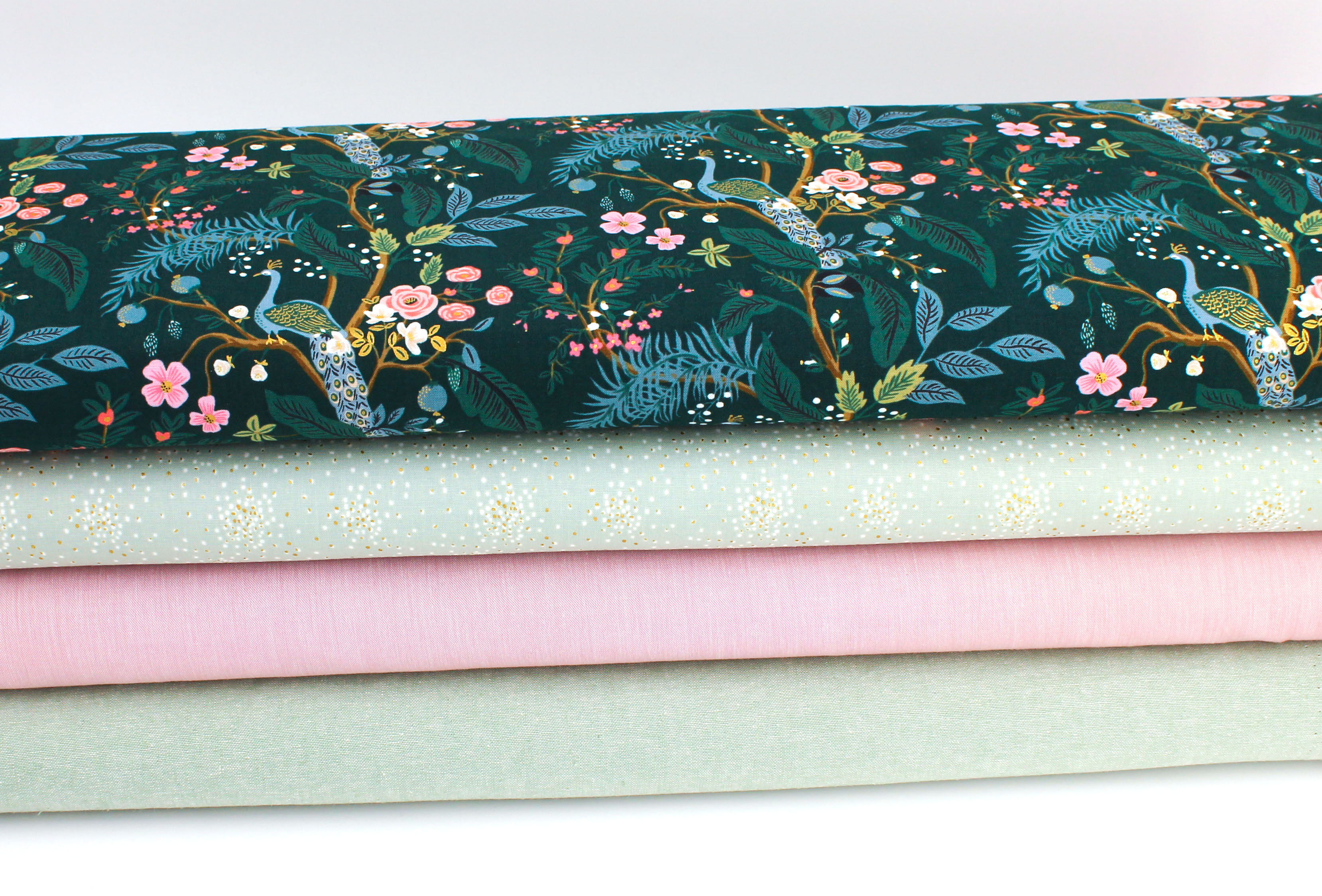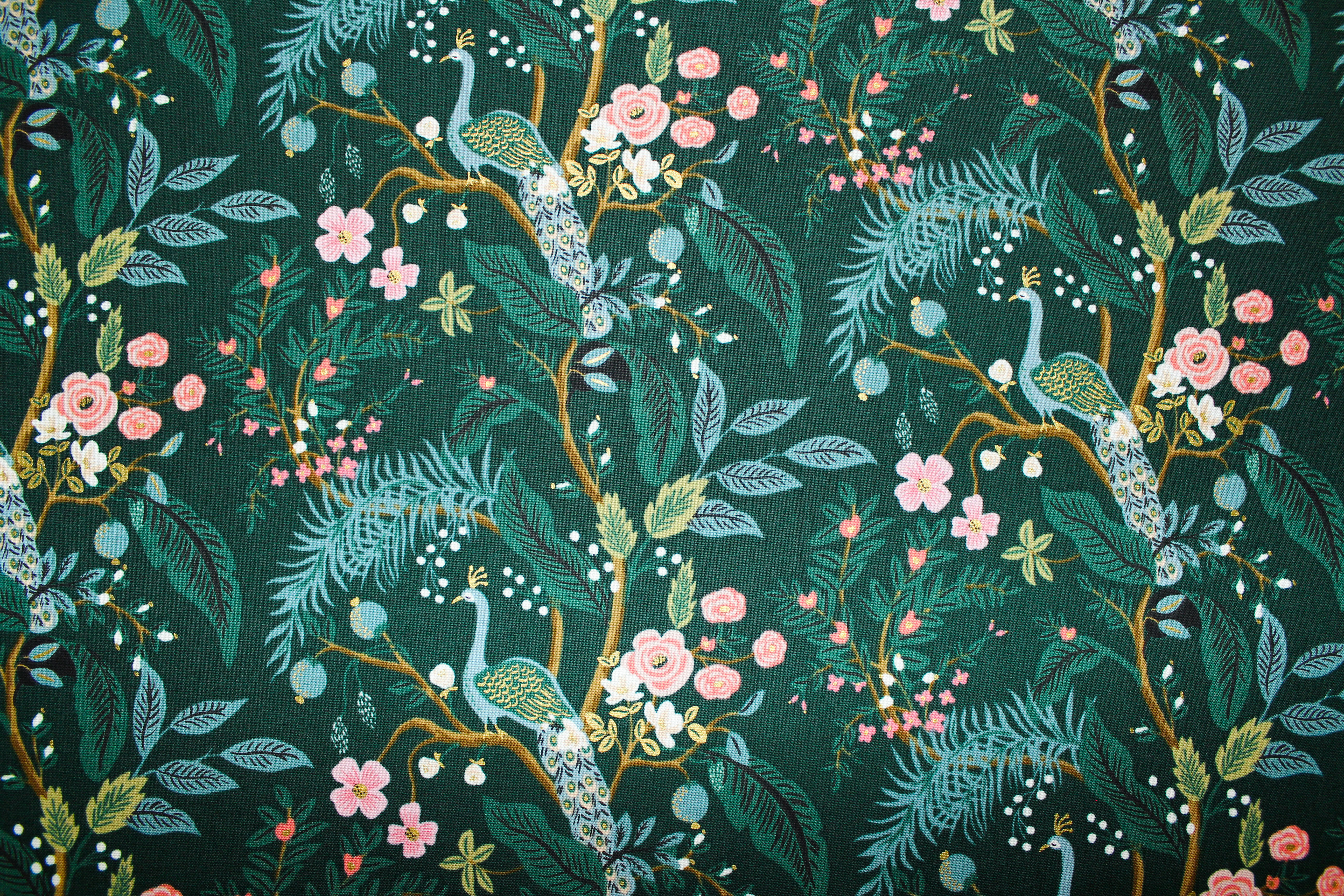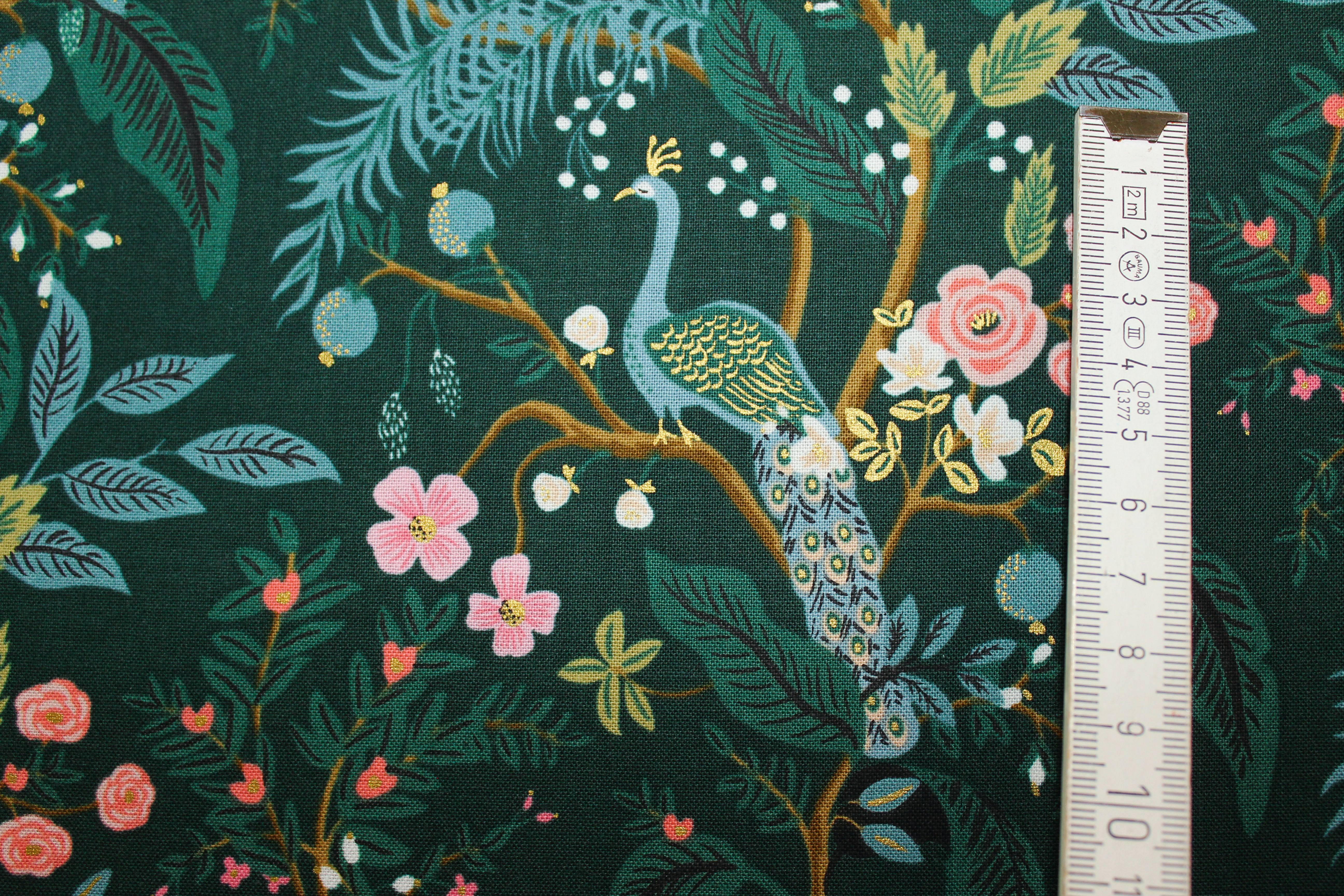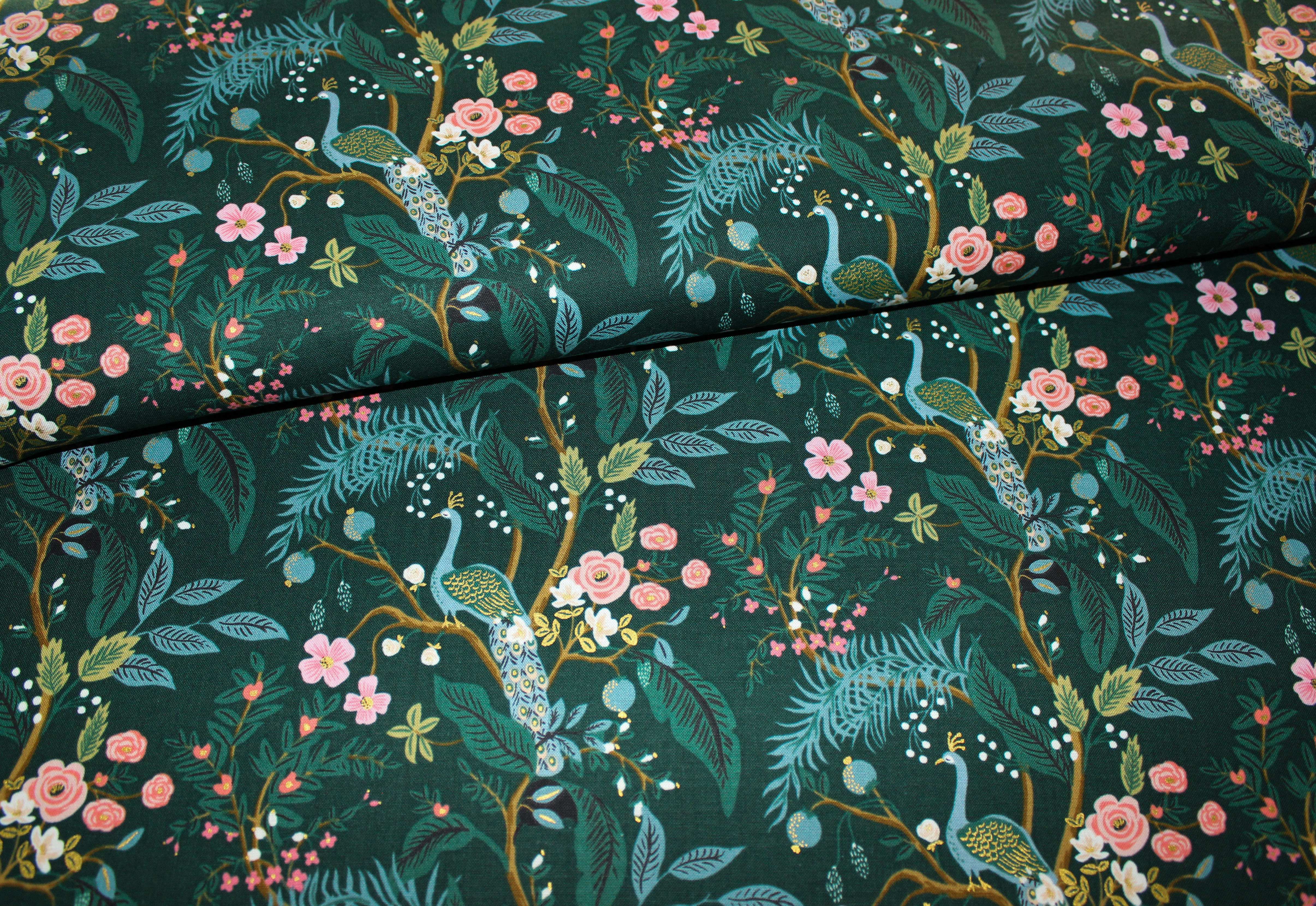 Entdecken Sie den bezaubernden Designer-Baumwollwebstoff Garden Peacock- Hunter dunkelgrün/ metallic von Rifle Paper Co aus der Serie Vintage Garden mit Blumen, Blättern und Pfauen auf dunkelgrünem Untergrund der durch goldene Metallic-Akzente veredelt wird. Der majestätische Pfau präsentiert sich in einer beeindruckenden Größe von ca. 9 cm. Die vielseitige Verwendbarkeit macht ihn zur idealen Wahl für individuelle Taschen, stilvolle Kissen, einzigartige Homedeko oder modische Bekleidung.