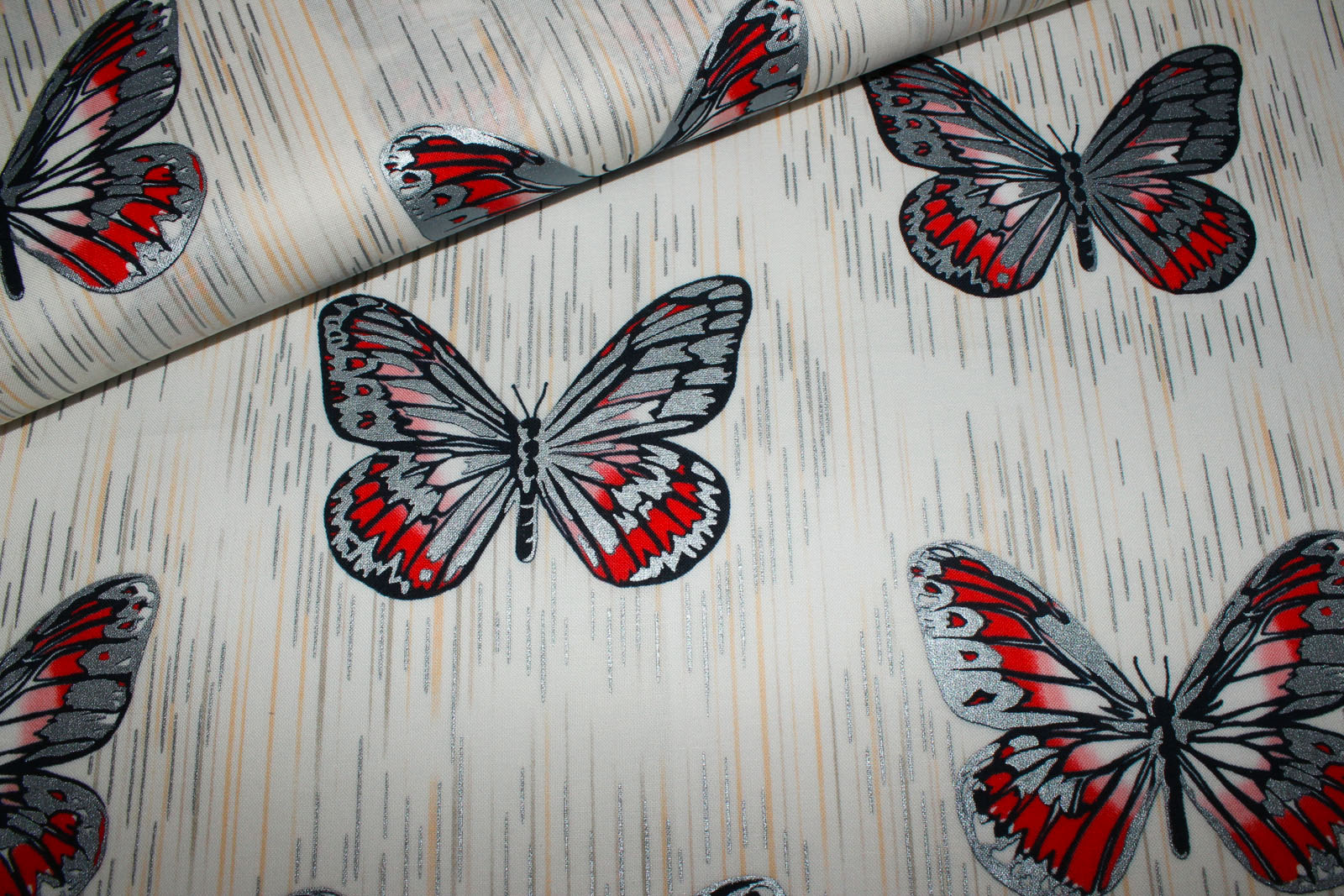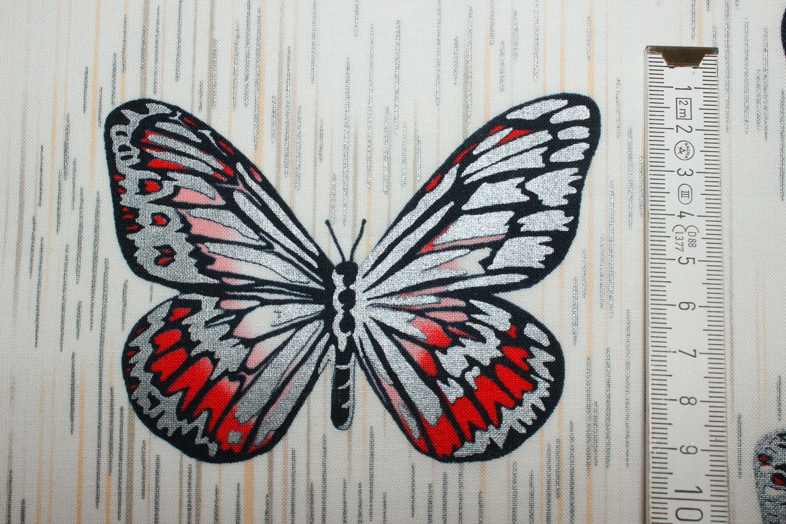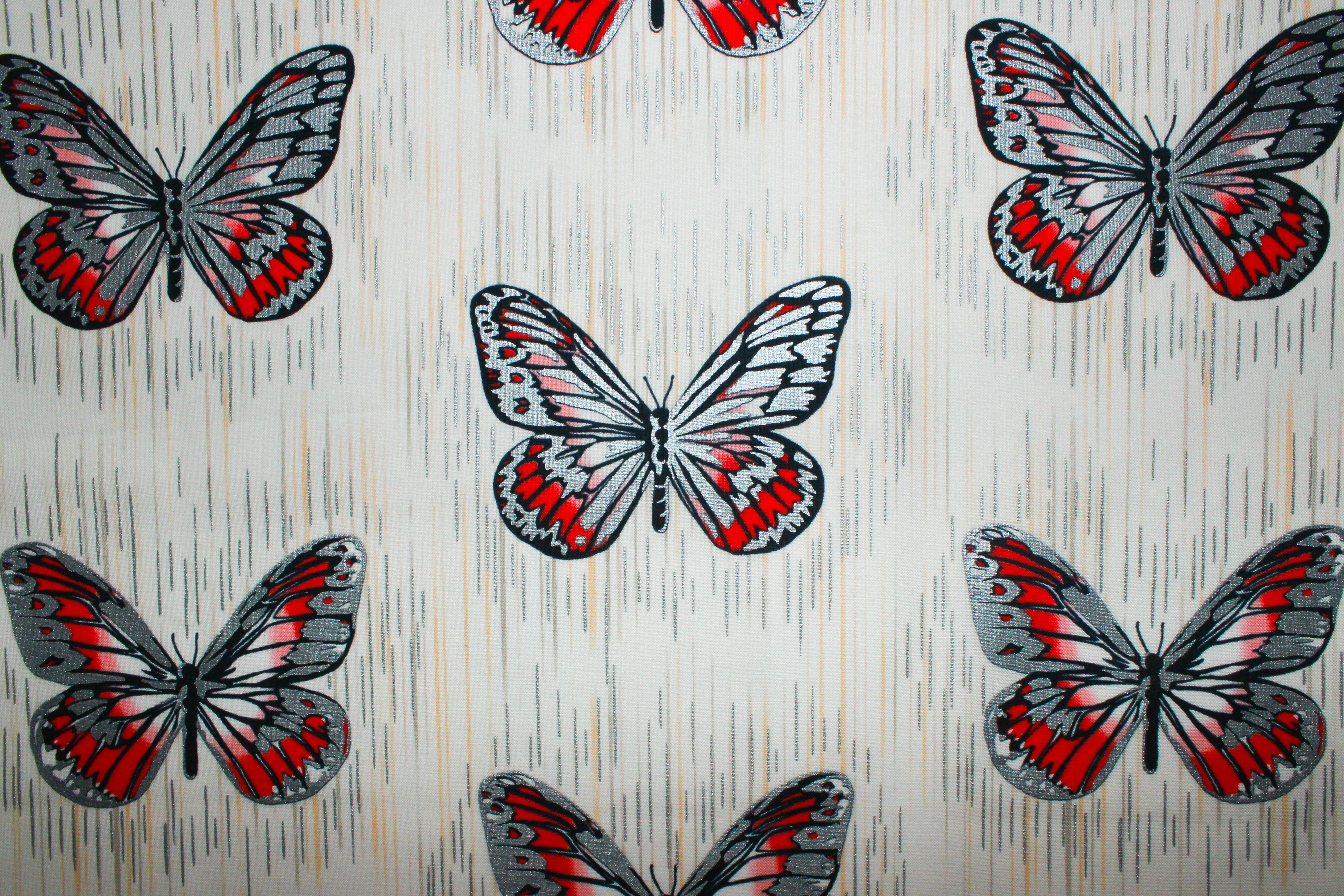 usw.Trendiger Baumwolldesignerwebstoff designed by Jennifer Sampou aus der Serie Spring Shimmer von Robert Kaufmann mit Schmetterlingen und Strichen, die teilweise metallic schimmernde Akzente haben. Der Untergrund des Stoffes ist cremefarben. Ein Schmetterling ist ca. 11,5 cm breit und 8,5 cm hoch.