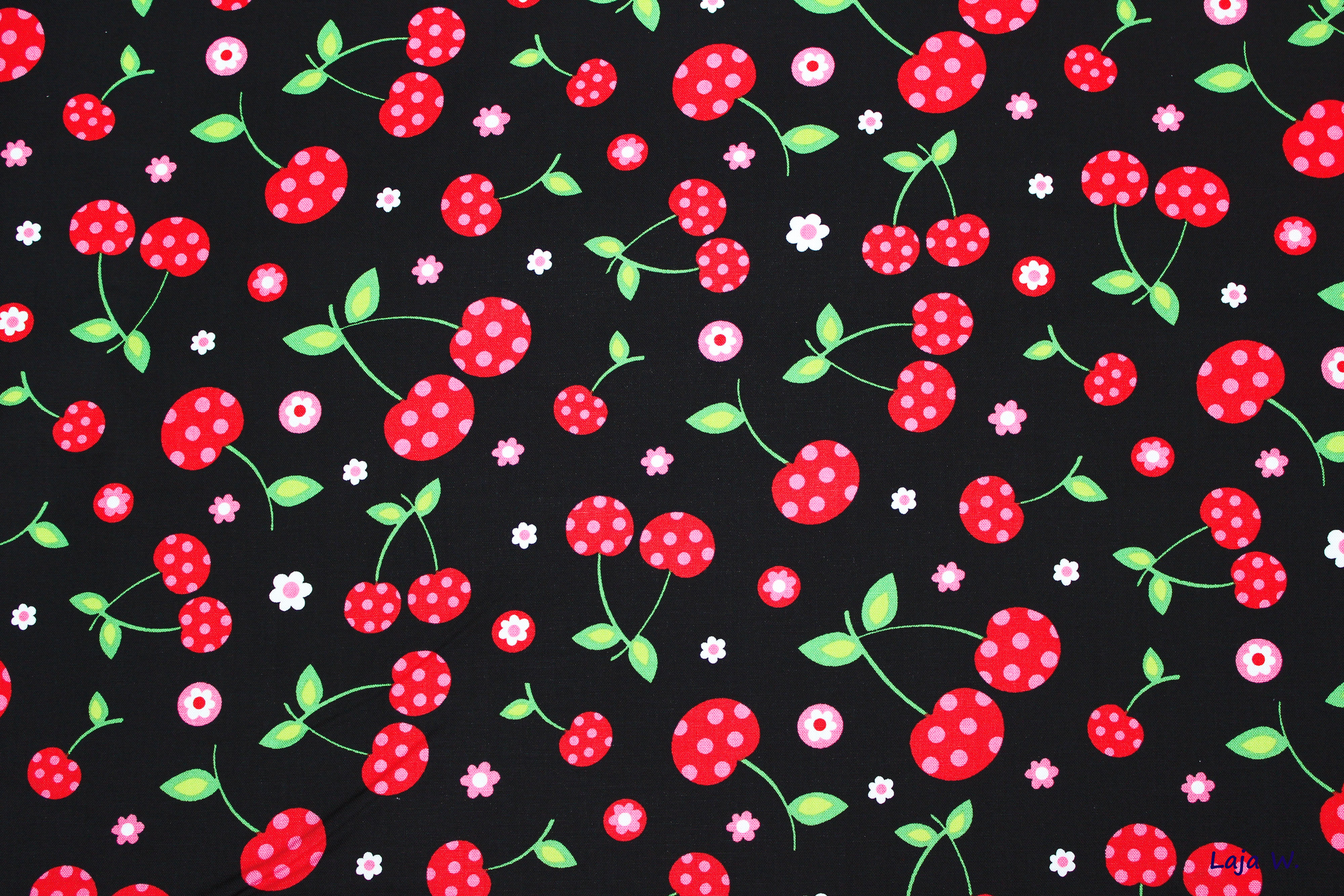 Hier biete ich Euch einen wundervollen Designerstoff aus dem Hause von Robert Kaufmann mit ganz vielen kleinen leckeren Kirschen auf schwarzem Grund an. Aufgrund des kleinen Musters eignet sich der Stoff nicht nur für Bekleidung, sondern auch für kleinere Accessoires, wie Täschchen, Tücher, Caps u.ä. Das Designbeispiel auf dem dritten Foto gehört nicht zum Angebot, sondern dient der Inspiration.