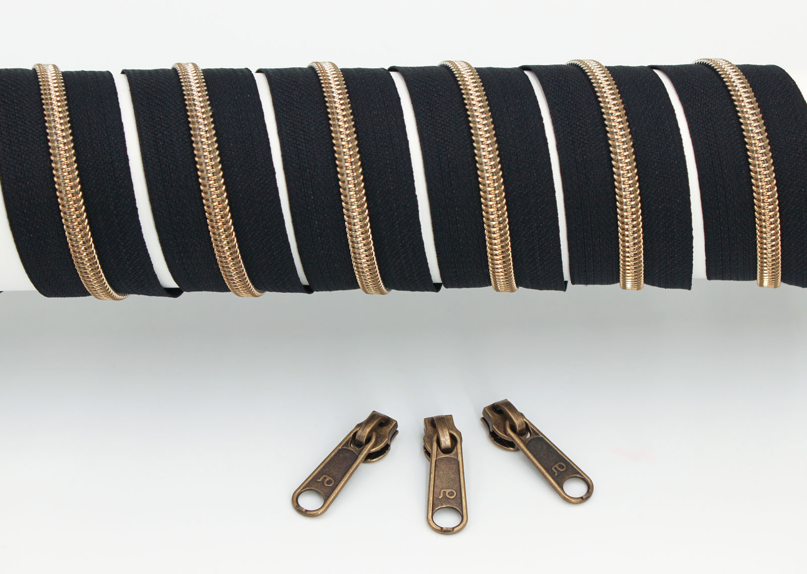 - Meterware Endlosreißverschluss inkl. 3 passenden losen Bügelschiebern je Meter in messing-antik