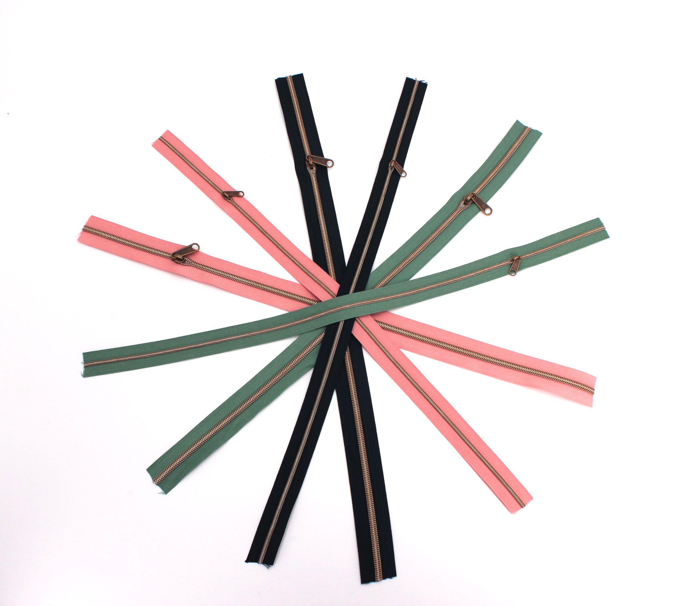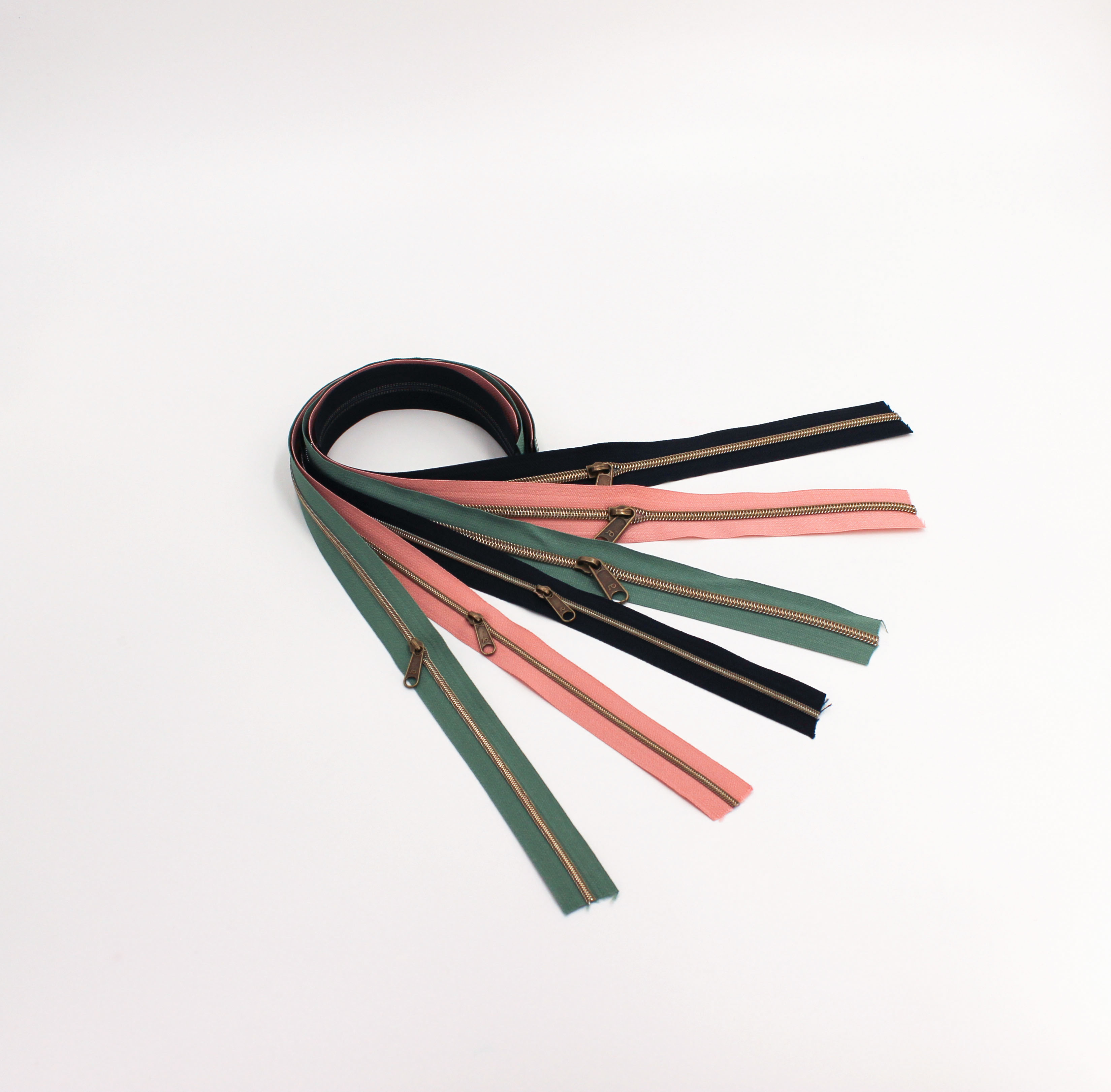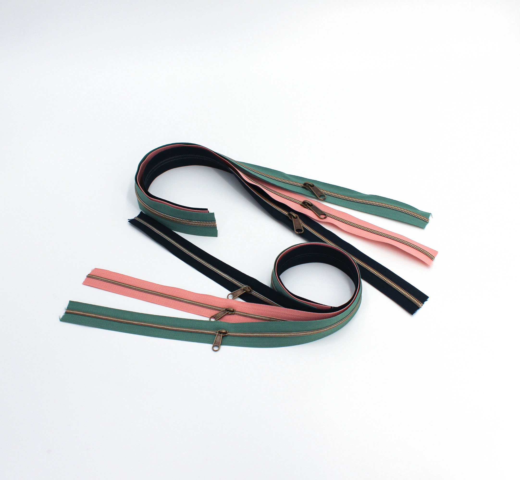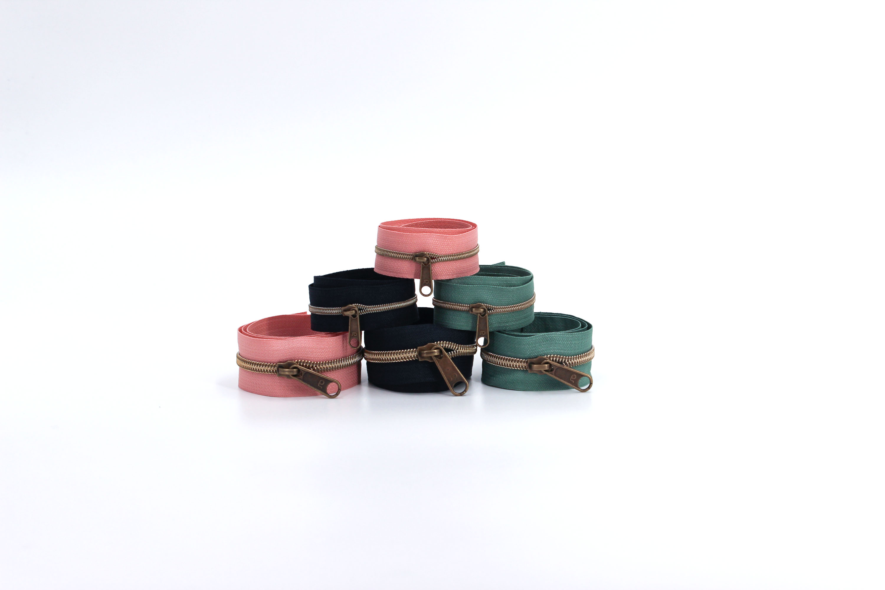 Produkt: Endlosreißverschluss- Set metallisiert nachtblau, dusty rose, dusty emerald/messing-antik