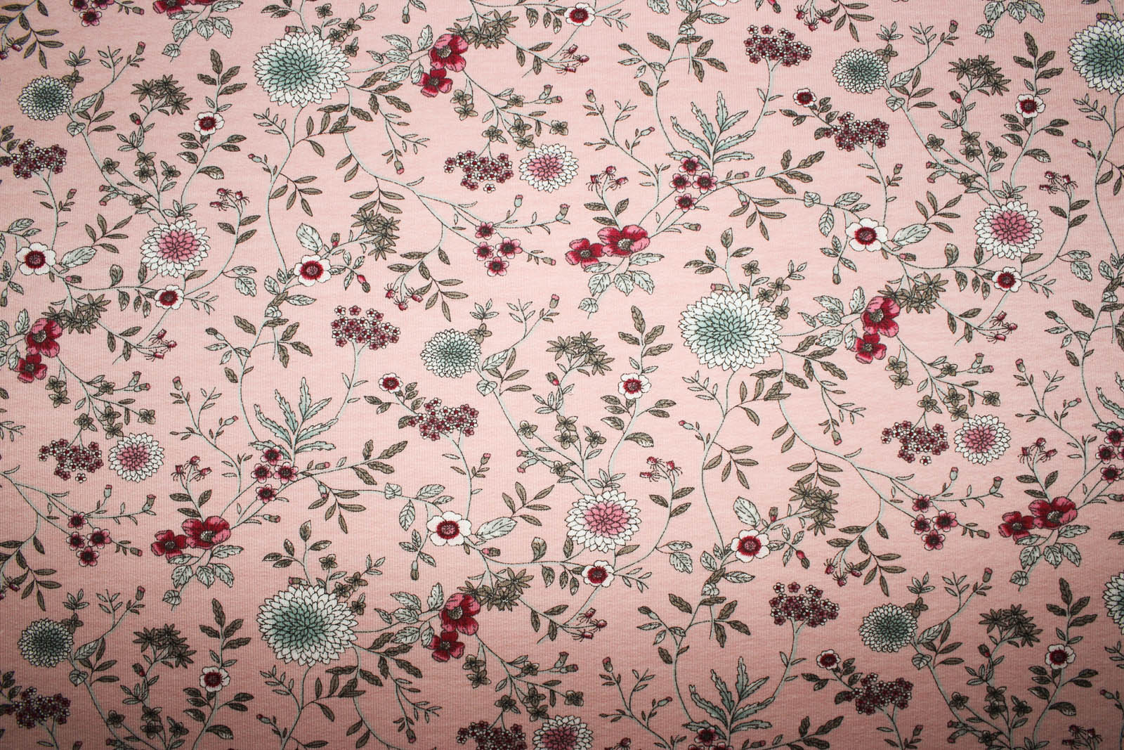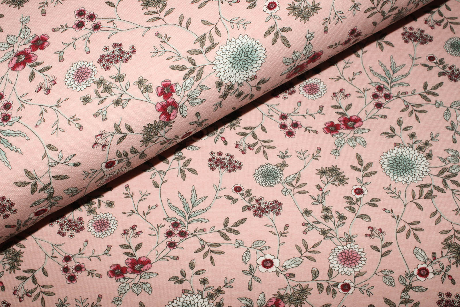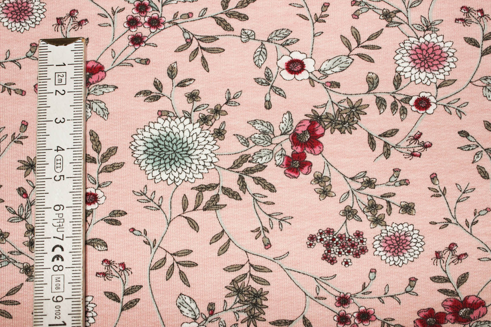 Hier biete ich Euch einen leichten traumhaften Sommersweat (French Terry) in lachsrosa mit Blumenranken, aus dem Hause Hilco an.
