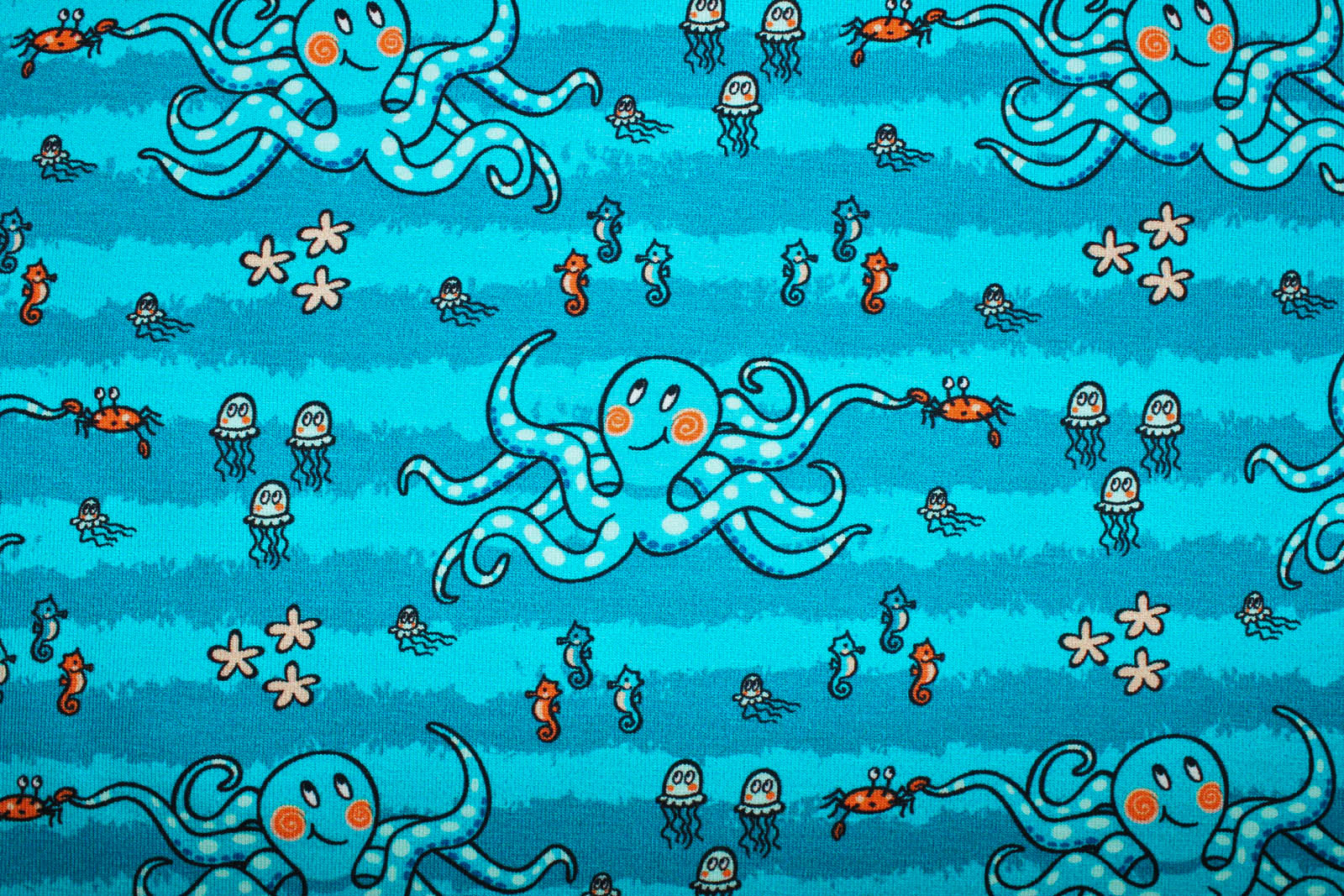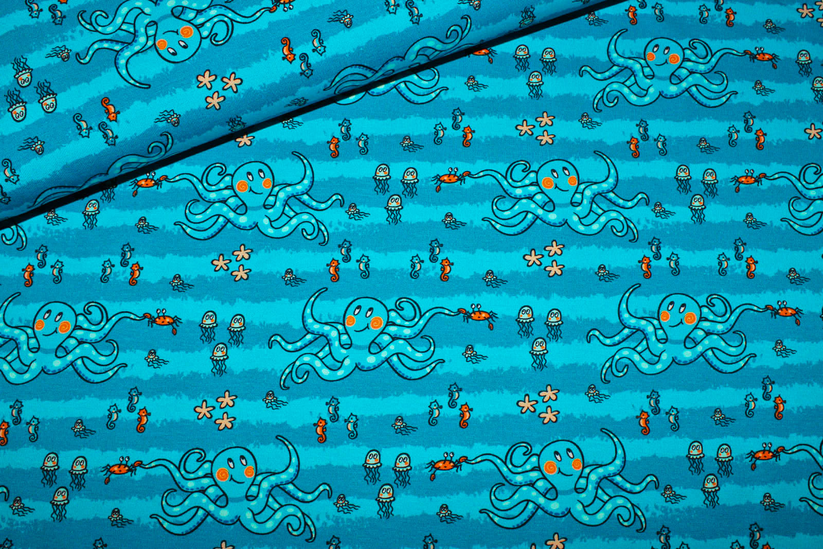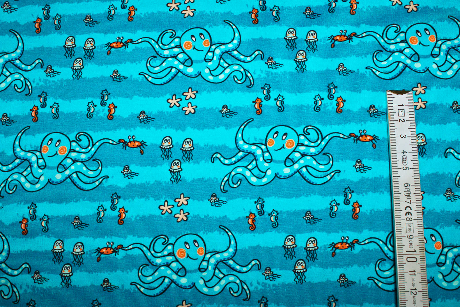 Hochwertiger Hilco Digitaldruck-Jersey "Bluebeard", Design von Birgit Boley. Dieser Baumwolljersey eignet sich prima für lässige Shirts, Beanies, Pumphosen und co. Der Untergrund ist türkis gestreift. Die Kraken haben eine Größe von ca. 4,7 cm x 8,9 cm. Weitere Stoffe und Designbeispiele gehören nicht zu diesem Angebot, sondern dienen der Inspiration.