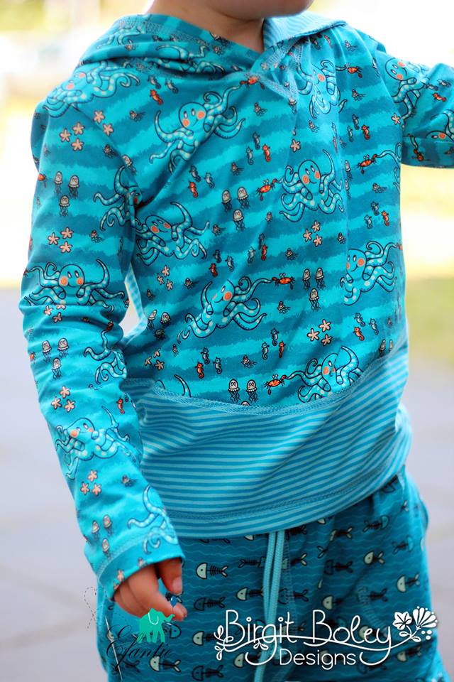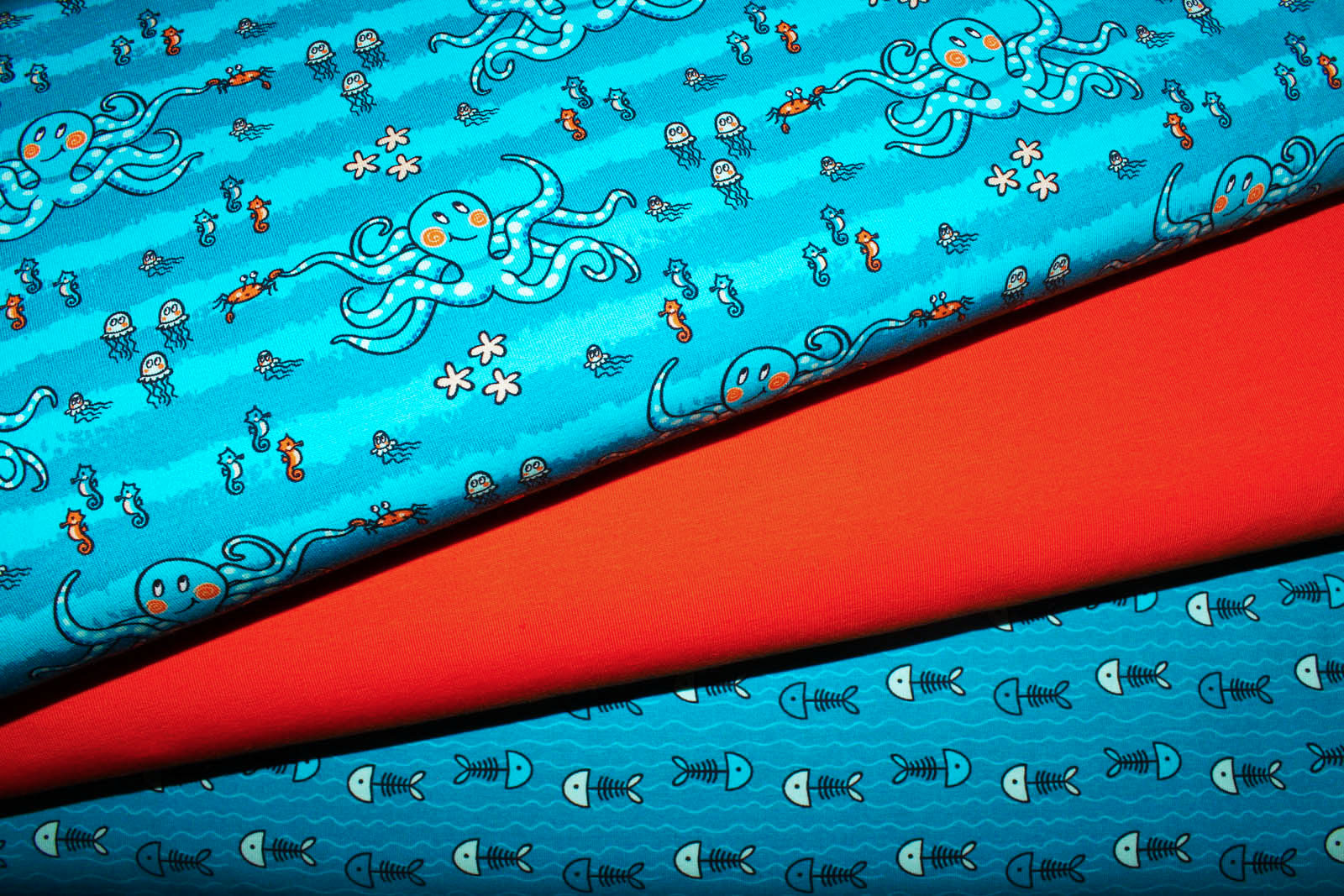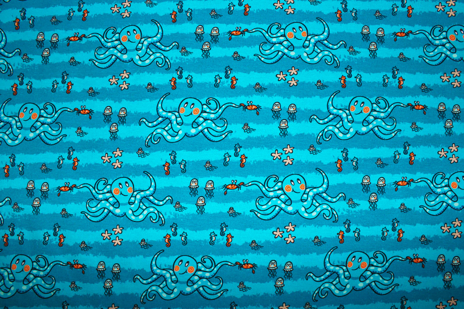 Hochwertiger Hilco Digitaldruck-Jersey "Bluebeard", Design von Birgit Boley. Dieser Baumwolljersey eignet sich prima für lässige Shirts, Beanies, Pumphosen und co. Der Untergrund ist türkis gestreift. Die Kraken haben eine Größe von ca. 4,7 cm x 8,9 cm. Weitere Stoffe und Designbeispiele gehören nicht zu diesem Angebot, sondern dienen der Inspiration.