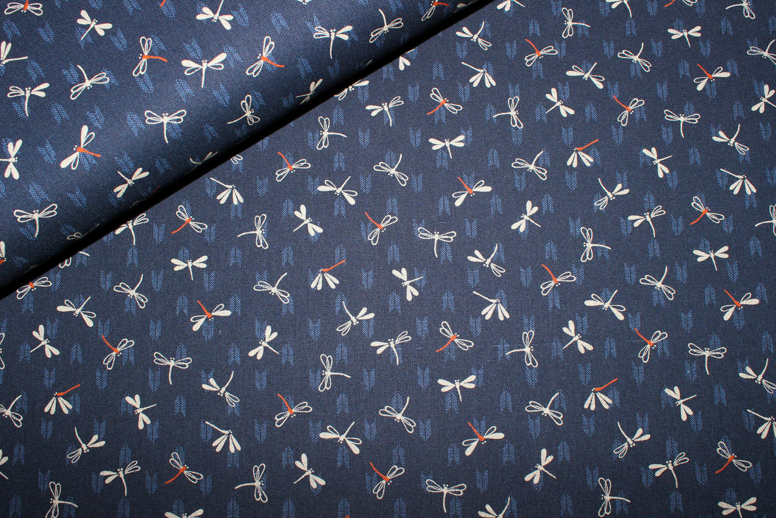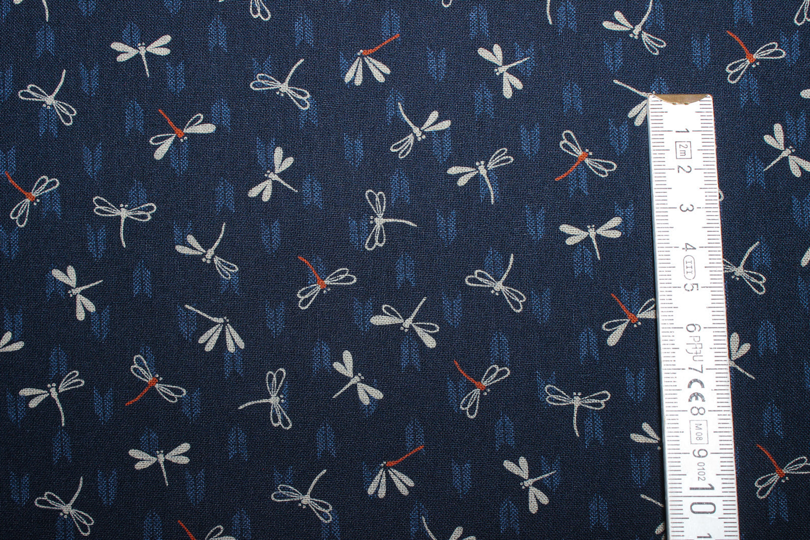 Dünnere aber feste japanische Baumwolle mit Libellen von Sevenberry..ideal geeignet als Taschenstoff, für Röcke, Kissen oder sonstige Accessoires. Der Untergrund ist dunkelblau, der Körper der Libellen ist rotbraun. Weitere Stoffe, Kunstleder und Zubehör auf den weiteren Fotos gehören nicht zum Angebot, sondern dienen der Inspiration.