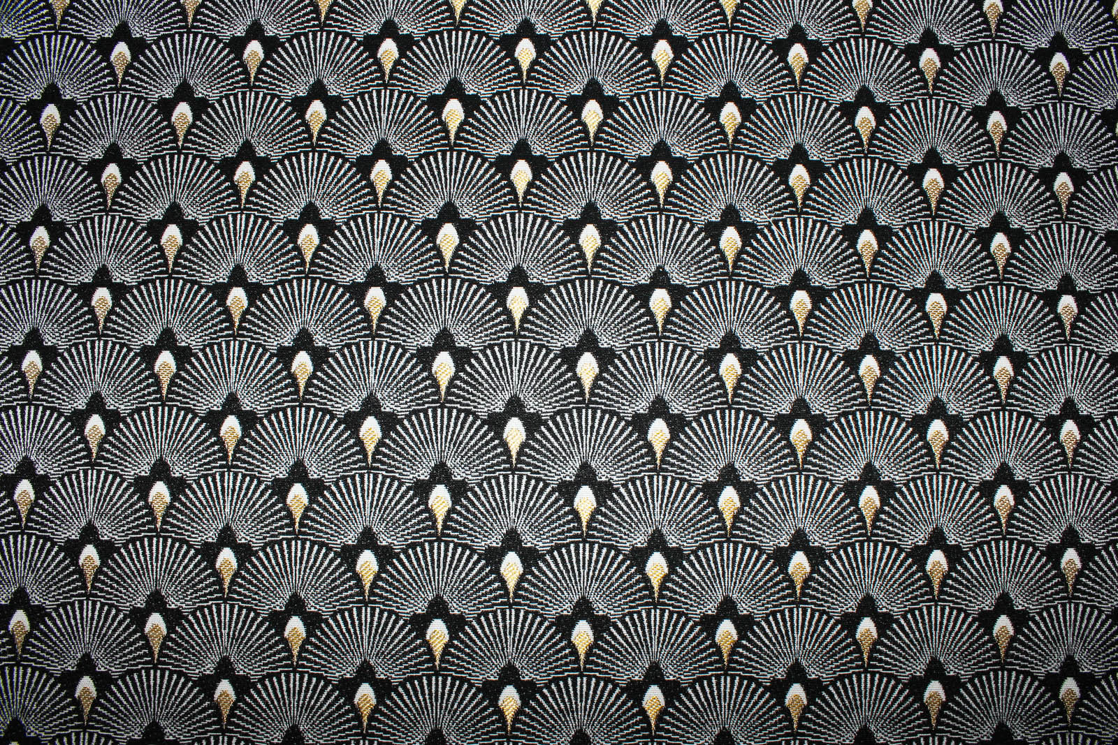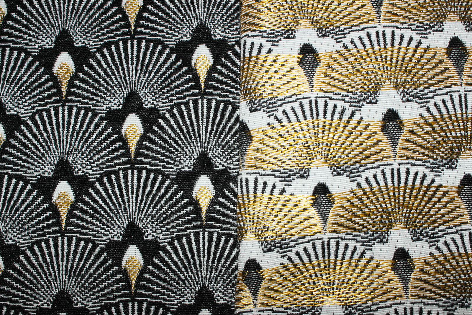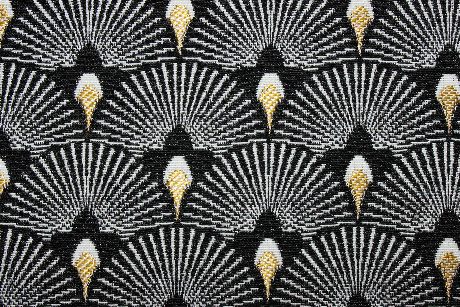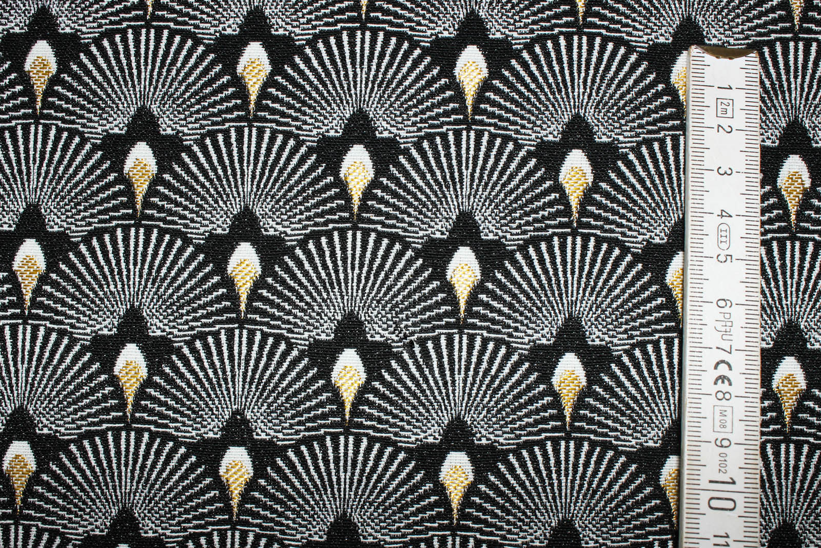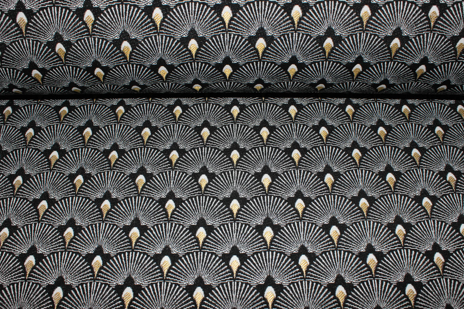 Ein edler und etwas schwererer Jaquard- Dekostoff mit einem grafischen Muster in schwarz/weiß mit eingewebten goldfarbenen Metallfäden. Super geeignet für Taschen, Kissen, Tischläufer, Deko etc. Das Designbeispiel auf dem sechsten Foto gehört nicht zu diesem Angebot, sondern soll der Inspiration dienen.