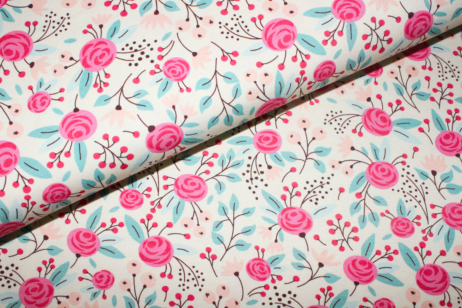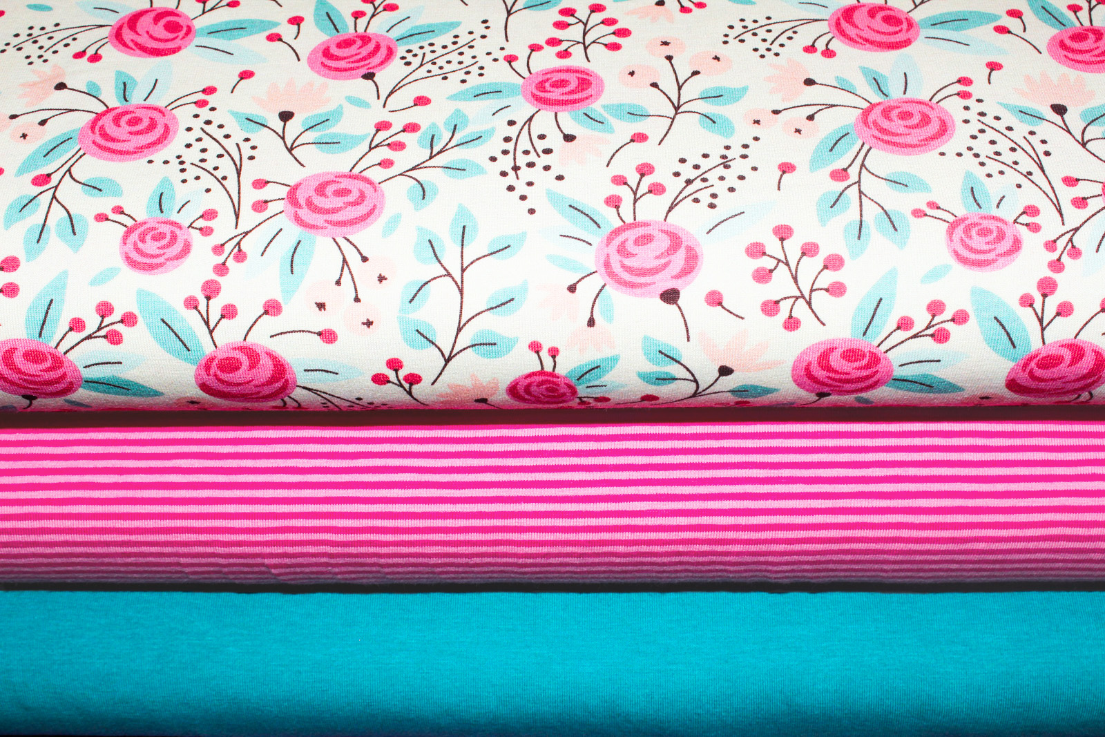 usw.Hier biete ich Euch einen romantischen, hochwertigen Jersey von "Fräulein von Julie" an. Prima geeignet zum Nähen von Shirts, Kleidchen, Schlauchschals, Beanies, Pumphosen und co. Die Stoffe auf dem dritten Foto gehören nicht zum Angebot, sondern dienen der Inspiration.
