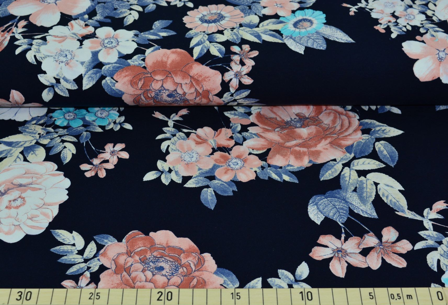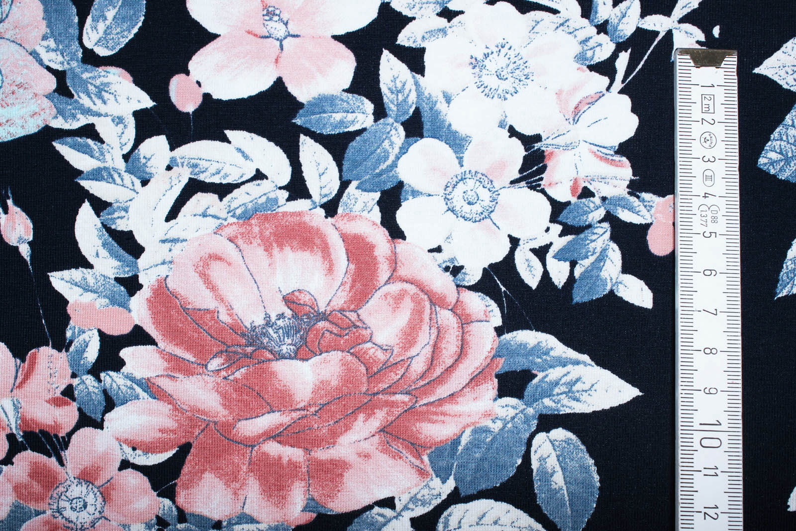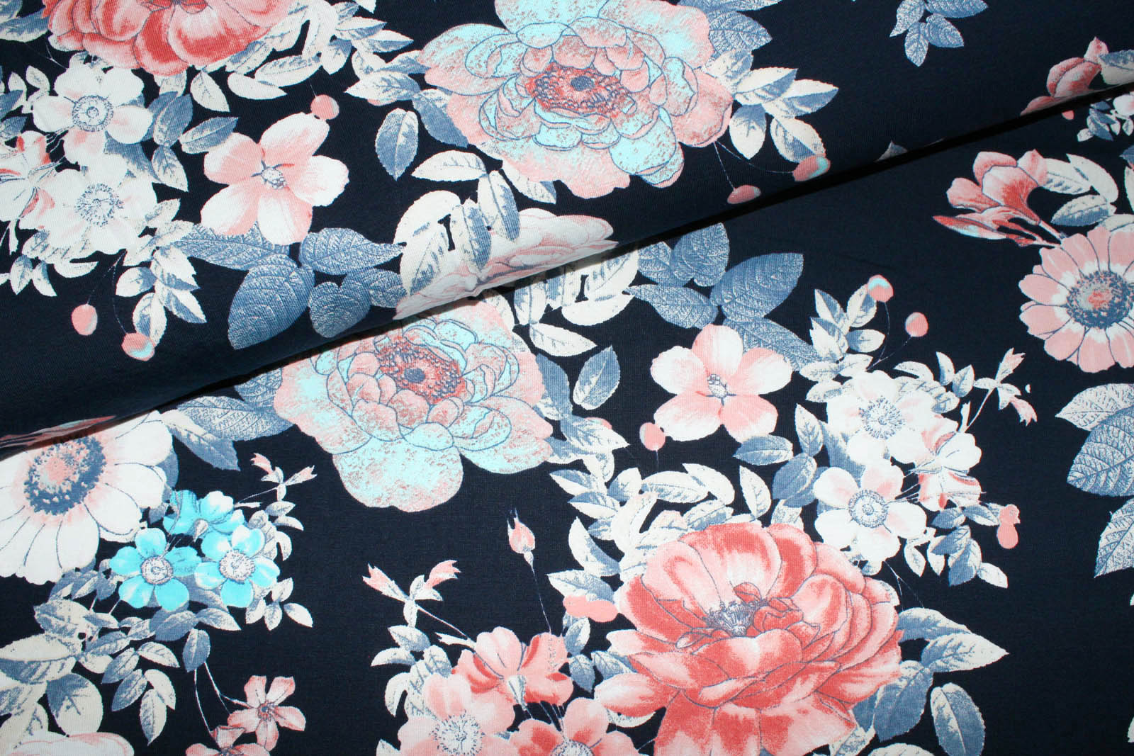 Schöner Jersey mit Blumen. Der Hintergrund ist nachtblau. Super geeignet für Shirts, Kleider, Beanies und co.