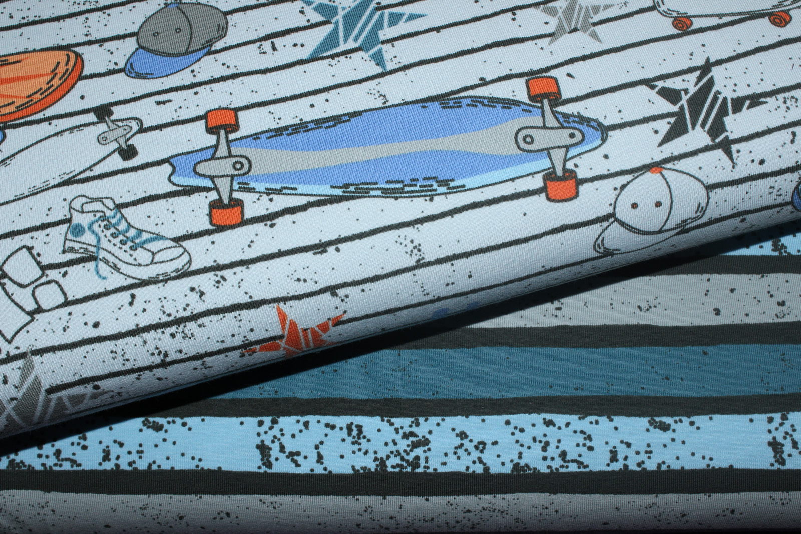 usw. Kombijersey zum Hauptstoff "Cool Boards" mit Streifen. Design "Blaubeerstern" alias Steffi Mitzscherling. Die Stoffe dieser Firma verarbeite ich selbst sehr gerne, da hier einfach die Qualität absolut stimmt. Auf dem dritten Foto seht ihr zusätzlich den Hauptstoff, der aber nicht zum obigen Angebot gehört und nur der Inspiration dient. Ebenso verhält es sich mit den zusätzlichen Stoffen auf dem vierten Foto.