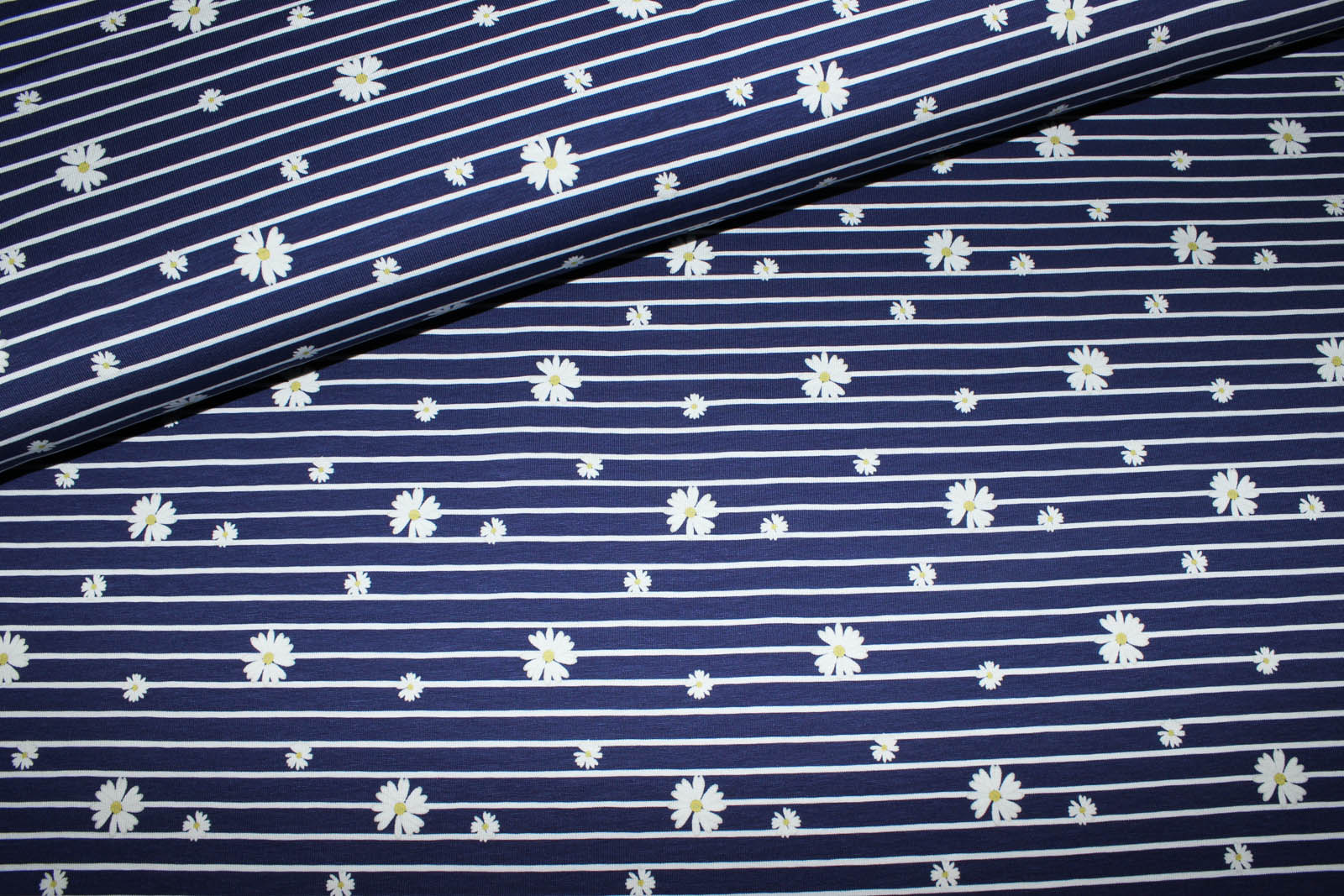 Hier biete ich Euch einen hochwertigen Jersey von "Fräulein von Julie" an. Der Untergrund ist dunkelblau/weiß gestreift. Die dunkelblauen Streifen sind ca. 8mm breit. Die weißen Streifen haben eine Breite von ca. 2 mm. Prima geeignet zum Nähen von Shirts, Kleidchen, Schlauchschals, Beanies, Pumphosen und co.