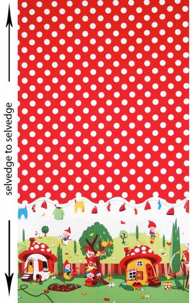 Ein wundervoller Klassiker jetzt auch auf Jersey. "Gnomville" von Michael Miller. An der einen Strickkante tummeln sich Pilze, Zwerge und andere niedliche Dinge. Über die komplette Breite des Stoffes ist einmal das Motiv als Bordüre mit ca. 38cm Höhe enthalten, der Rest mit einer Breite von ca. 110 Zentimeter sind weiße Punkte auf rotem Untergrund. Die Punkte haben einen Durchmesser von ca. 2 cm. Damit nicht die Pilze mittendrin zerschnitten sind, verkaufen wir den Stoff in Rapporten. Ein Rapport beträgt ca. 49 cm. Die Stoffe auf dem fünften Foto gehören nicht zum Angebot, sondern dienen der Inspiration.