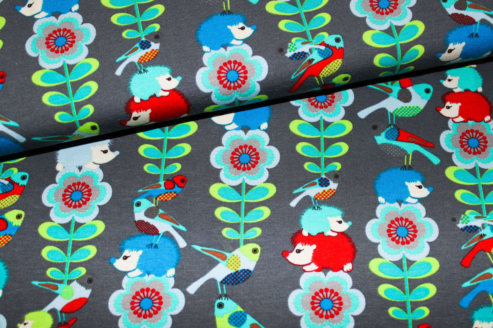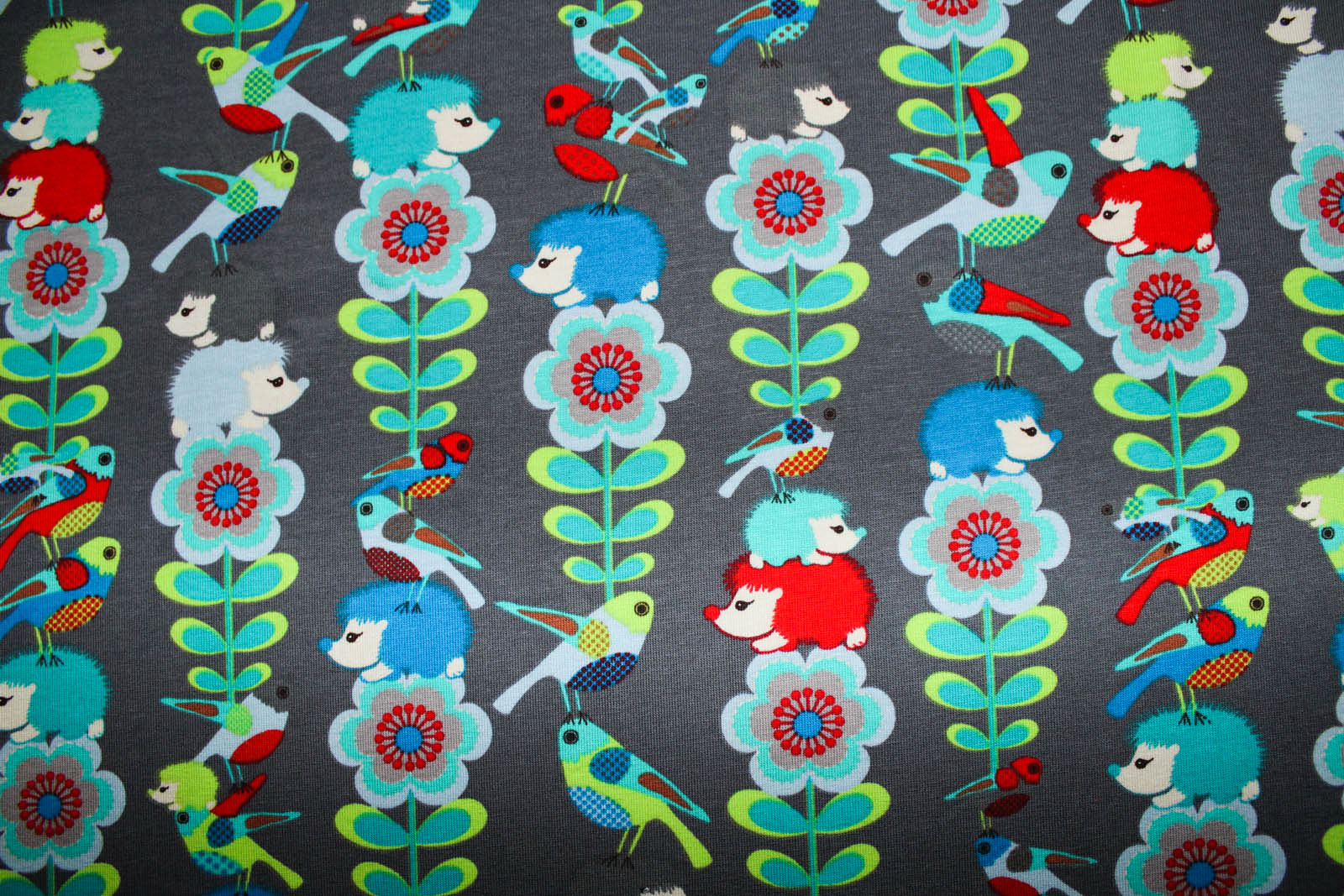 Schöner Jersey mit Blumen und Tieren. Der Untergrund ist grau. Super geeignet für Shirts, Beanies, Pumphosen und co.