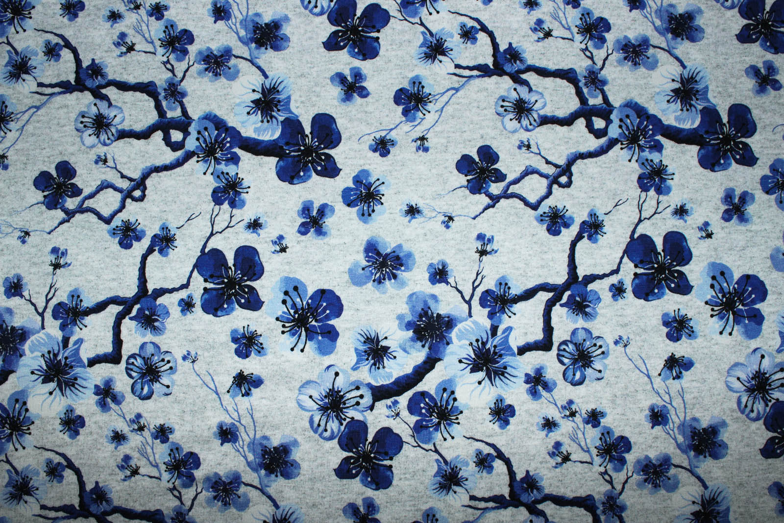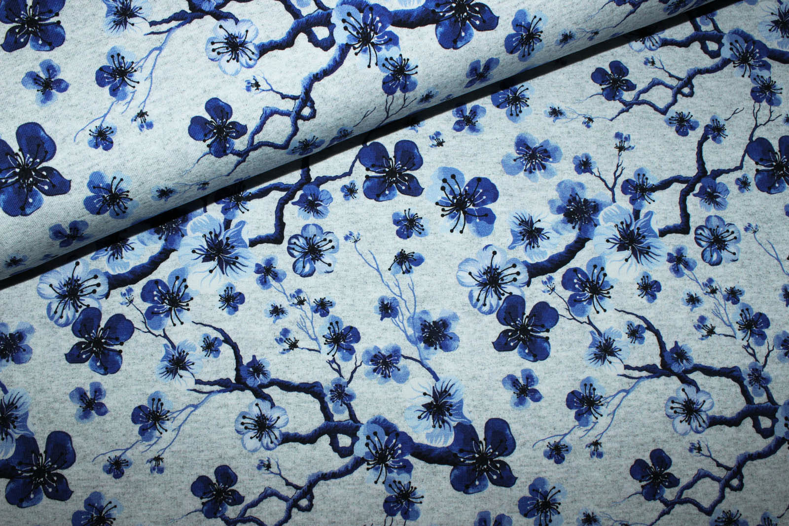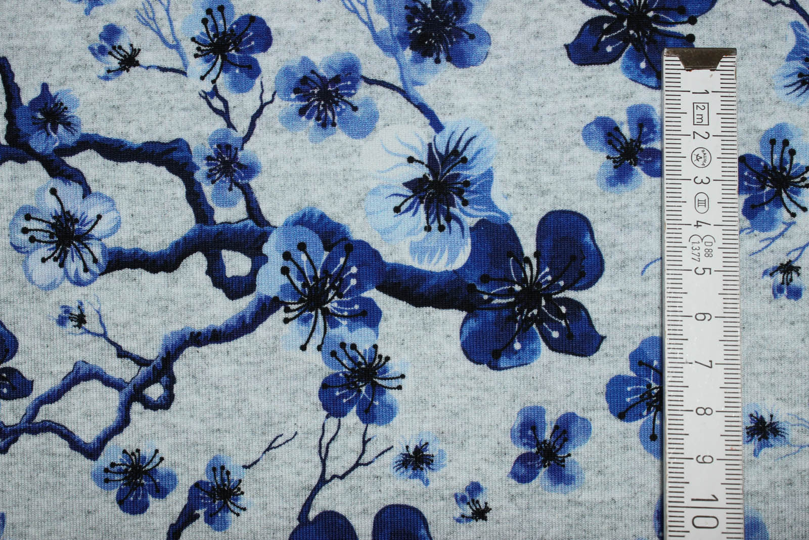 Hier biete ich Euch einen hochwertigen Jersey von "Fräulein von Julie" mit trendigen Kirschblütenzweigen an. Der Untergrund ist hellgrau meliert. Prima geeignet zum Nähen von Shirts, Kleidchen, Schlauchschals, Beanies, Pumphosen und co.