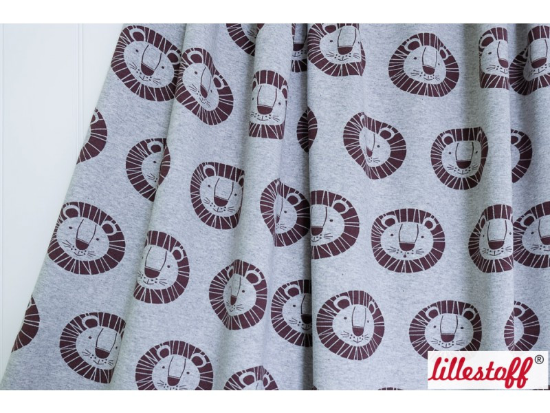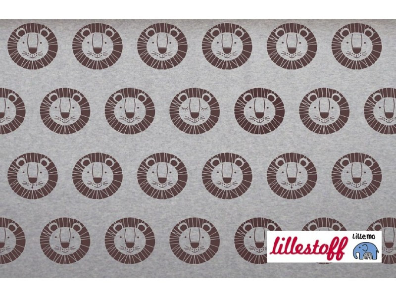 Süßer Jersey in graumelange mit braunen Löwenköpfen. Perfekt geeignet zum Nähen von Shirts, Pumphosen, Stramplern, Mützen und kleinen Dreieckstüchern uvm.