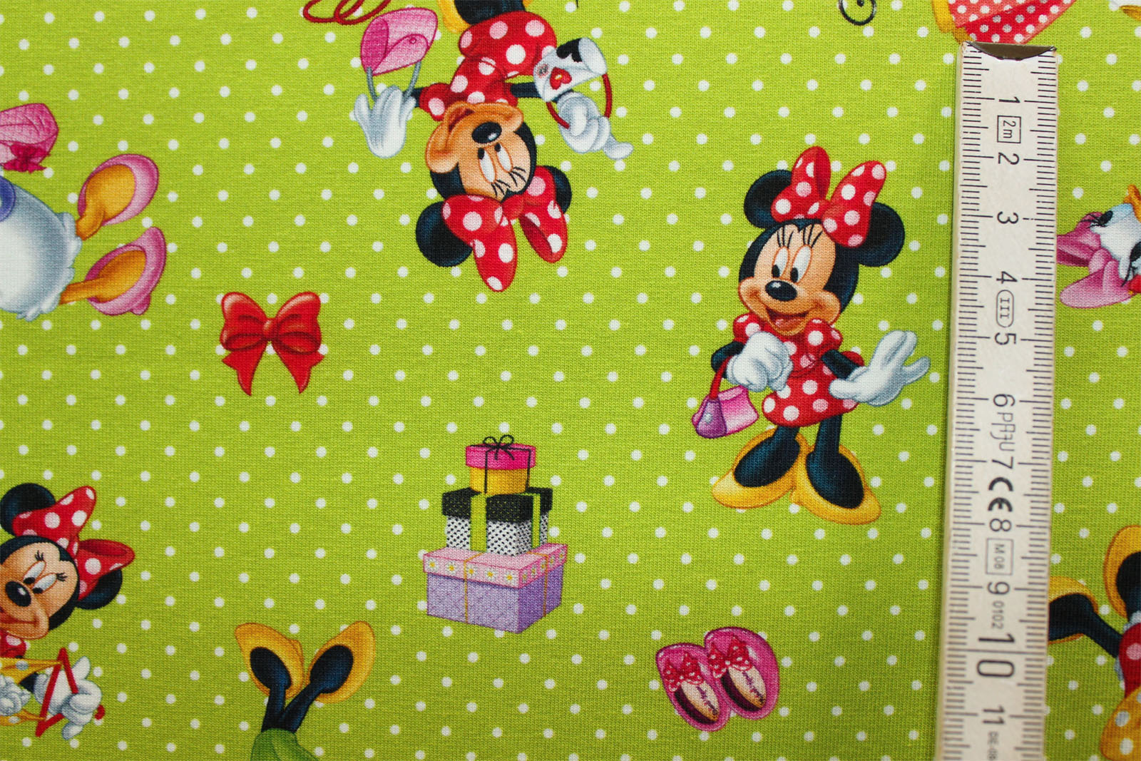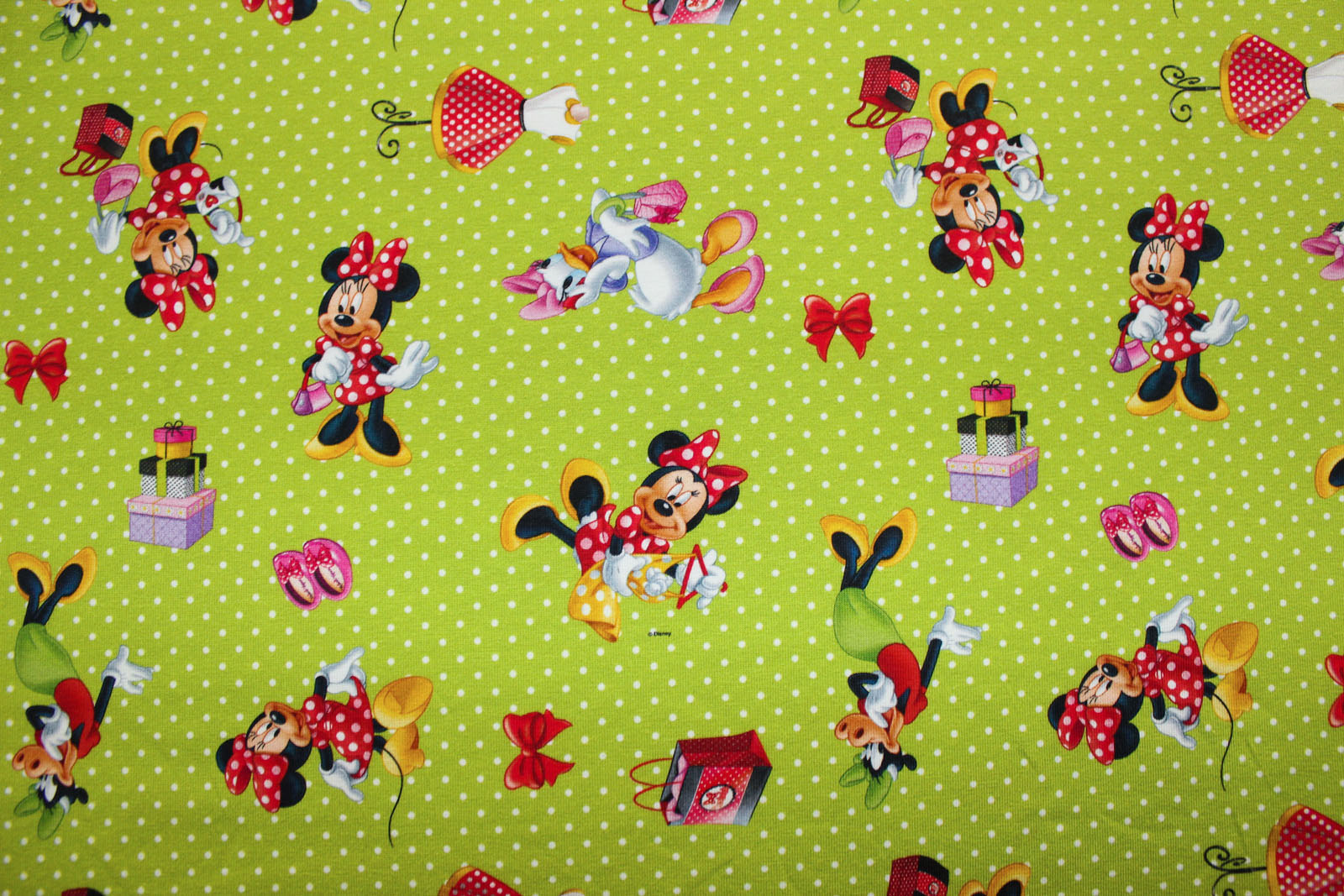 usw.Hier biete ich Euch einen tollen Lizenzjersey "Minnie Mouse" in grün mit weißen Punkten an. Dieser Stoff darf leider nicht für den gewerblichen Verkauf vernäht werden, da es ein Lizenzstoff ist und der Lizenzgeber dies nicht gestattet. Die Jerseys dieser Firma verarbeite ich selbst sehr gerne, da hier einfach die Qualität absolut stimmt. Es macht Spaß diesen Jersey zu verarbeiten- nichts verrutscht oder verzieht sich beim Nähen.
