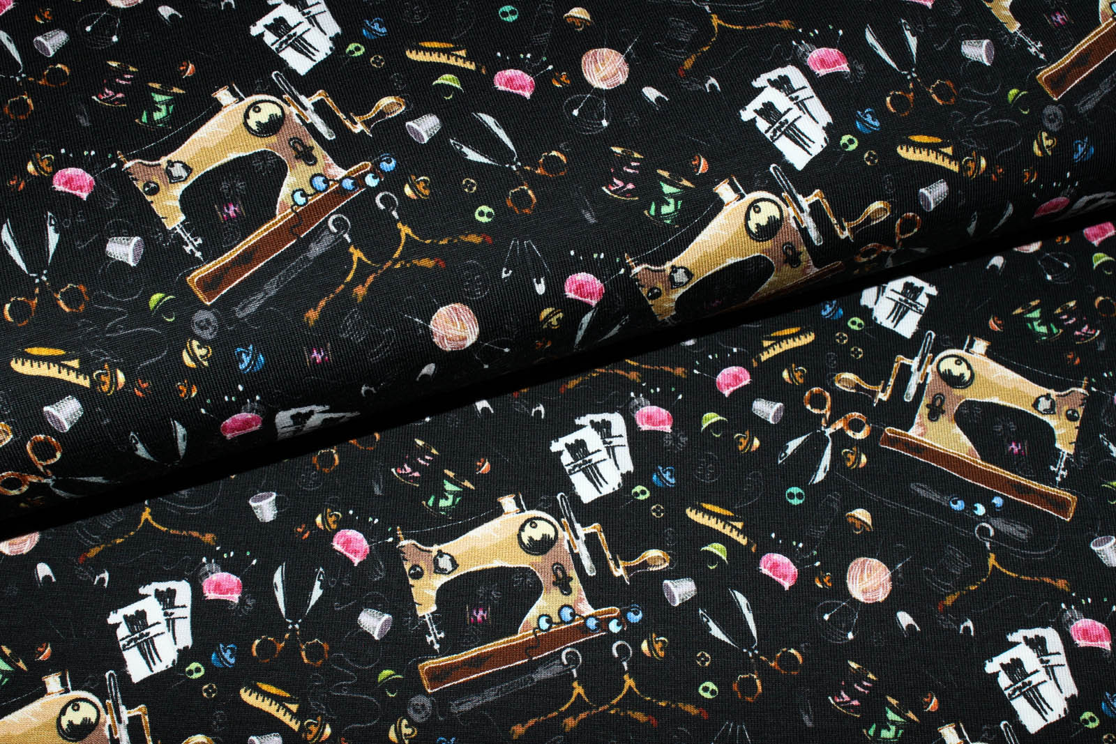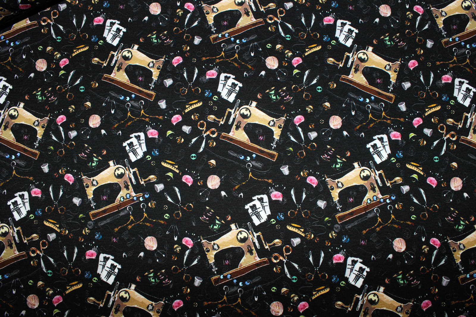 Hier biete ich Euch einen absolut traumhaften hochwertigen Jersey von "Fräulein von Julie" an. Mit Nähmaschinen, Garn, Schere, Fingerhut uvm. Die Nähmaschinen haben eine Größe von ca. 5,5 x 4,5 cm. Der Untergrund ist schwarz. Prima geeignet zum Nähen von Shirts, Kleidchen, Schlauchschals, Beanies, Pumphosen und co.