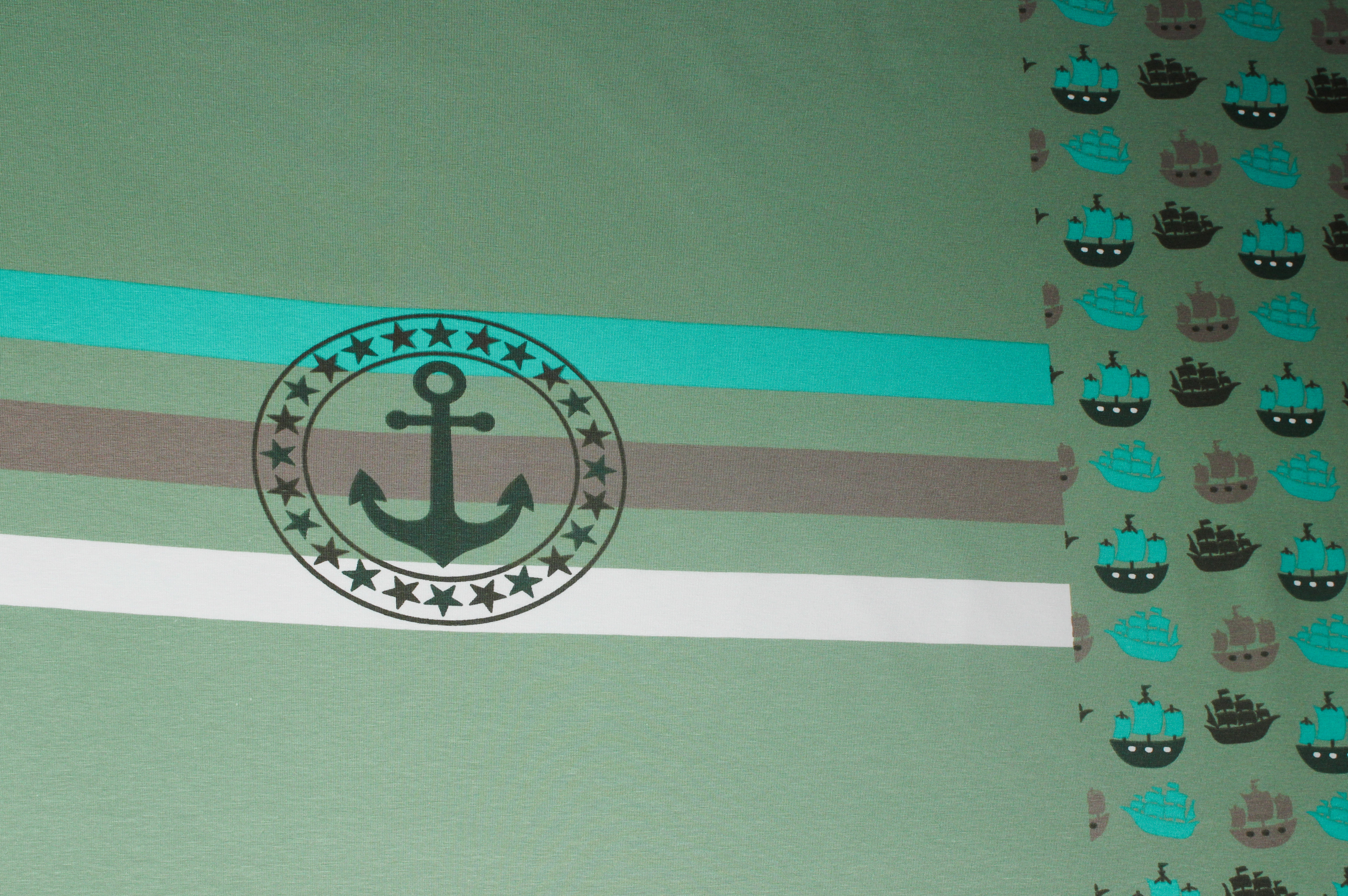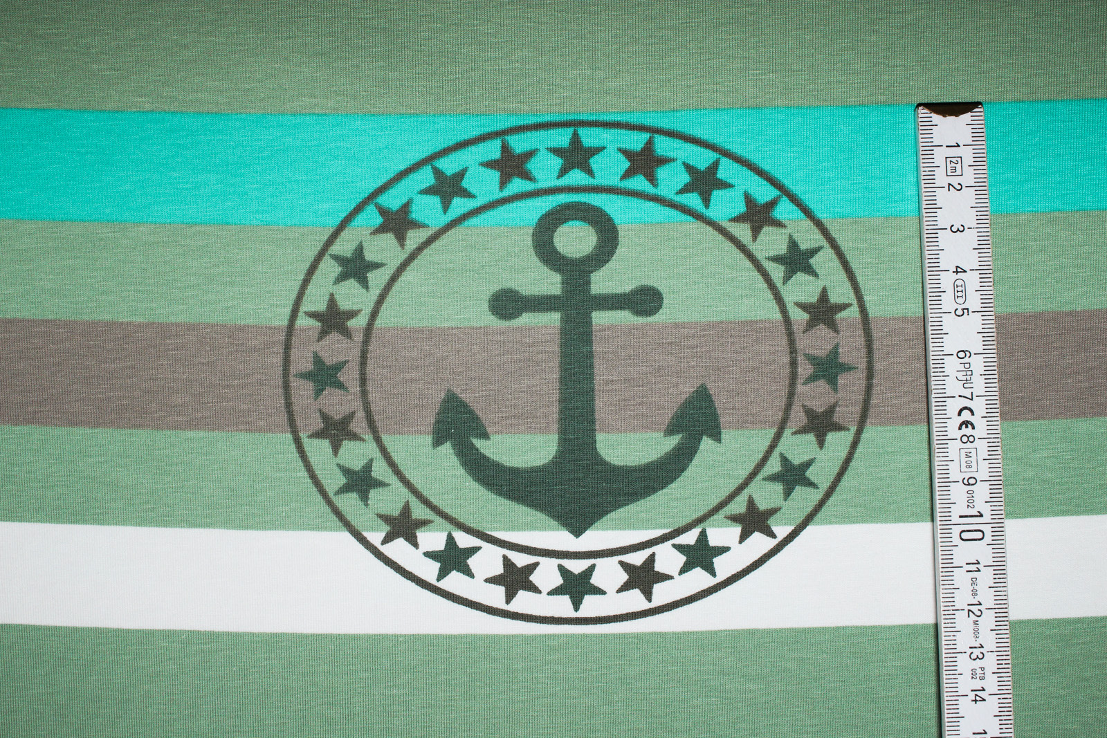 Jersey- Panel "Maritimes Feeling" grün. Ein Panel ist ca. 68-70 cm hoch. Ein Panel mit den Streifen und dem Anker ist ca. 50 cm breit. Die restliche Breite von ca. 1 Meter ist mit kleineren Schiffen bedruckt. Auf dem vierten Foto seht ihr eine Grafik der gesamten Stoffbreite. Daraus lässt sich super ein schönes maritimes Shirt nähen.