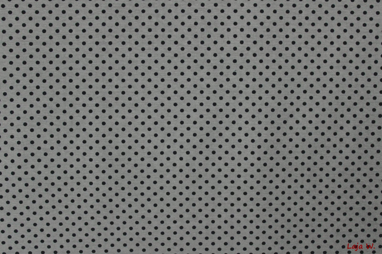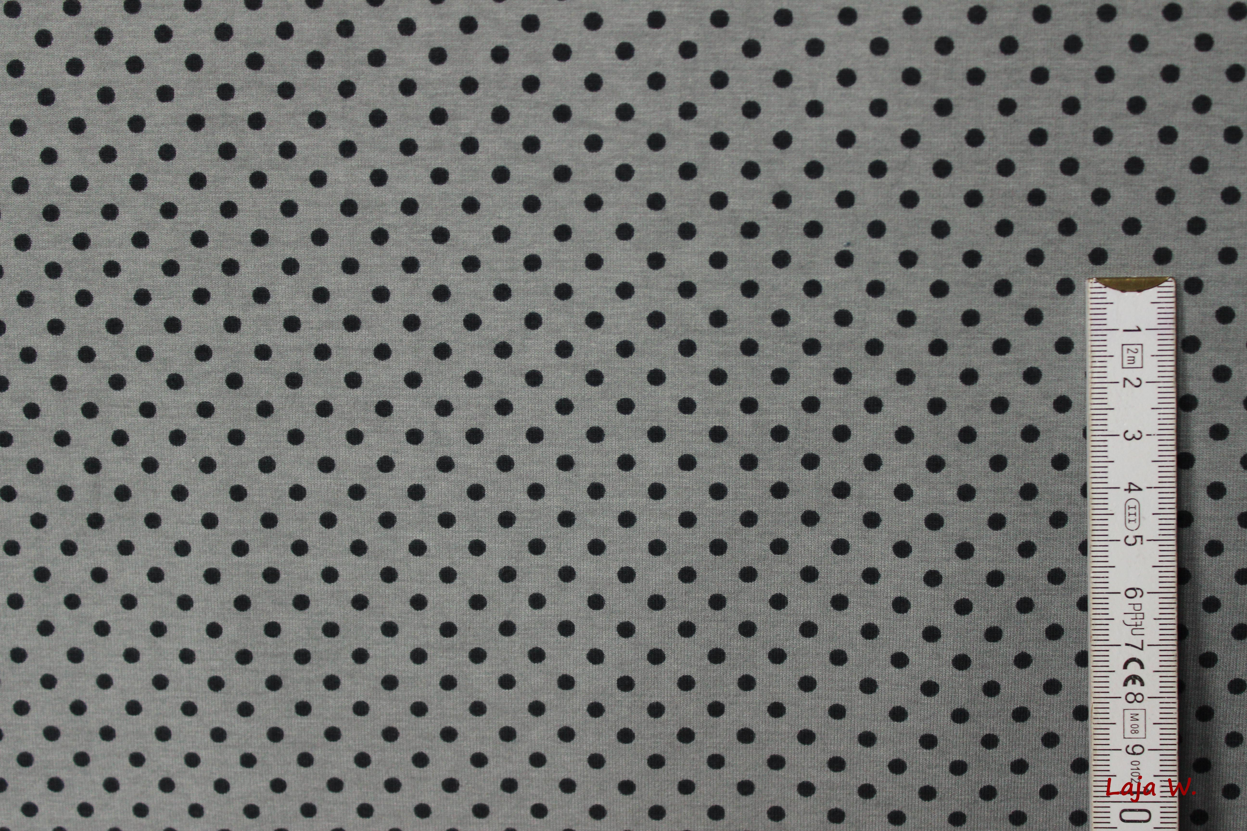 Hier biete ich Euch einen absolut hochwertigen, von der Haptik etwas festeren Jersey der Firma Hilco mit schwarzen Punkten auf grauem Grund an. Die Jerseys dieser Firma verarbeite ich selbst sehr gerne, da hier einfach die Qualität absolut stimmt. Es macht Spaß diesen Jersey zu verarbeiten- nichts verrutscht oder verzieht sich beim Nähen.