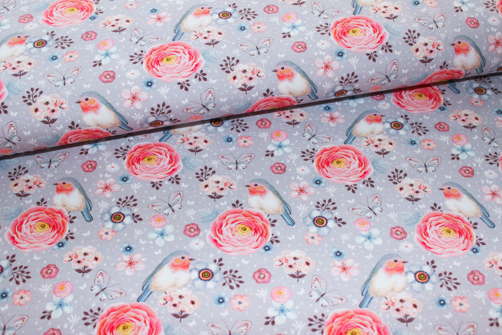 Hochwertiger, sommerlicher Jersey mit Rotkehlchen und Blüten. Untergrund grau. Ideal geeignet für Shirts, Beanies, Pumphosen und co. Andere Stoffe oder Designbeispiele auf weiteren Fotos gehören nicht zu diesem Angebot, sondern dienen der Inspiration.