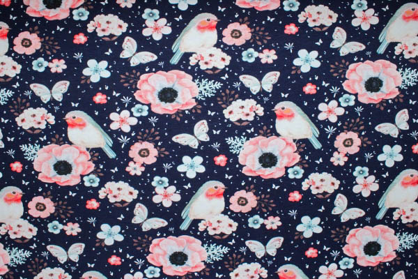 Hier biete ich Euch einen wunderschönen Jersey mit farbenfrohen Rotkehlchen und Blumen an. Prima geeignet zum Nähen von Shirts, Kleidchen, Schlauchschals, Beanies, Pumphosen und co.