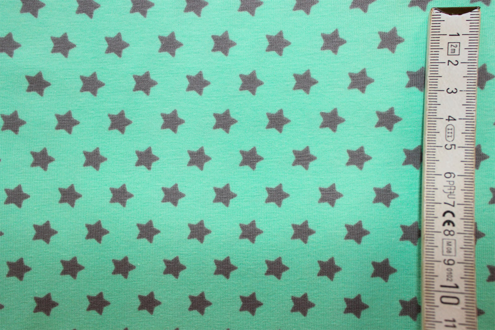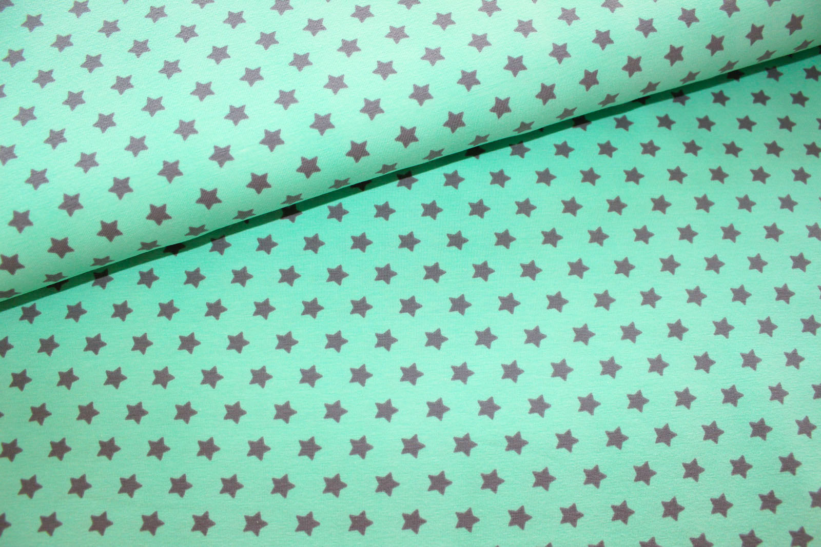 Hier biete ich Euch einen Jersey mit Sternen an. Die Sterne haben eine Größe von ca. 1 cm. Der Untergrund ist mint.