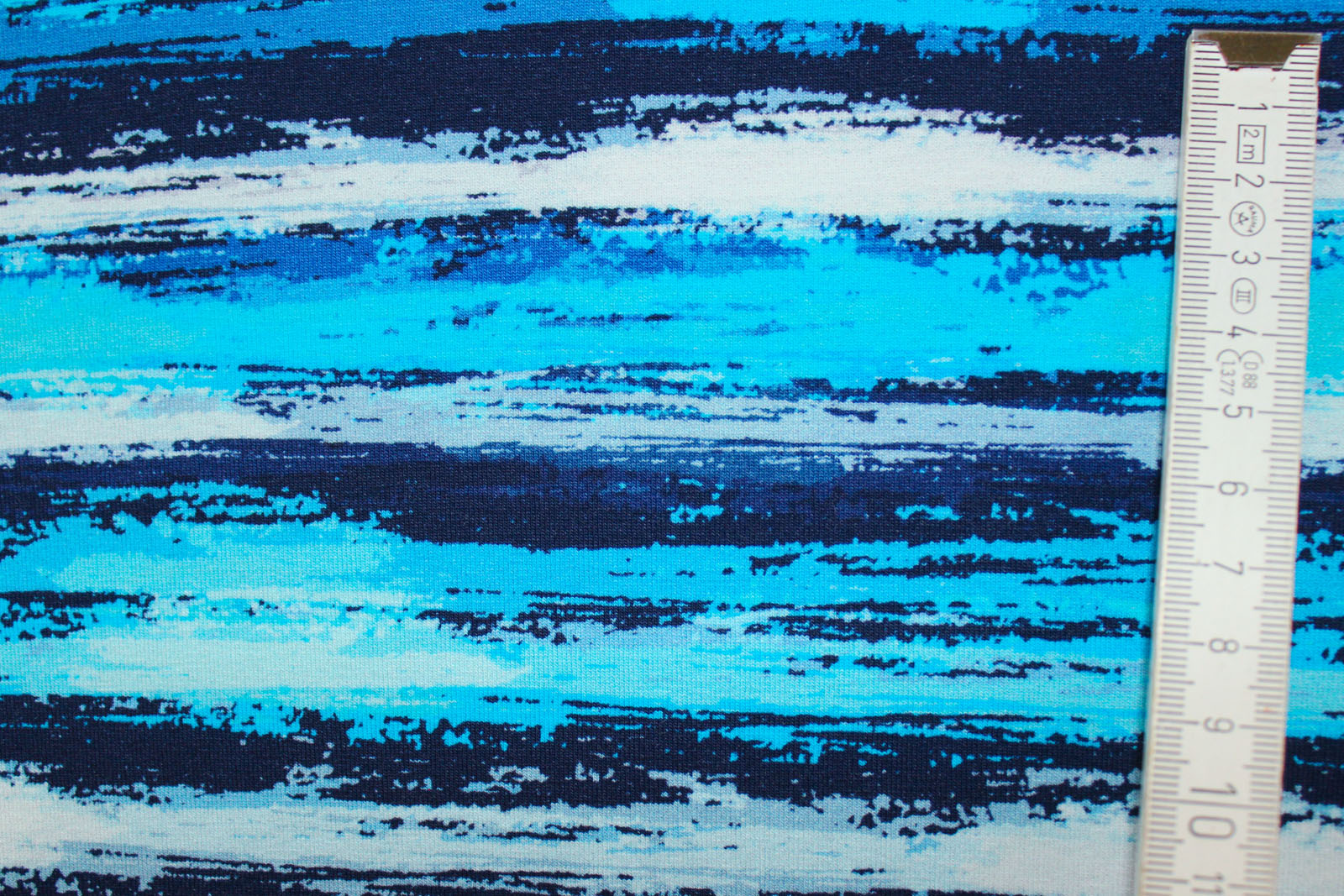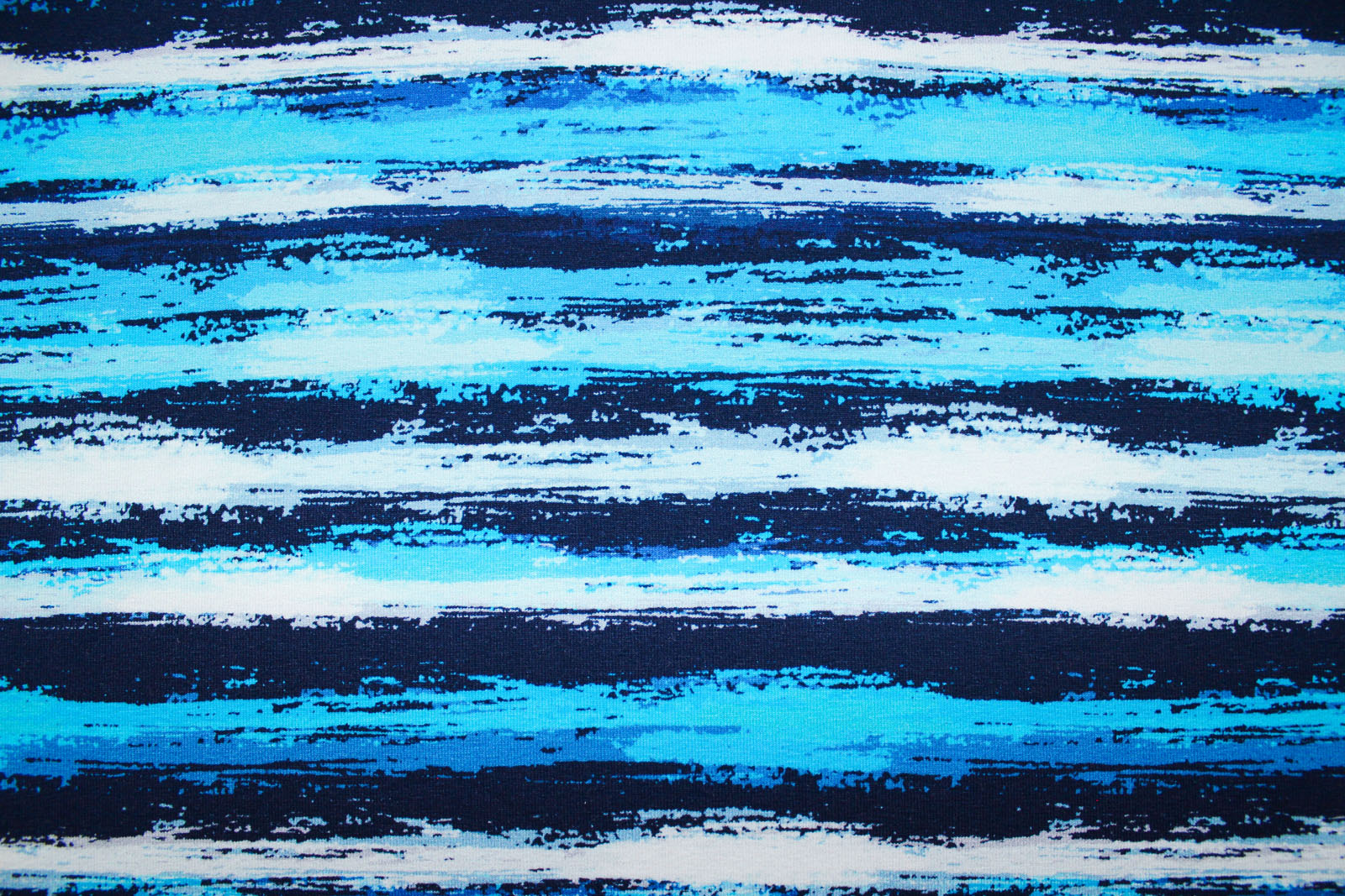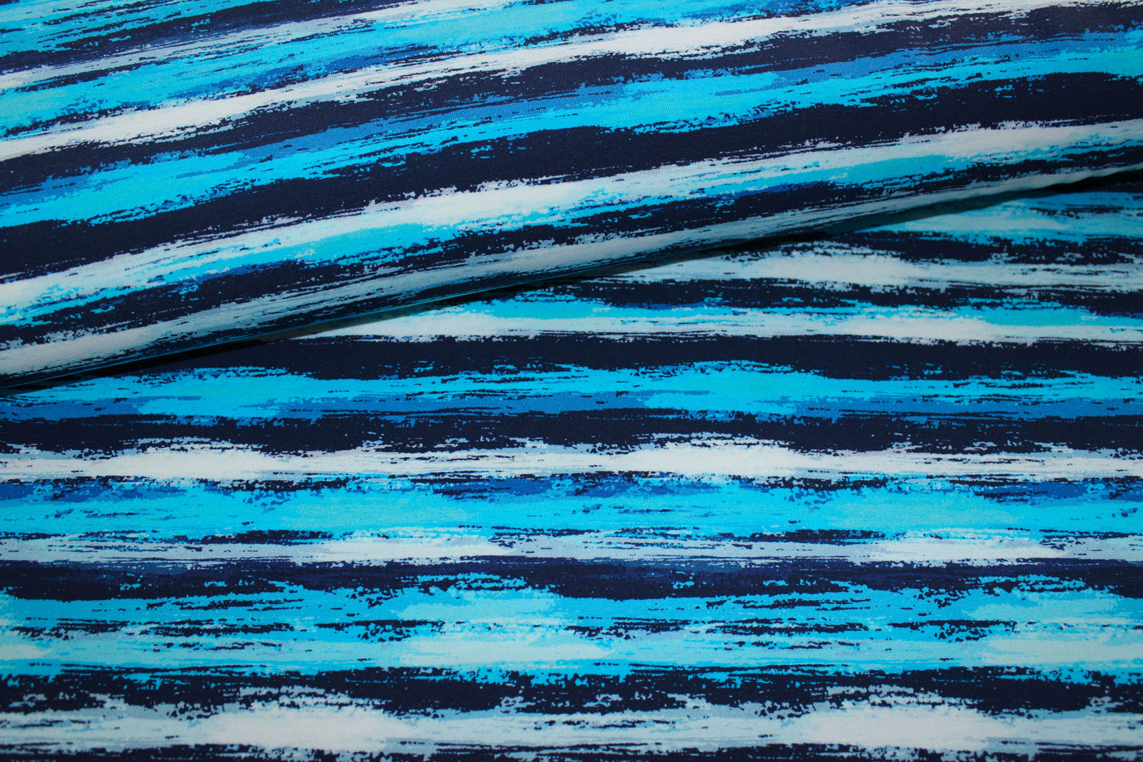 Cooler, hochwertiger sommerlicher gestreifter Jersey in verschiedenen verwischten Blautonstreifen. Ideal geeignet für Shirts, Beanies, Pumphosen und co. Andere Stoffe oder Designbeispiele auf weiteren Fotos gehören nicht zu diesem Angebot, sondern dienen der Inspiration.