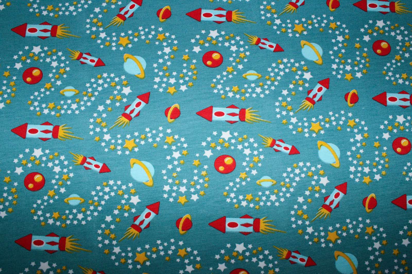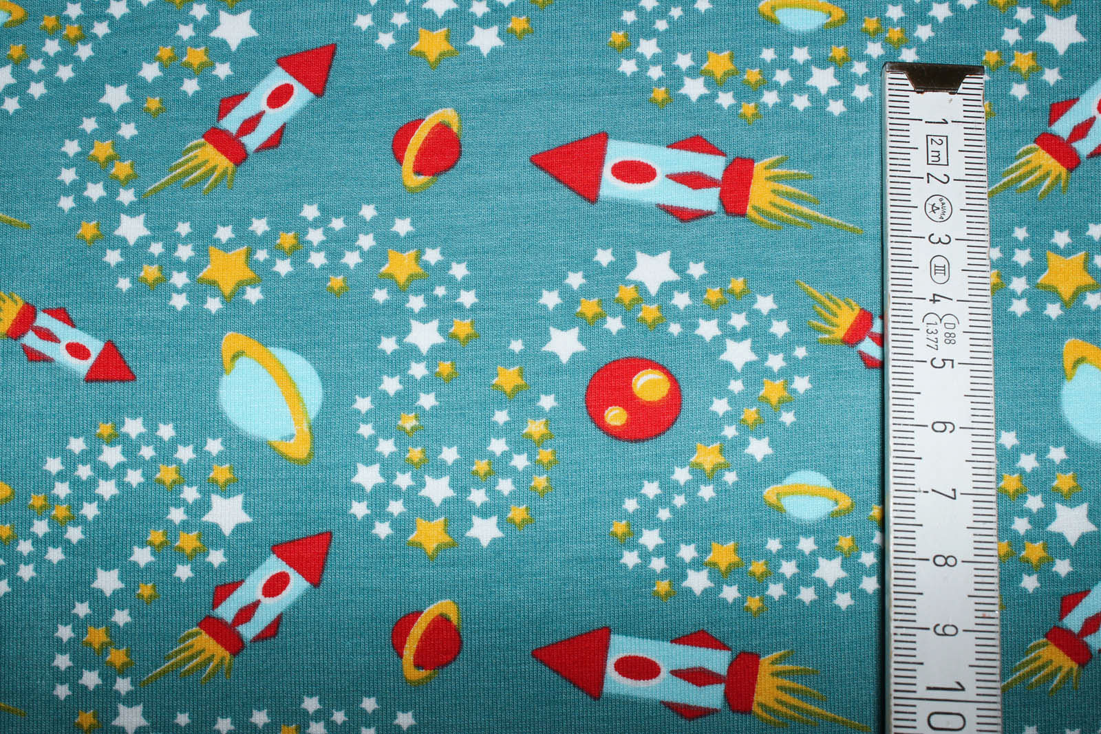 Süßer Jersey mit Raketen und Sternen. Der Untergrund ist ein gedecktes mint bzw. helles petrol. Perfekt geeignet für Shirts, Kleider, Beanies, Pumphosen und co.