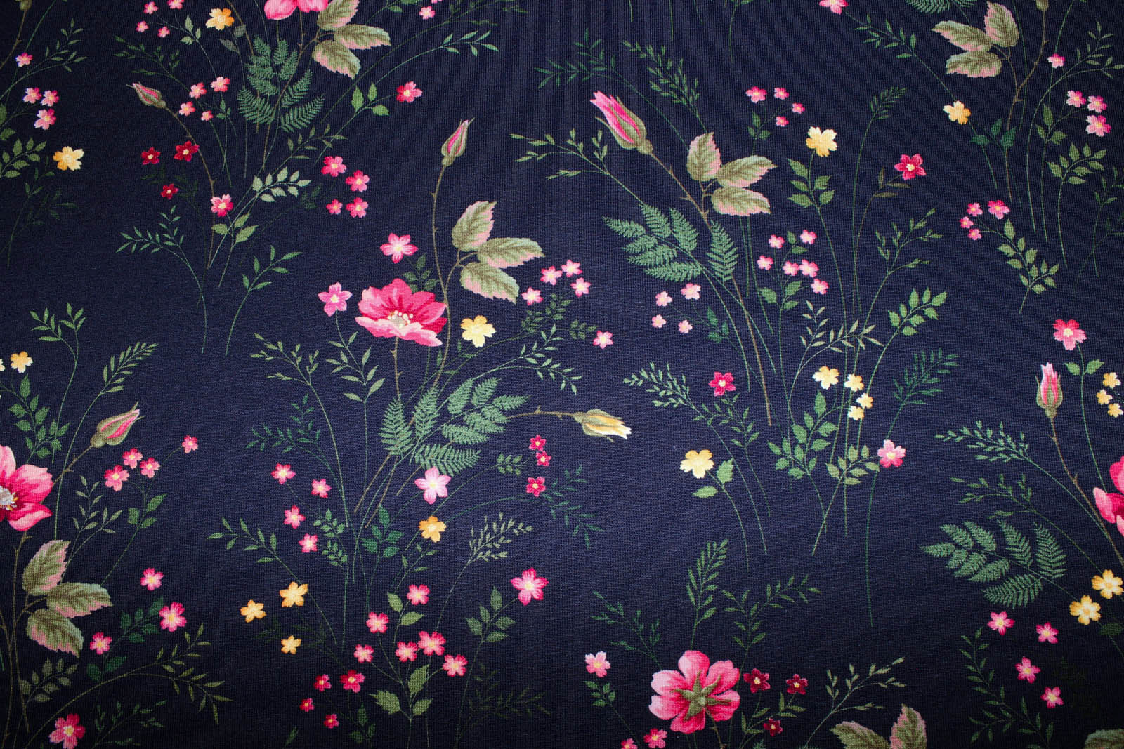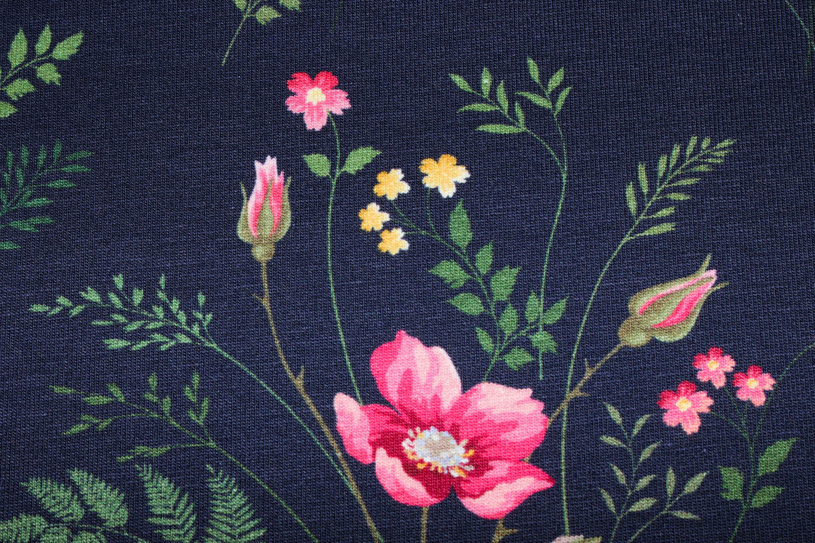 usw.Zauberhafter Jersey mit zarten Wildrosen und Blumen auf einem nachtblauen Untergrund. Der weitere Jersey auf dem fünften Foto gehört nicht zu diesem Angebot, sondern dient der Inspiration.