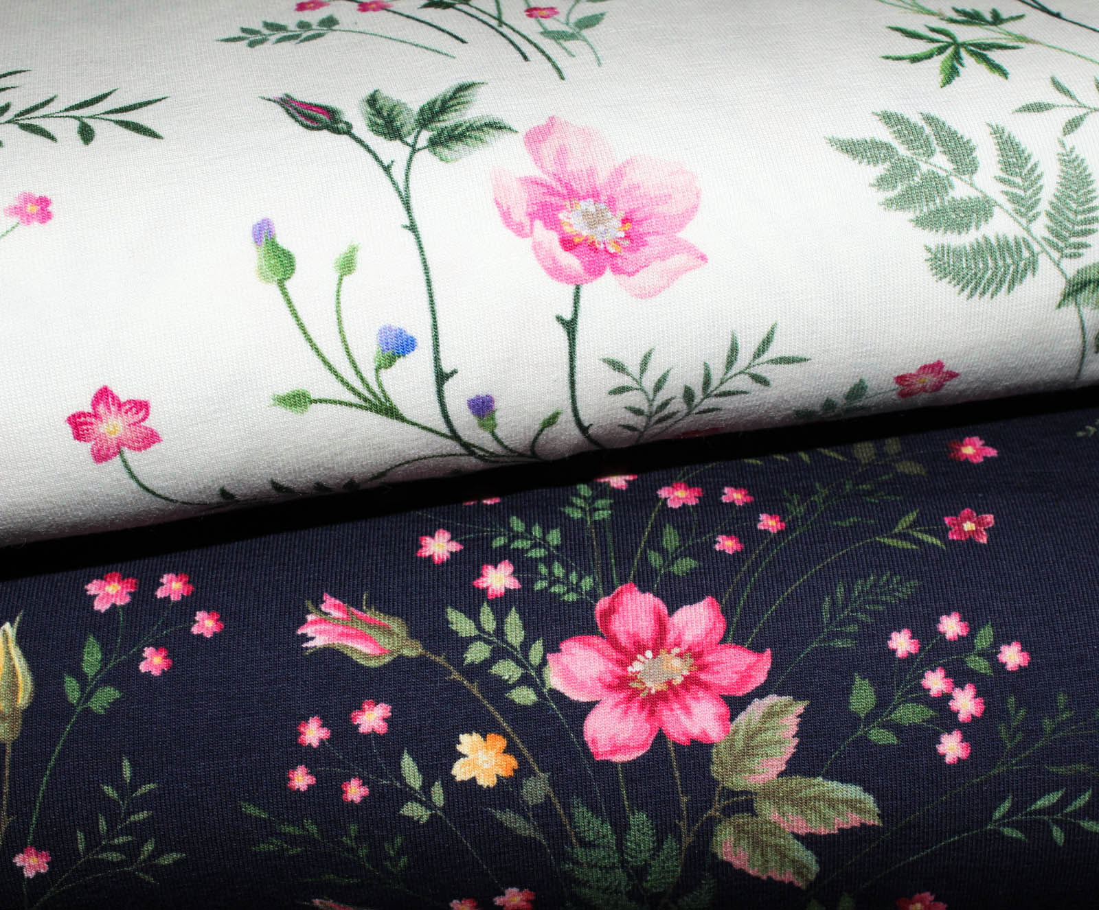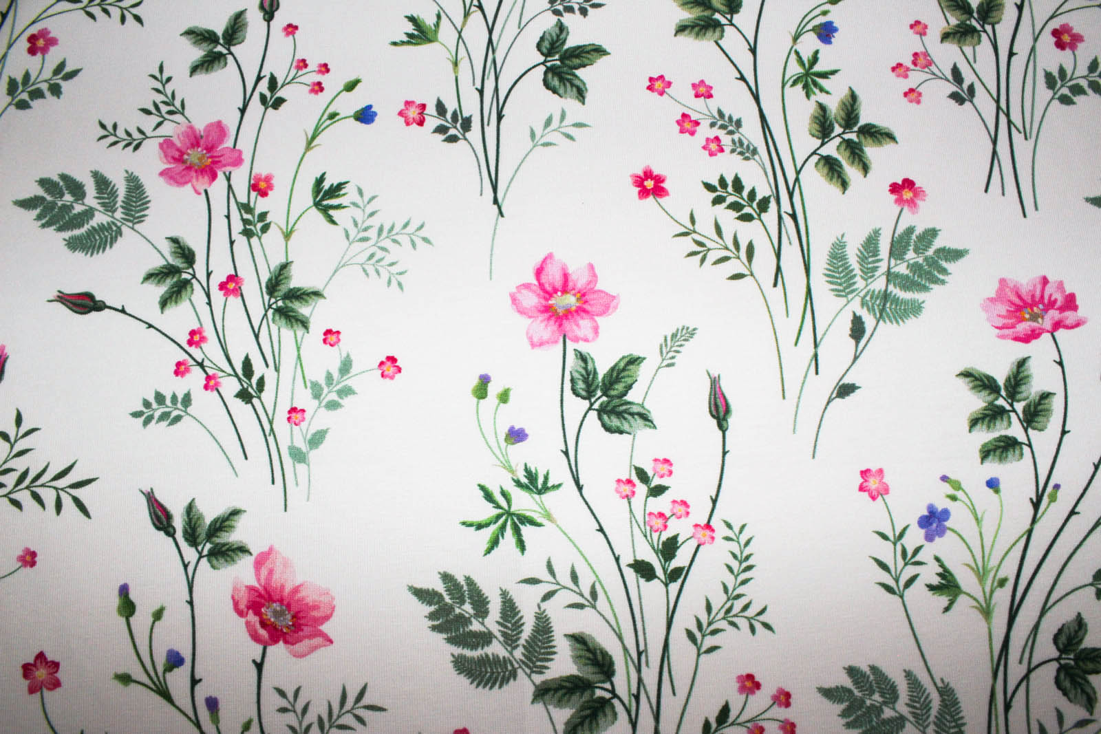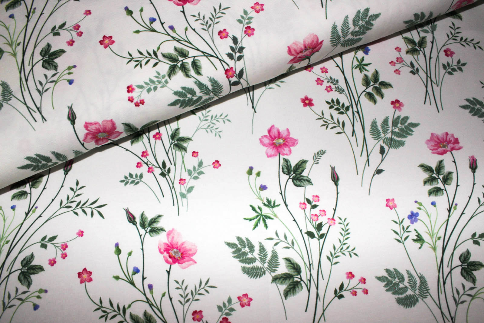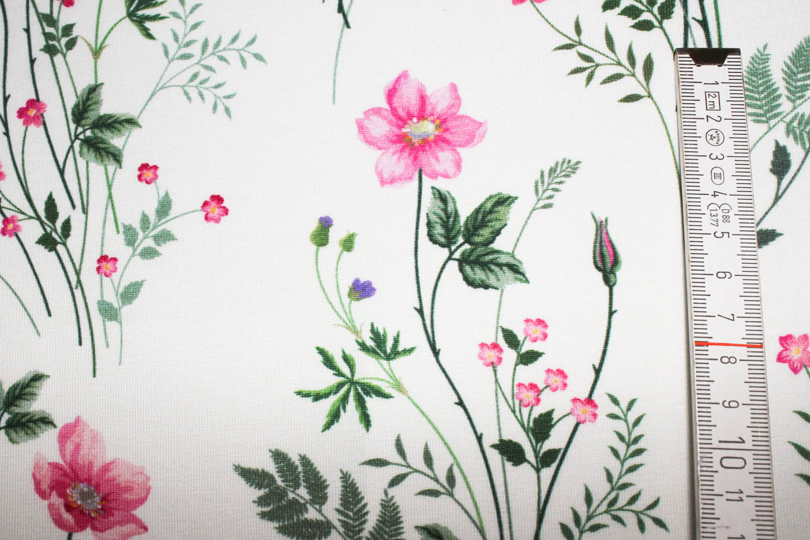usw.Zauberhafter Jersey mit zarten Wildrosen und Gräsern auf einem weißen Untergrund. Der weitere Jersey auf dem fünften Foto gehört nicht zu diesem Angebot, sondern dient der Inspiration.