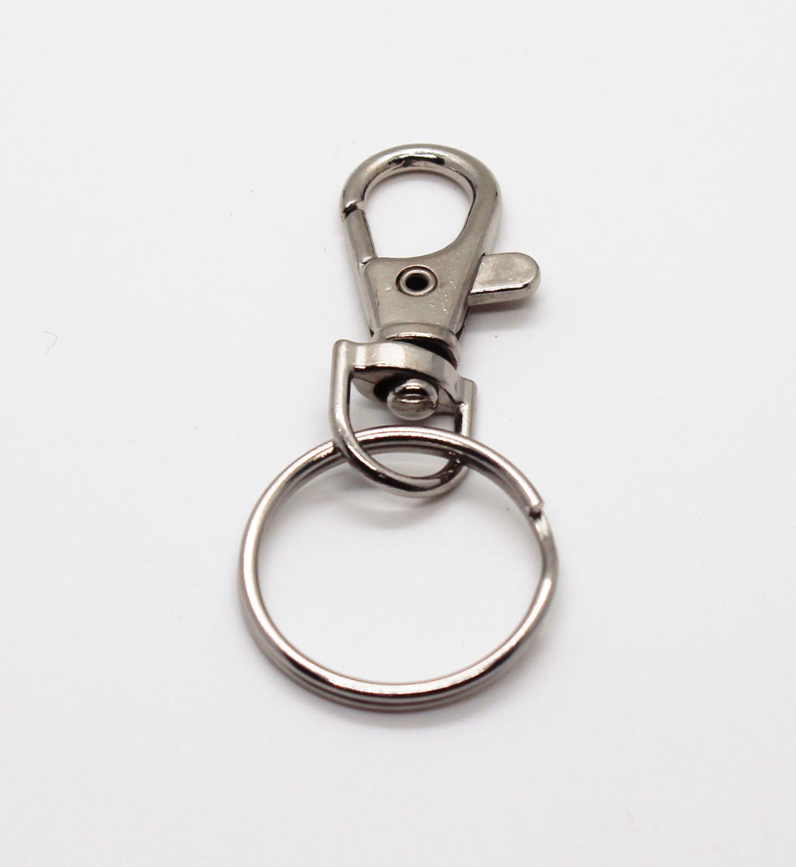Karabiner mit beweglichem, geraden Wirbel (vernickelt). Karabinerhaken 9 x 39 mm mit Schlüsselring 24 mm.