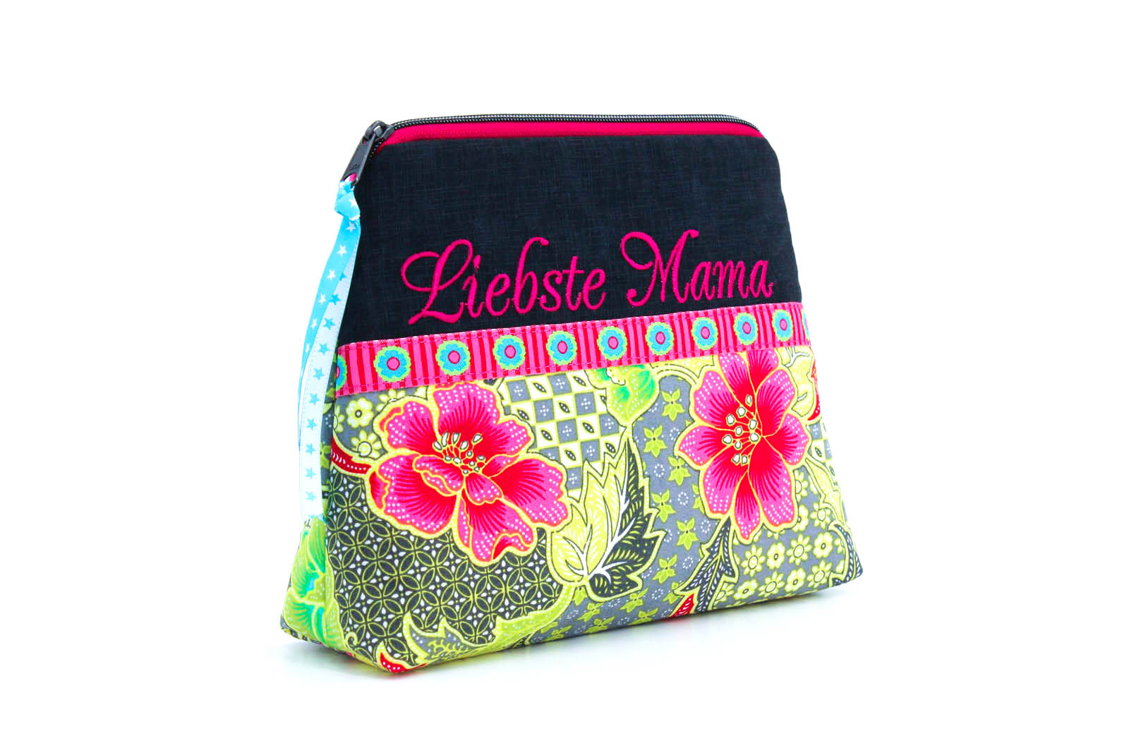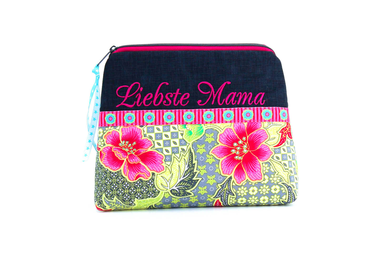 Fertig genähtes Kosmetiktäschchen, bestickt mit dem Schriftzug "Liebste Mama". Perfekt geeignet als Geschenk für die Mama zum Geburtstag zu Weihnachten usw. Damit das Täschchen einen gewissen Stand hat und angenehm von der Haptik ist, wurde es mit einem leichten Volumenvlies verstärkt. Der Stoffausschnitt kann je nach Zuschnitt leicht variieren, es wird aber immer schön und harmonisch aussehen. Diese Schminktasche besteht aus hochwertigen Baumwollwebstoffen, Volumenvlies, Reißverschluss mit metallisierter Kunststoffspirale und Webband.