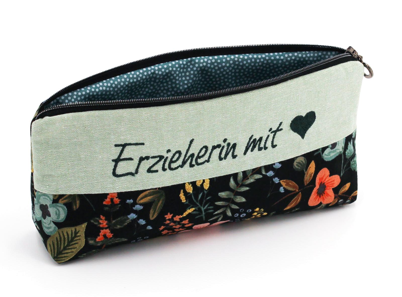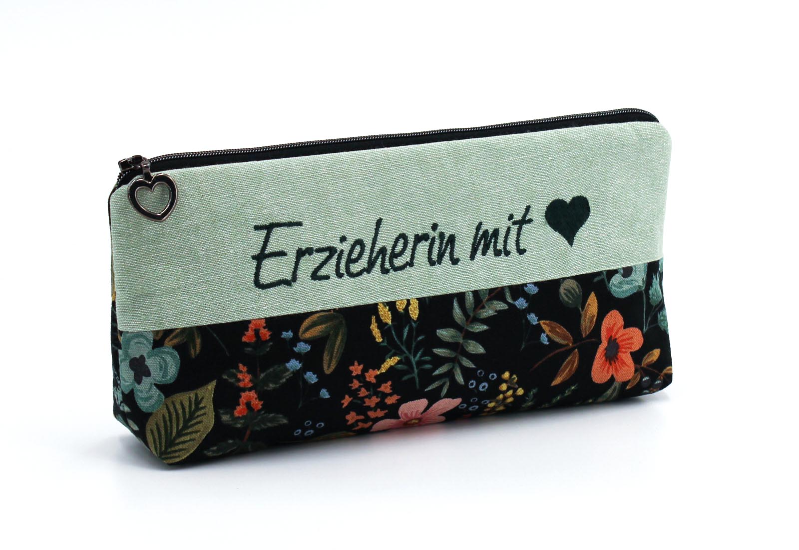 Entdecken Sie unser fertig genähtes Stiftemäppchen, liebevoll bestickt mit dem Schriftzug "Erzieherin mit ❤".