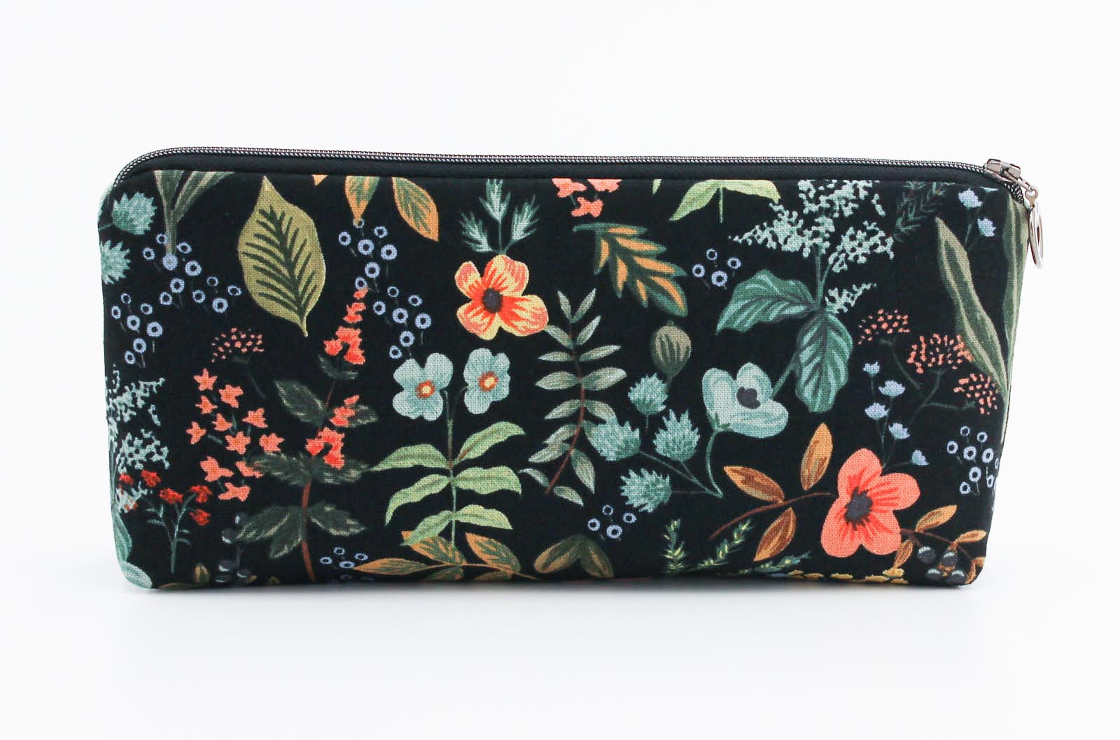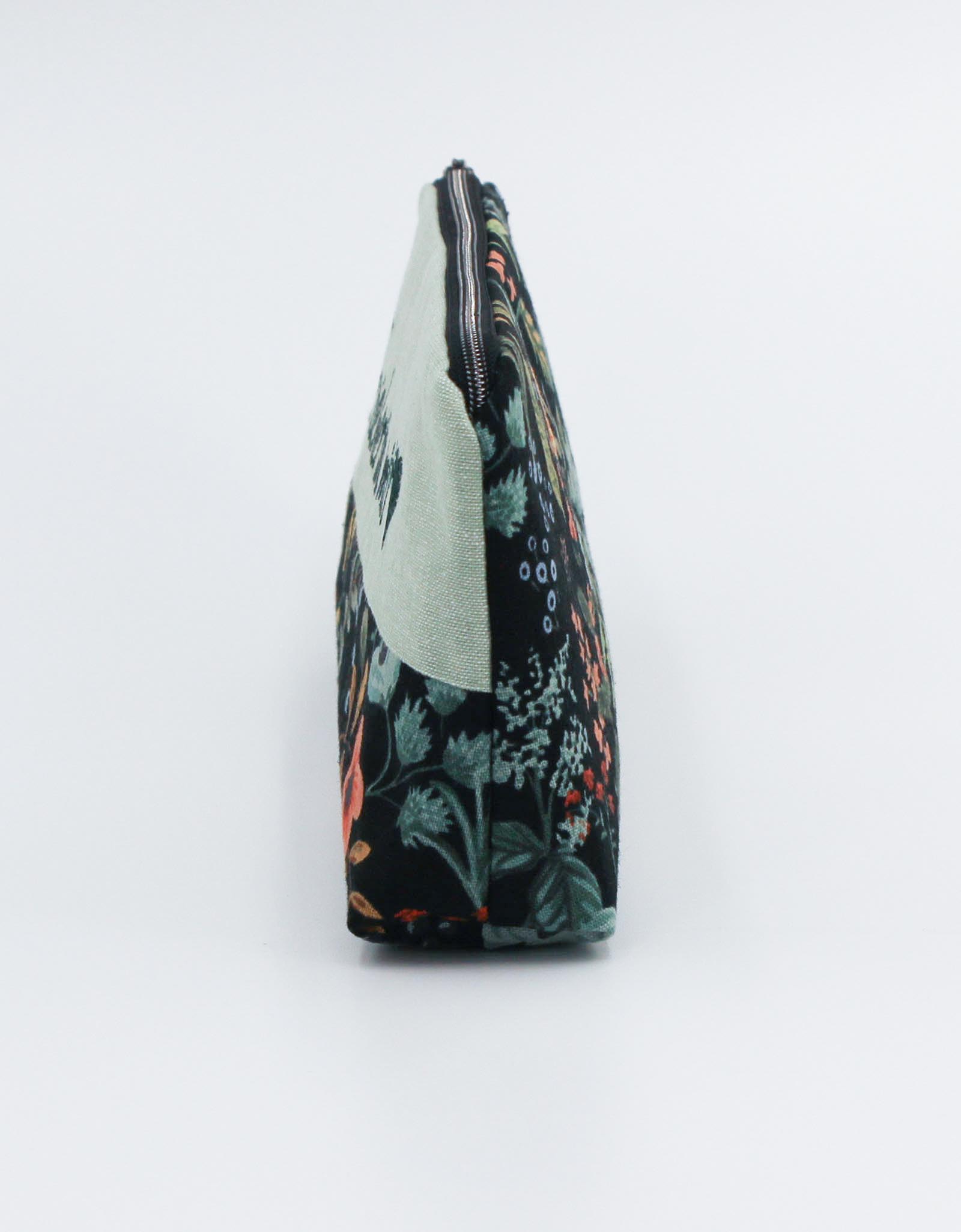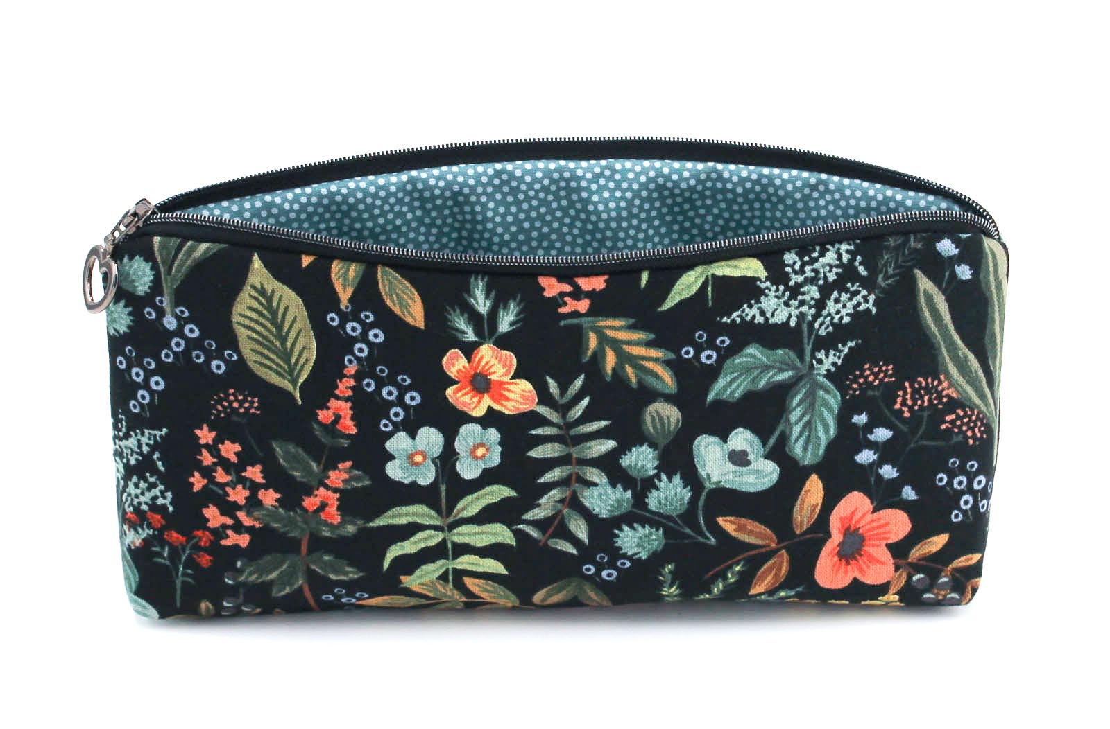 Für eine angenehme Haptik und einen stabilen Stand wurde das Mäppchen mit einem leichten Volumenvlies verstärkt. Diese Schminktasche besteht außen aus einem hochwertigen Baumwoll- Leinen Gemisch und einem Baumwollwebstoff, einem Baumwollwebstoff innen, Volumenvlies, einem Reißverschluss mit metallisierter Kunststoffspirale und einem Designschieber Herz.