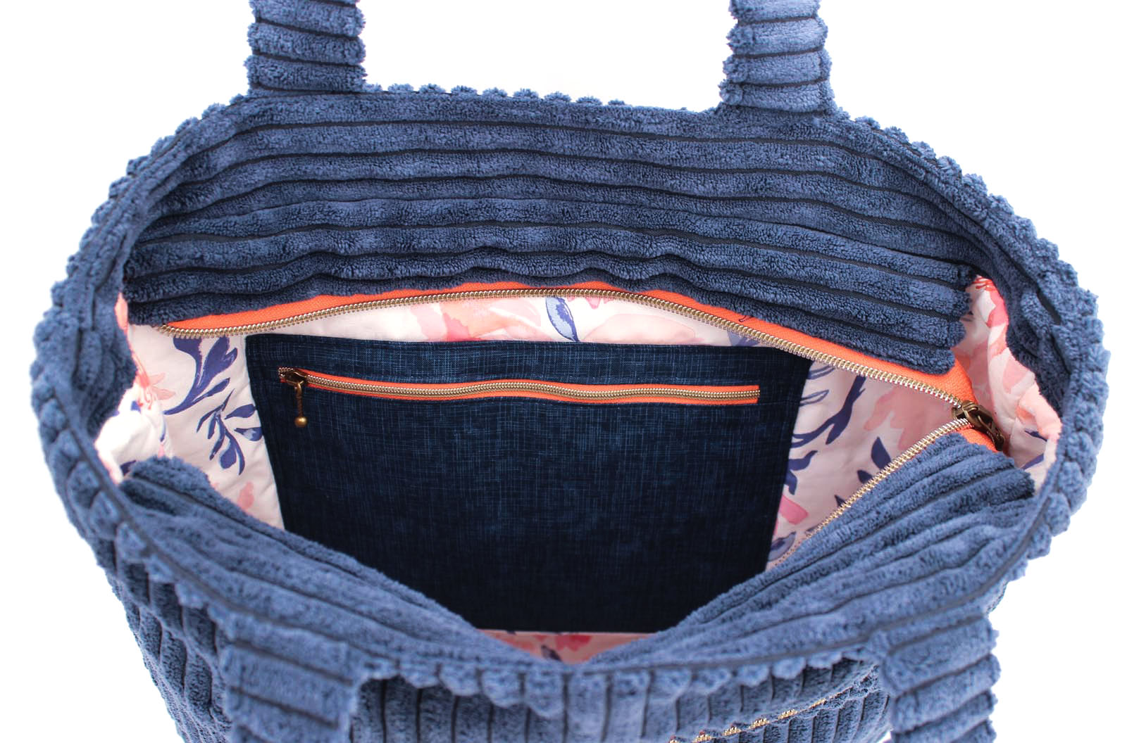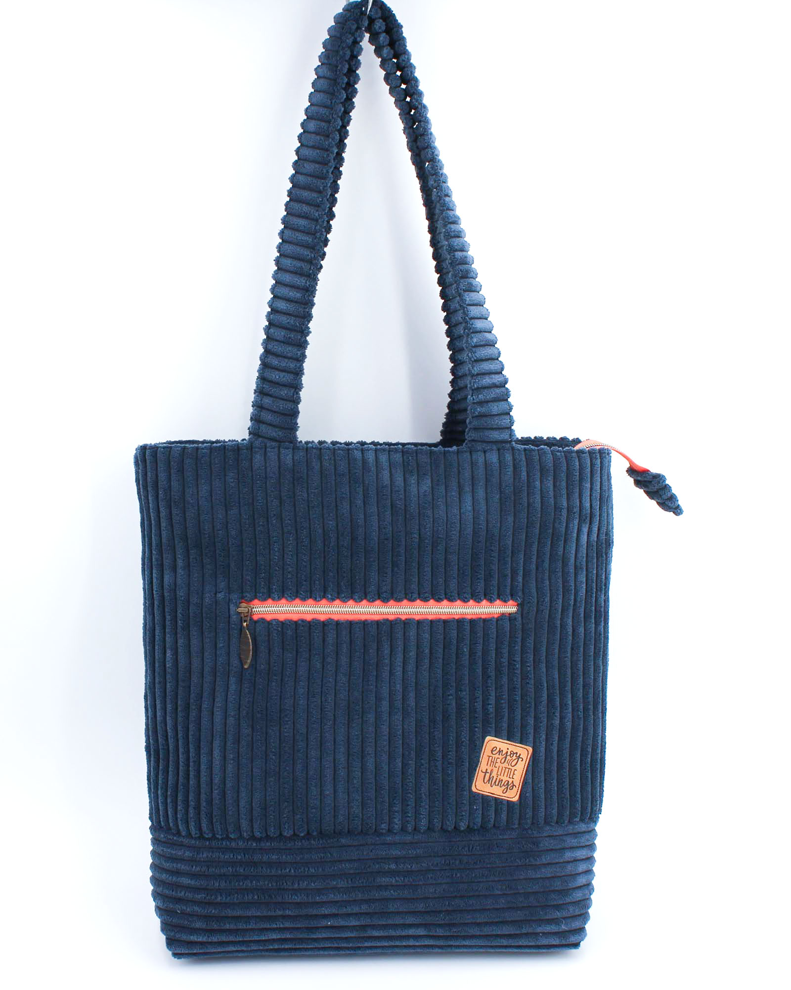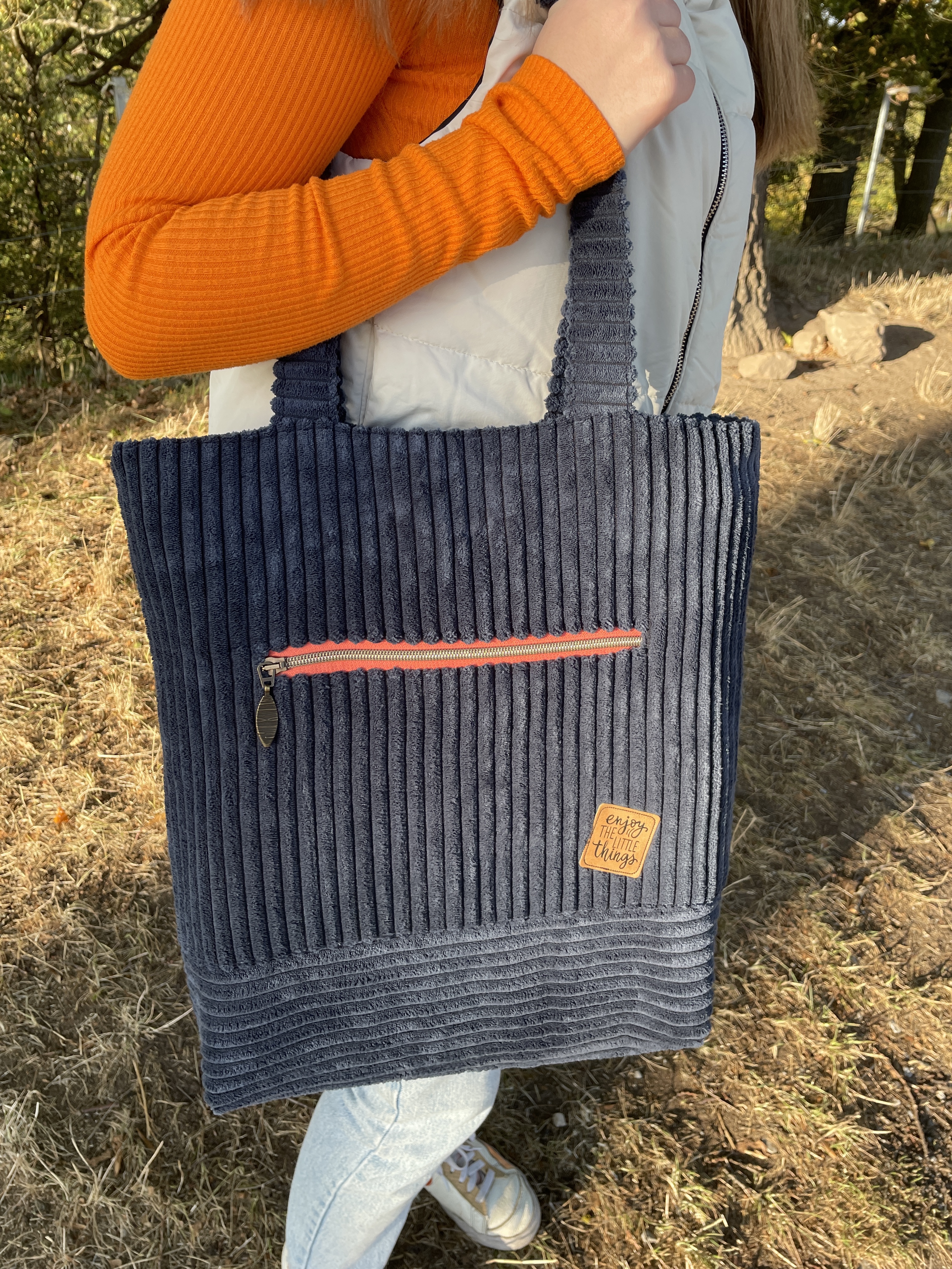 Trendiger geräumiger Shopper aus hochwertigem Polstercord, gefüttert mit US Designerbaumwollwebstoffen. Dieser Shopper wurde aus einem von der Haptik weichen aber sehr robustem Cord in Polsterqualität (Martindale > 90.000) genäht. Im Frontbereich befindet sich eine Außentaschen, die mit einem metallisierten Reißverschluss geschlossen ist. Innen befindet sich eine aufgesetzte Tasche. Die Tasche fasst sogar einen breiten Din A 4 Ordner und macht ihn so zu einem zuverlässigen Begleiter in der Uni, Schule und auf Arbeit. Der Shopper kann mit einem Reißverschluss geschlossen werden, siehe Fotos.
