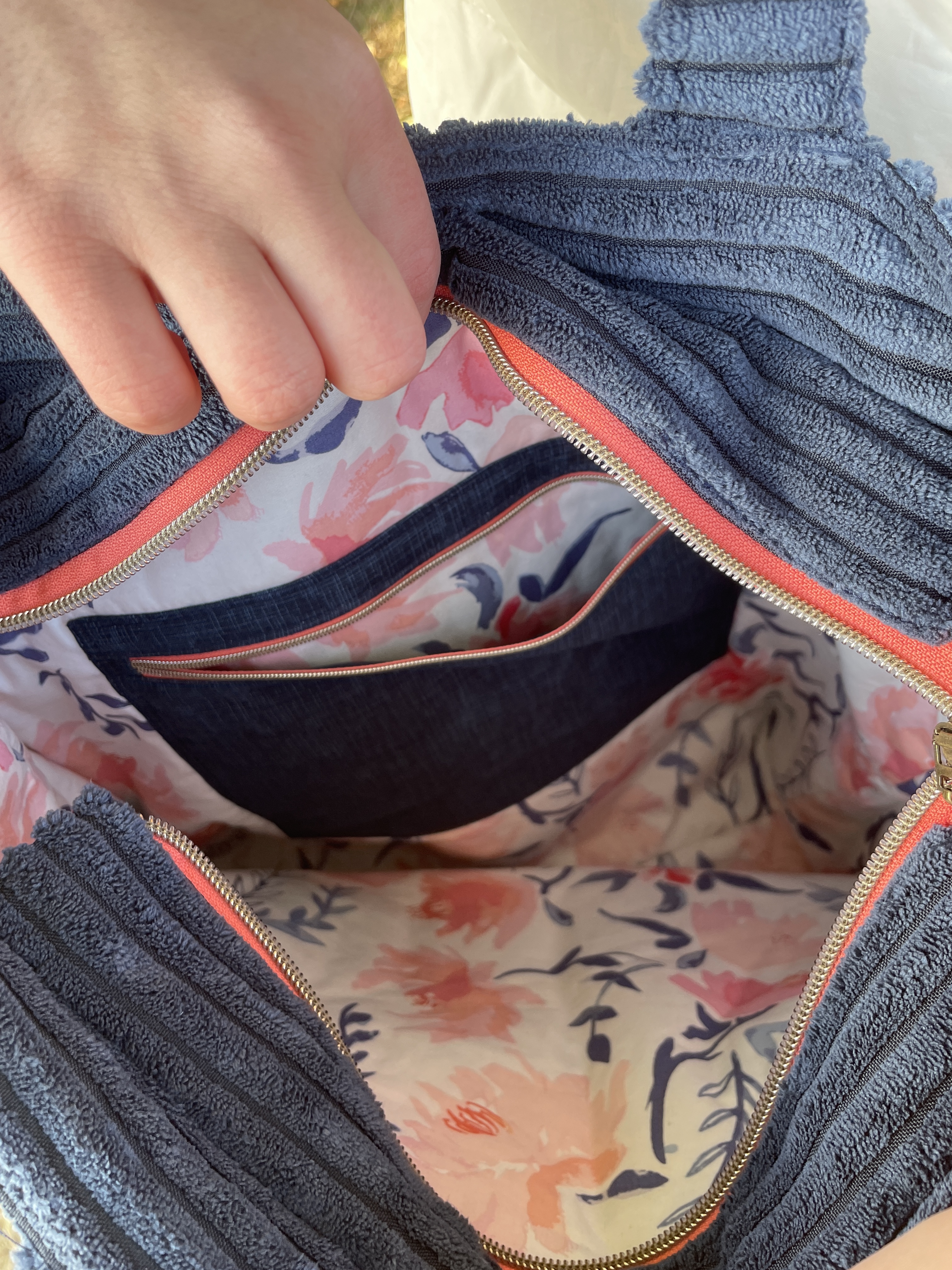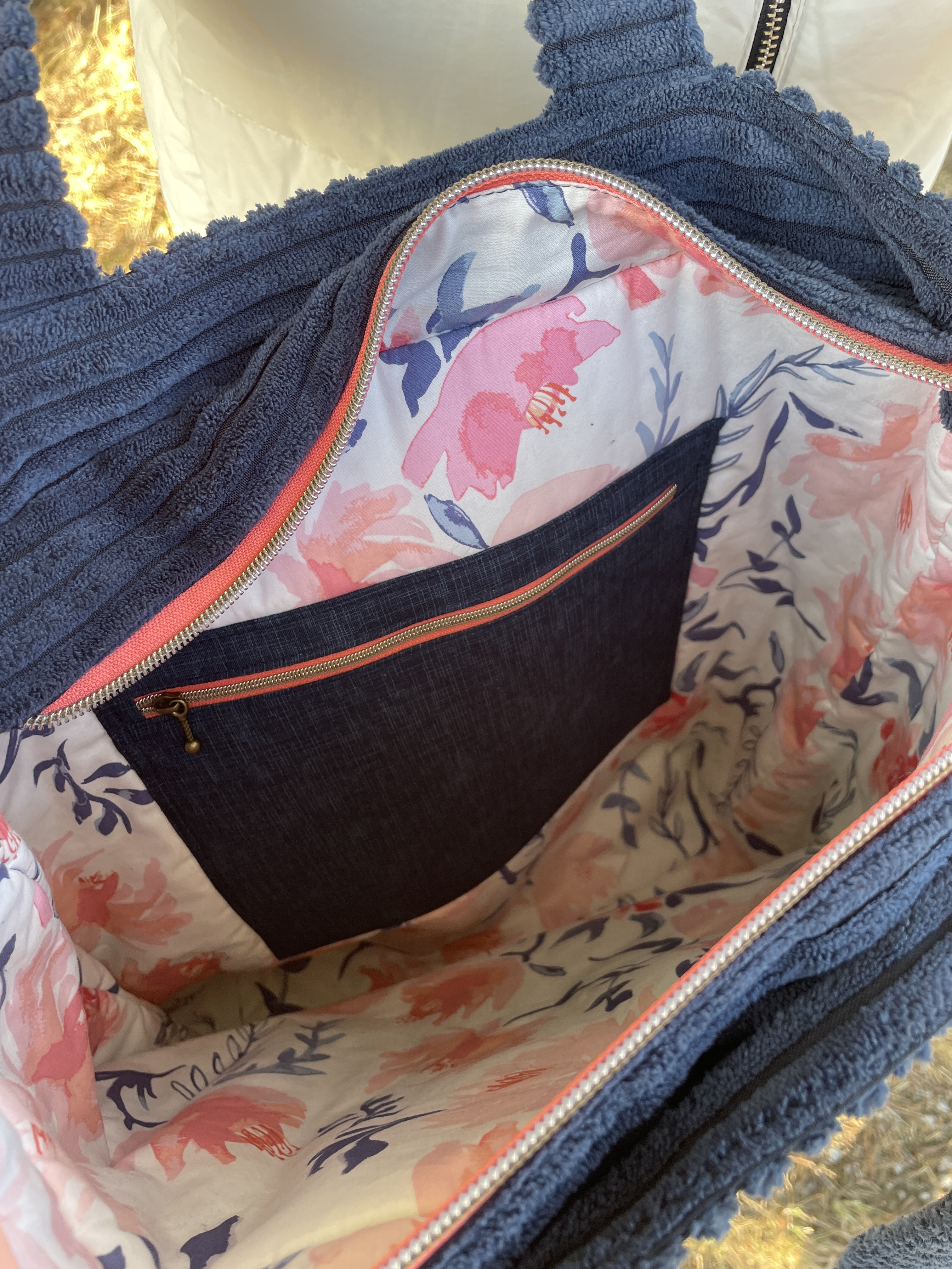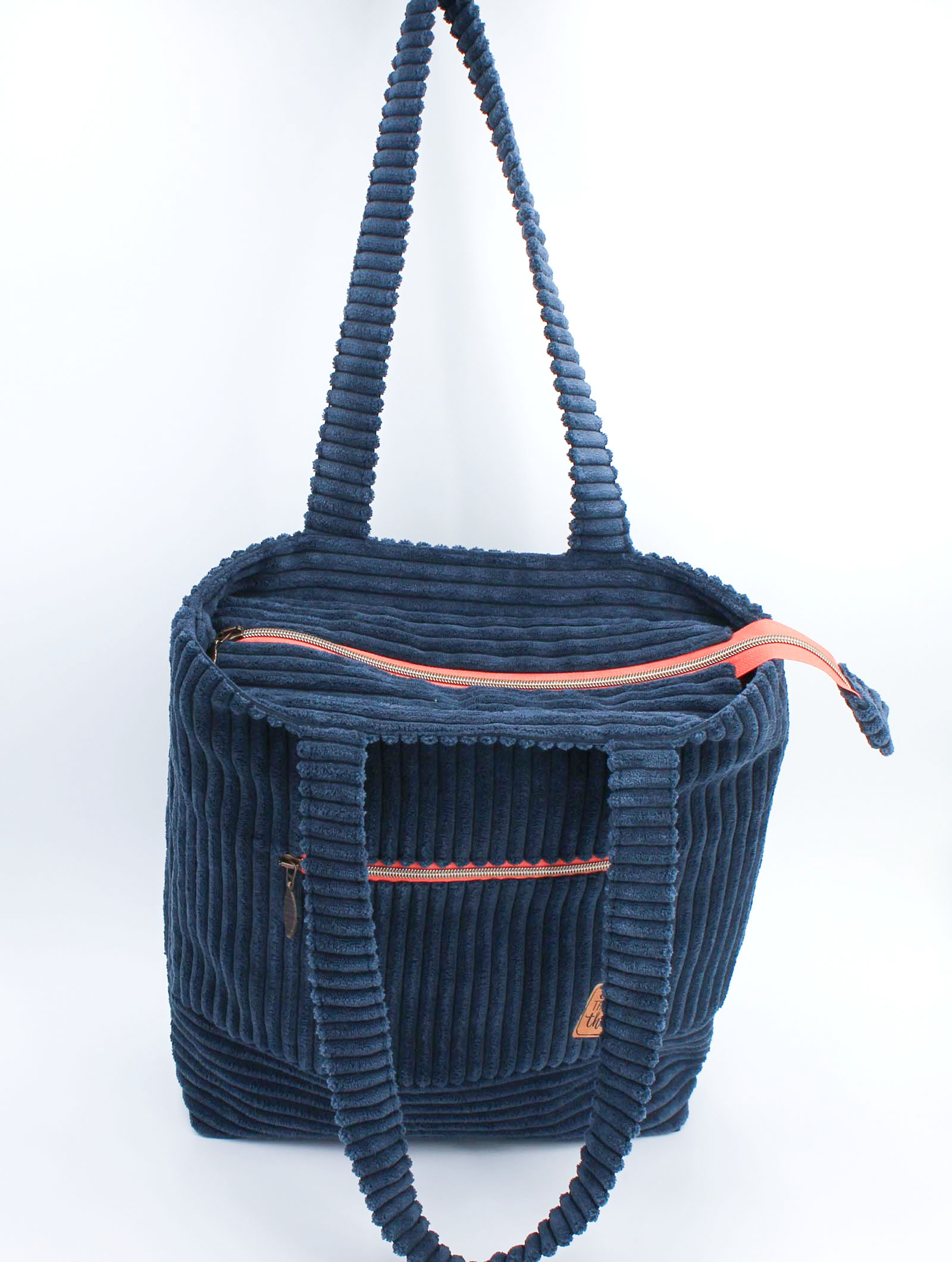 Trendiger geräumiger Shopper aus hochwertigem Polstercord, gefüttert mit US Designerbaumwollwebstoffen. Dieser Shopper wurde aus einem von der Haptik weichen aber sehr robustem Cord in Polsterqualität (Martindale > 90.000) genäht. Im Frontbereich befindet sich eine Außentaschen, die mit einem metallisierten Reißverschluss geschlossen ist. Innen befindet sich eine aufgesetzte Tasche. Die Tasche fasst sogar einen breiten Din A 4 Ordner und macht ihn so zu einem zuverlässigen Begleiter in der Uni, Schule und auf Arbeit. Der Shopper kann mit einem Reißverschluss geschlossen werden, siehe Fotos.